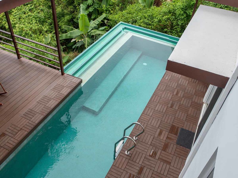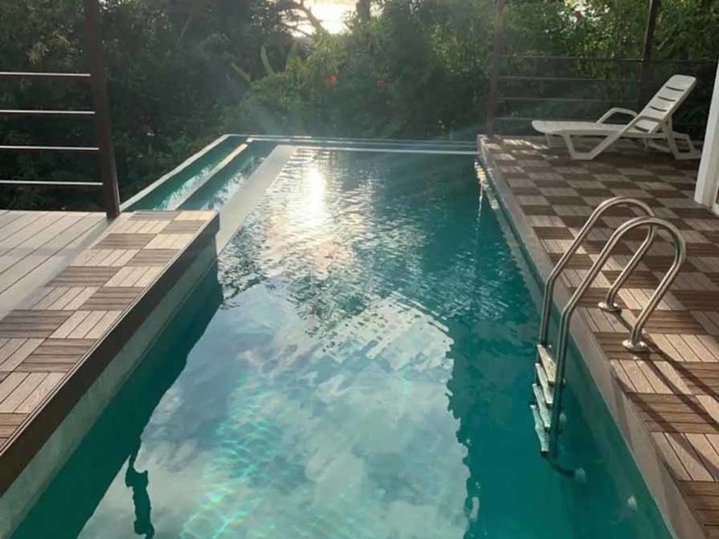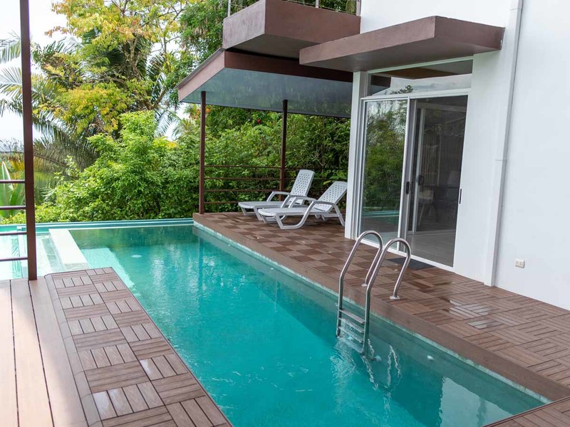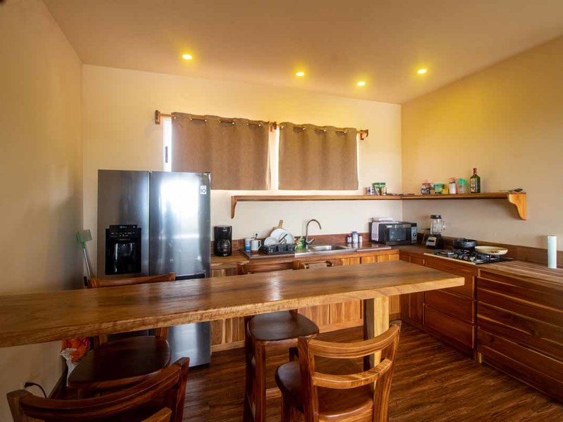 The existing four bedrooms are arranged in two adjacent buildings each with Teak-wood kitchens. This arrangement makes it perfect to accommodate either one large group or two smaller groups which makes your rental offering more flexible. The main residence of this combo consists of two luxury bedrooms upstairs, each with equally spectacular ocean views and en-suite bathrooms, a large living room downstairs with the same ocean view, and the kitchen with an island offering the best view of all looking out across the top of the infinity-edge pool.