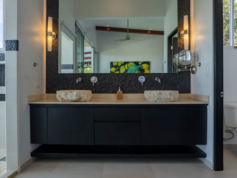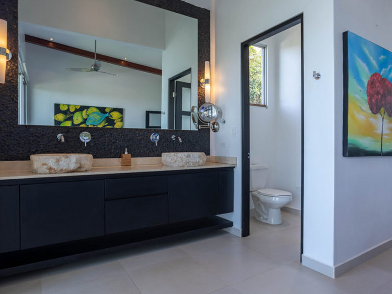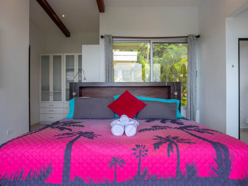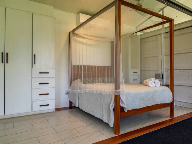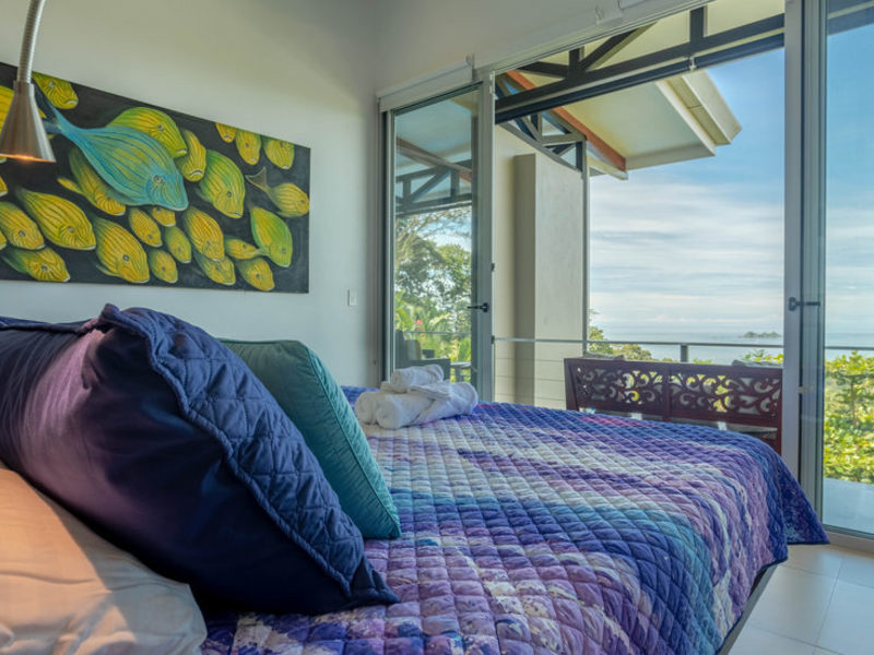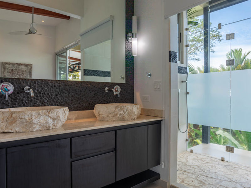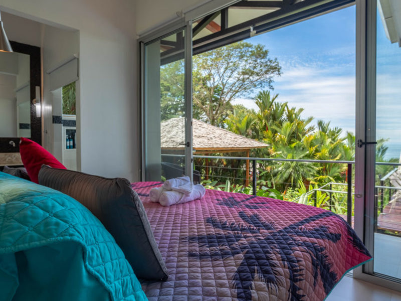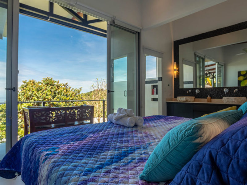 With four bedrooms and four and one-half bathrooms, eight can sleep comfortably. The main home has two spacious master bedroom suites with king beds, both with ocean and wildlife views from every vantage point, including their own private balcony space. Both master suites have luxury linens and towels, luxurious spa robes, private bathrooms with distinctive Bali-style stone vanities, and walk-in indoor/outdoor showers overlooking the ocean and jungle. The third bedroom has a jungle view with a queen size bed, private bathroom, Bali-style stone vanity, and walk-in shower. All bedrooms are air-conditioned for your supreme comfort.