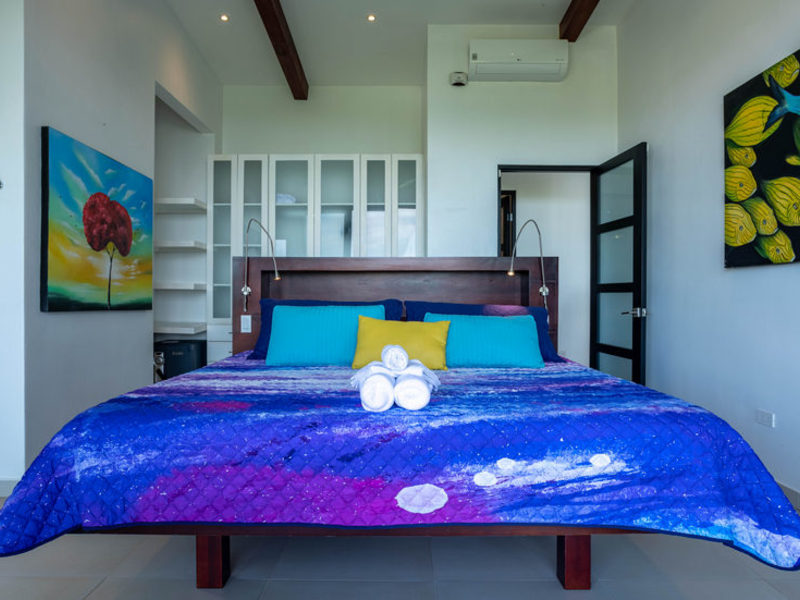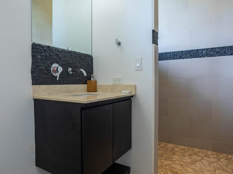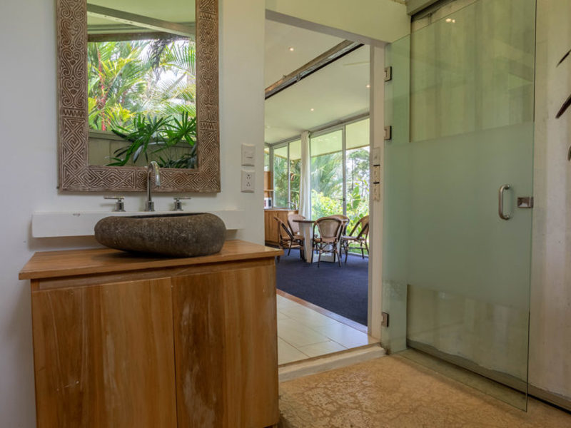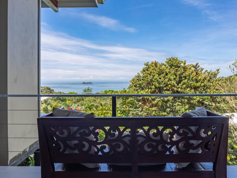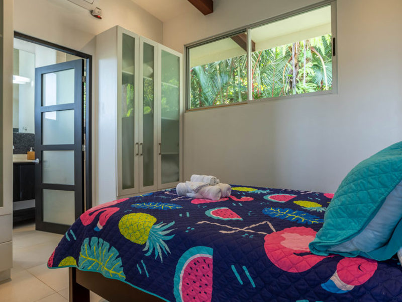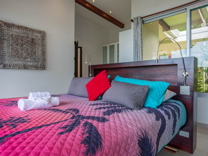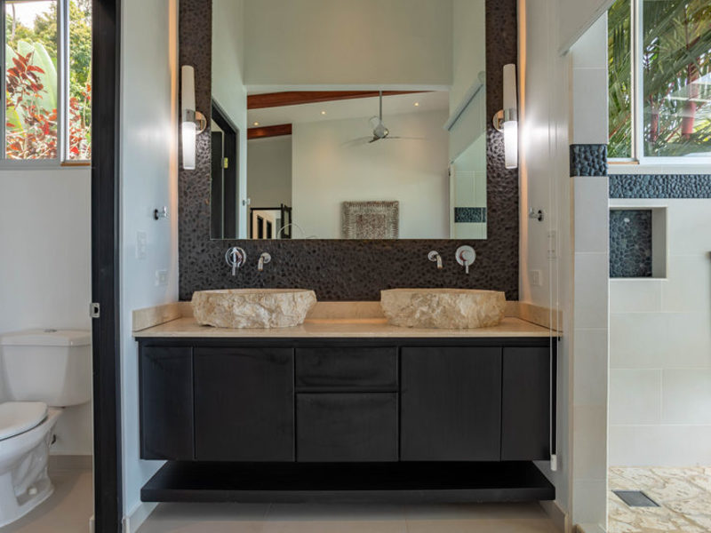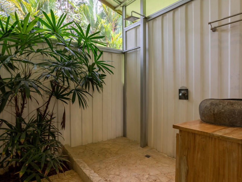 With four bedrooms and four and one-half bathrooms, eight can sleep comfortably. The main home has two spacious master bedroom suites with king beds, both with ocean and wildlife views from every vantage point, including their own private balcony space. Both master suites have luxury linens and towels, luxurious spa robes, private bathrooms with distinctive Bali-style stone vanities, and walk-in indoor/outdoor showers overlooking the ocean and jungle. The third bedroom has a jungle view with a queen size bed, private bathroom, Bali-style stone vanity, and walk-in shower. All bedrooms are air-conditioned for your supreme comfort.