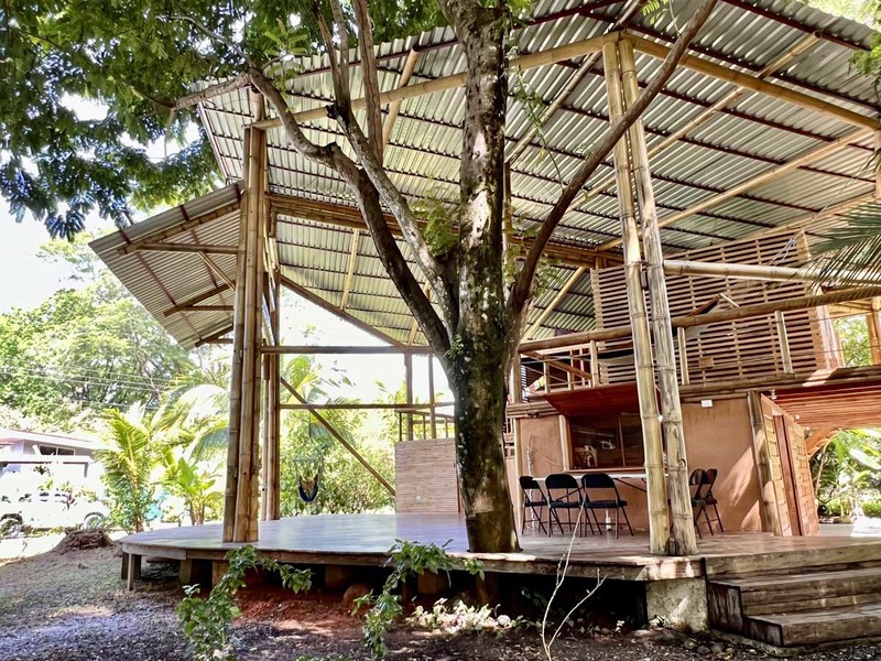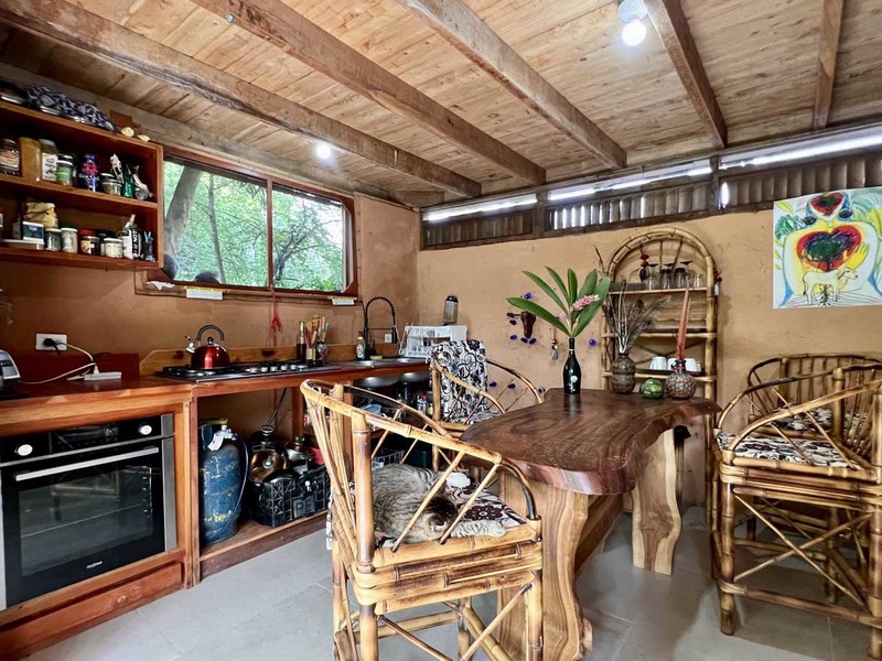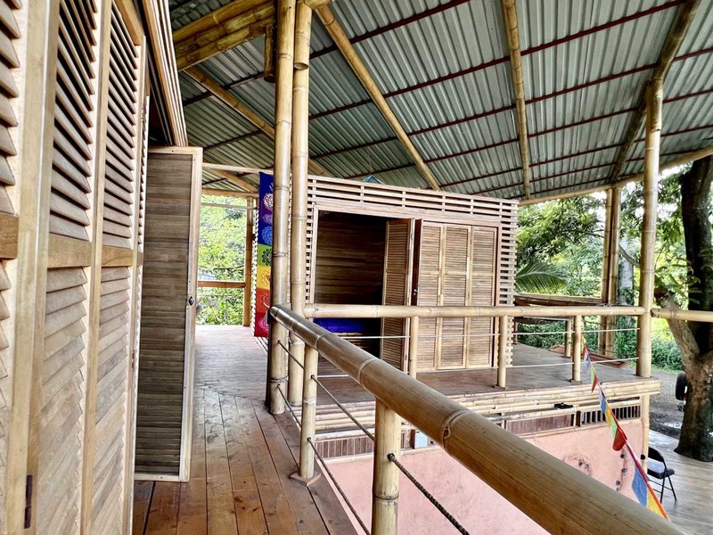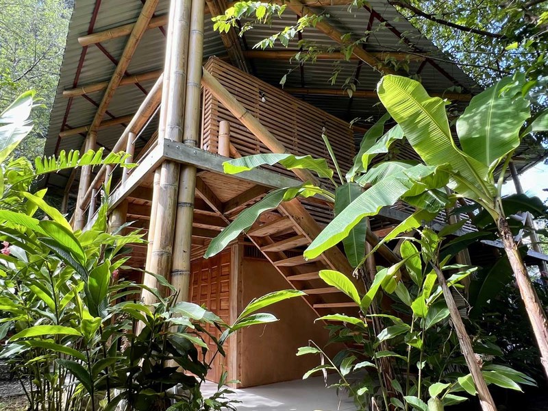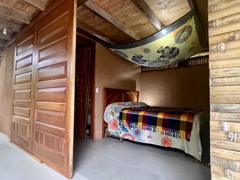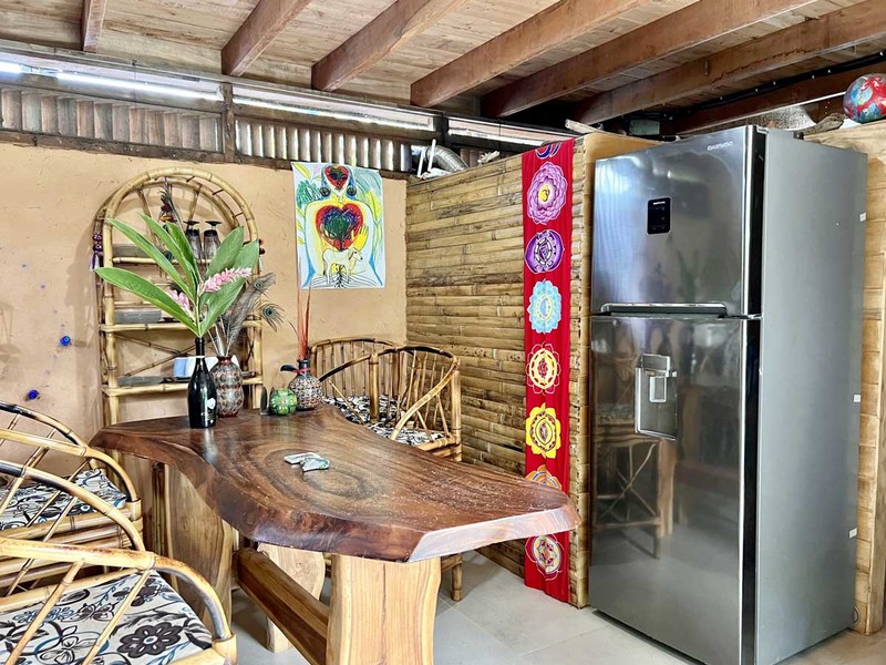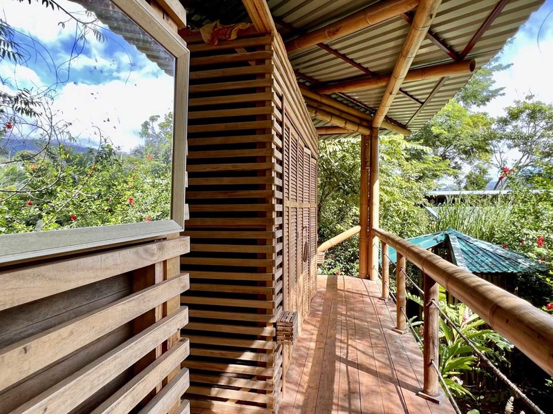 One of the most impressive features of the diamond-shaped house is the three charming bedrooms that are entirely made of wood, featuring walls of wooden slats and mosquito netting to maximize comfort. The folding doors open up to the deck, offering breathtaking views of Uvita's majestic mountains. The design of these rooms is thoughtful, providing natural light, and a serene environment that is perfect for relaxation.