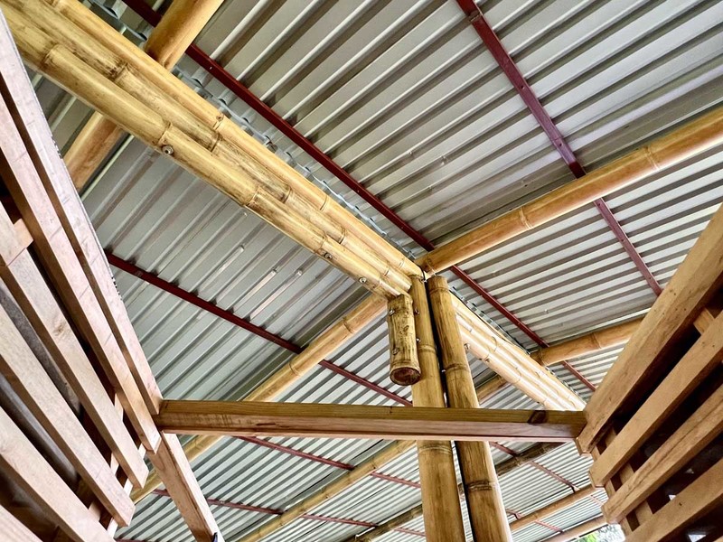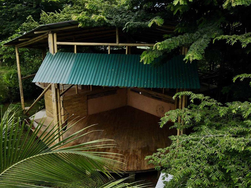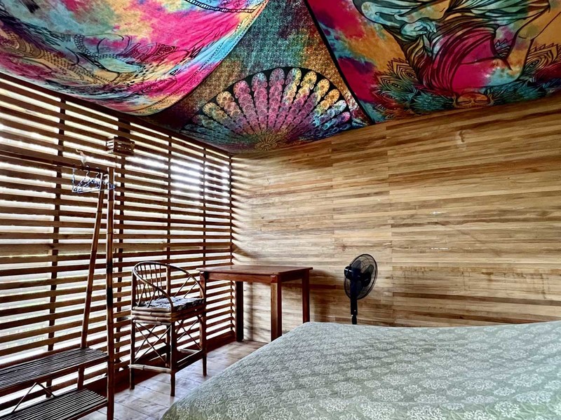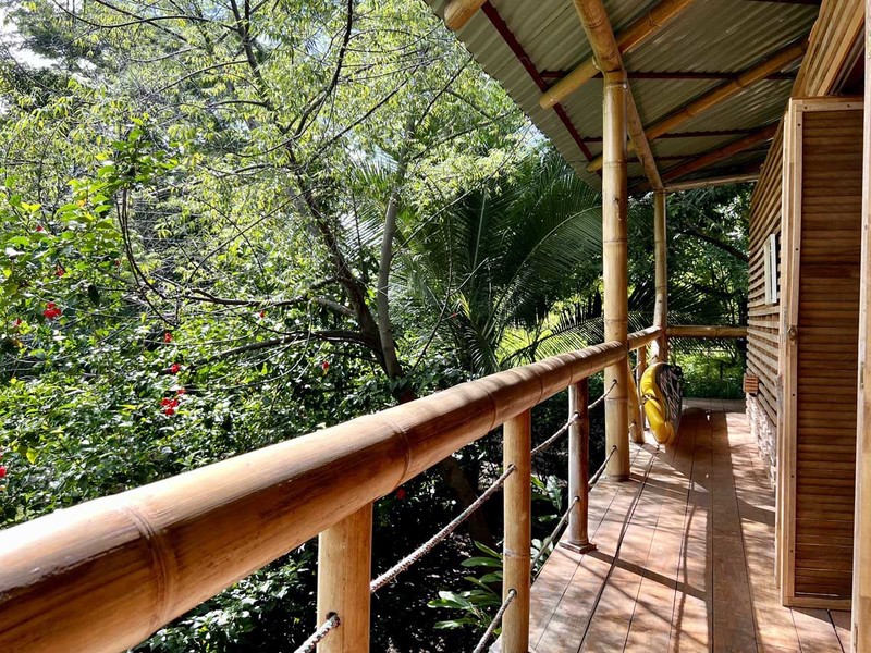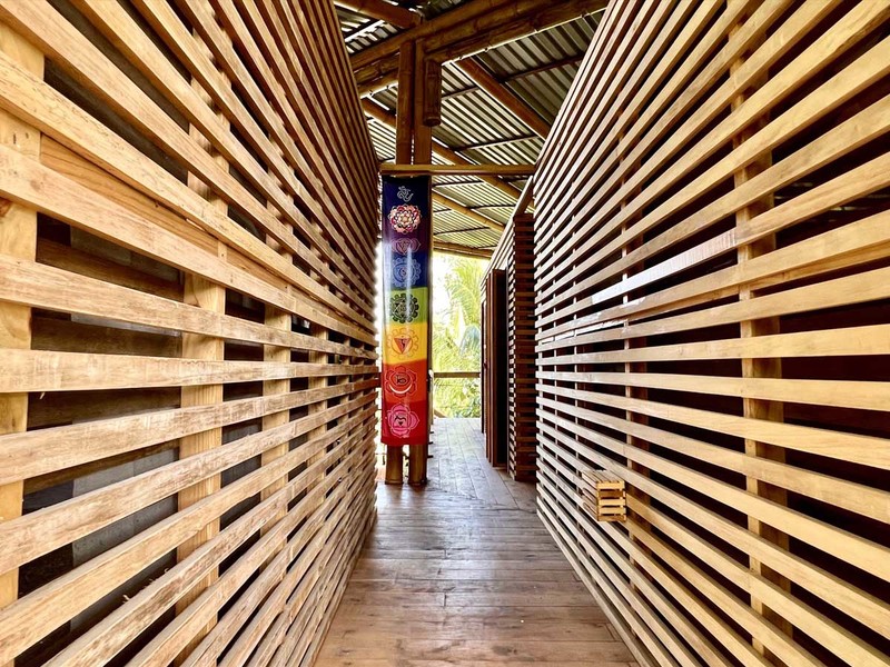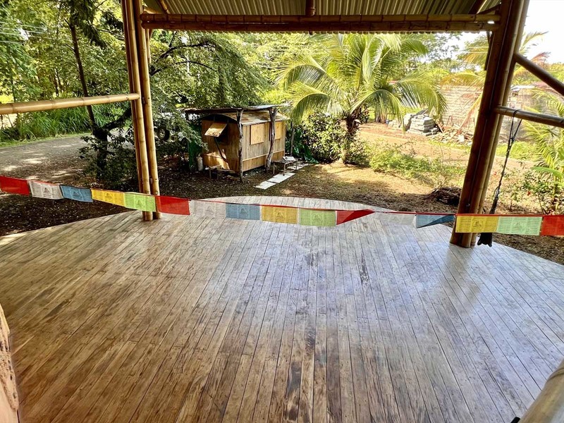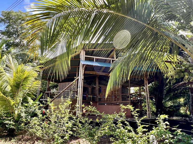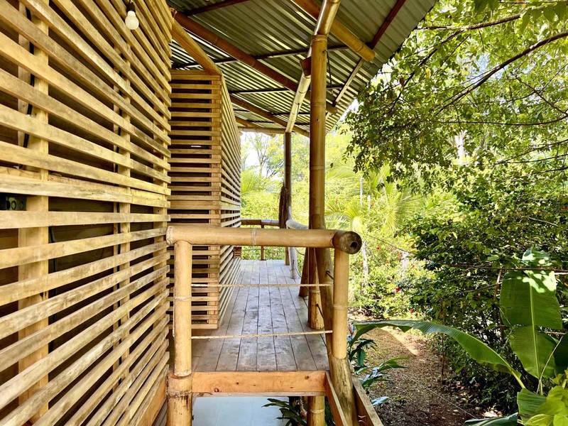 One of the most impressive features of the diamond-shaped house is the three charming bedrooms that are entirely made of wood, featuring walls of wooden slats and mosquito netting to maximize comfort. The folding doors open up to the deck, offering breathtaking views of Uvita's majestic mountains. The design of these rooms is thoughtful, providing natural light, and a serene environment that is perfect for relaxation.