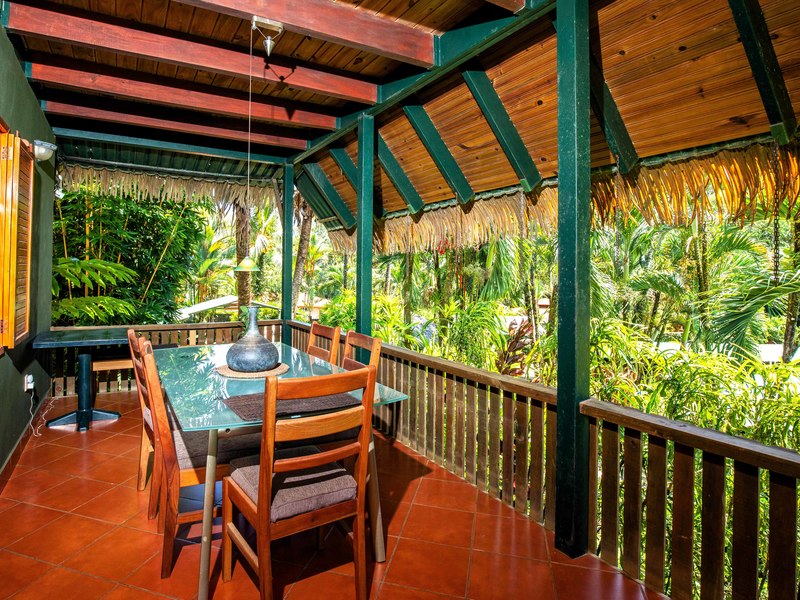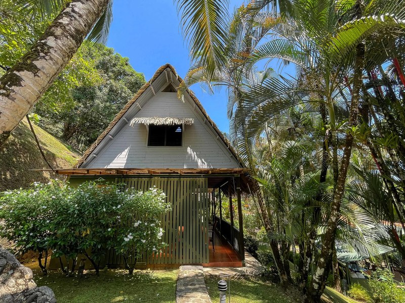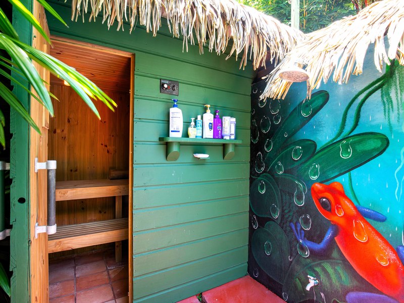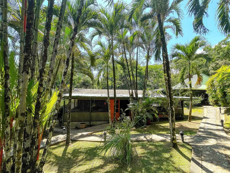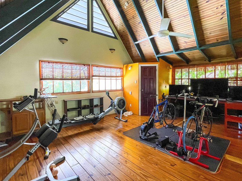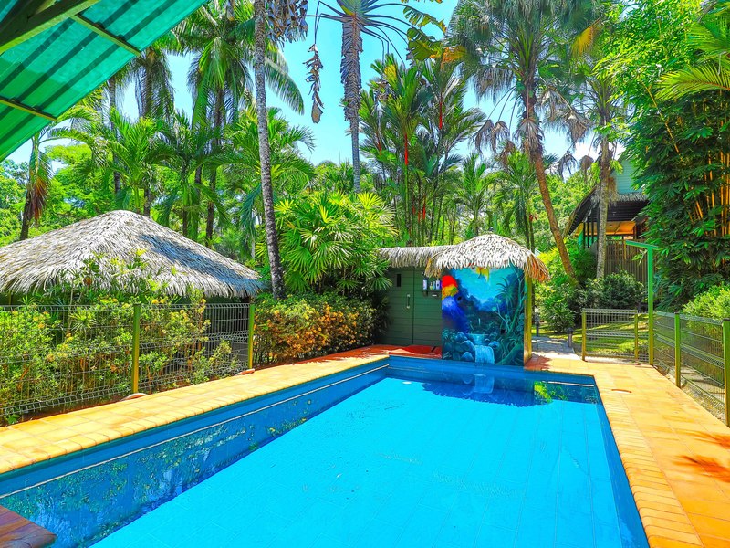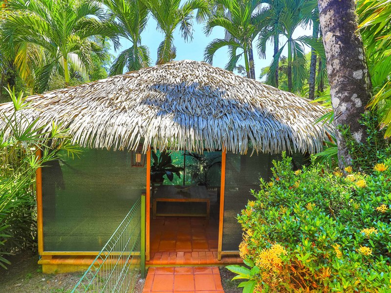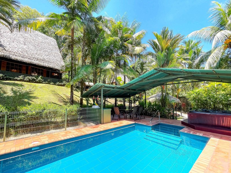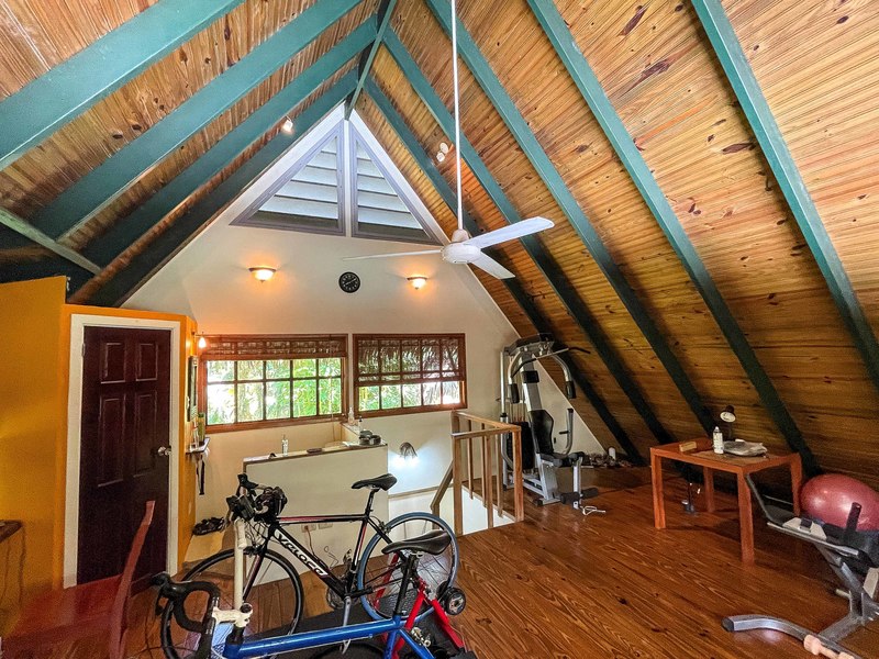 The verandas the timber construction reaching up, to the ceiling and the charming A-frame design all contribute to creating a rustic and romantic atmosphere. These cabins can be utilized as guest suites. Rented out for long stays. Adjacent to the residence there is a covered carport that can accommodate up to five cars ensuring safe, secure, and dry access. To provide opportunities for relaxation there is a resort-style pool with a covered deck area and a jacuzzi. Additionally, you can enjoy the / sauna or take advantage of various lounges, umbrellas, and BBQ areas scattered throughout the property. For those seeking tranquility amidst nature's bounty, there is a hammock hut surrounded by plants fruit trees like pineapples and pepper plants along with the sounds of the jungle. The laid-back atmosphere is further enhanced by murals depicting local flora and fauna. Fitness enthusiasts will appreciate having access to a covered cardio gym attached to the residence that includes bikes