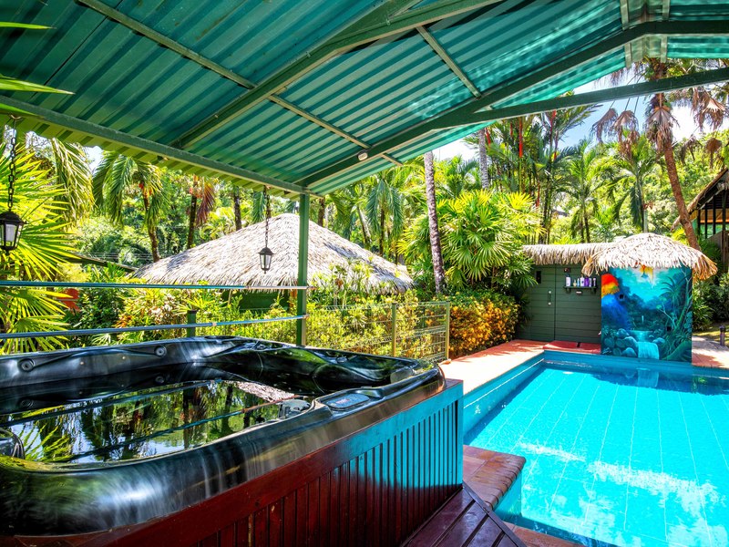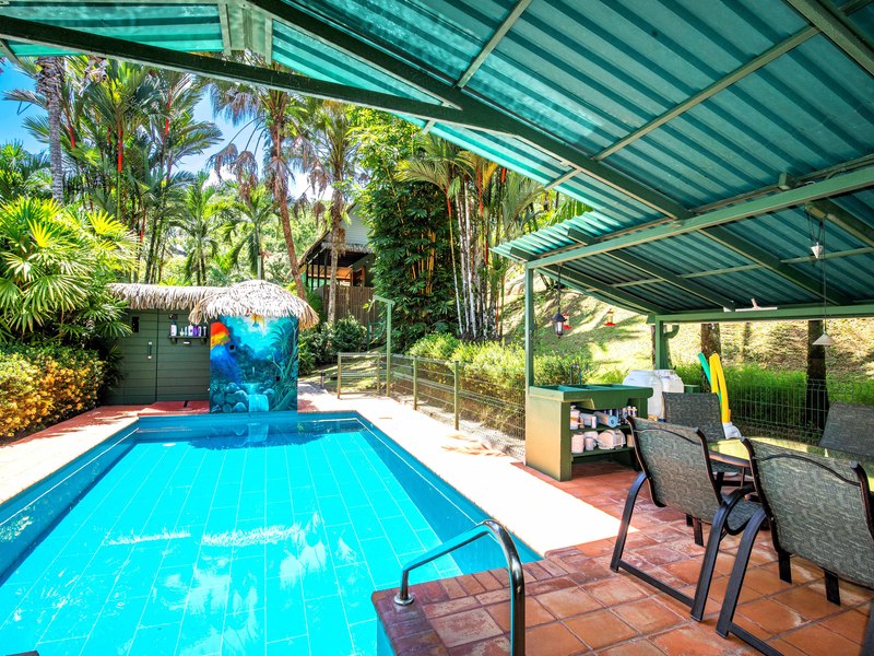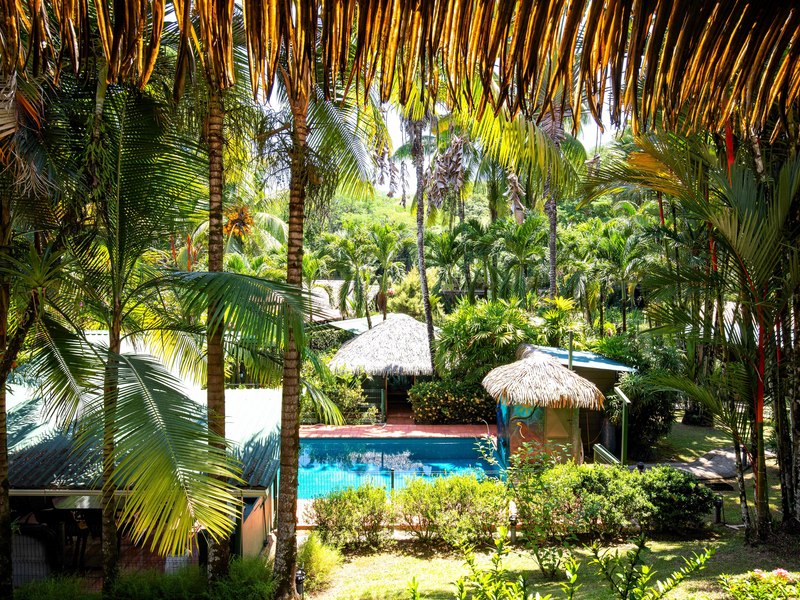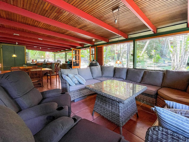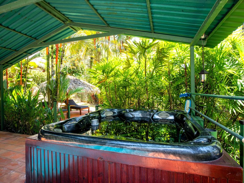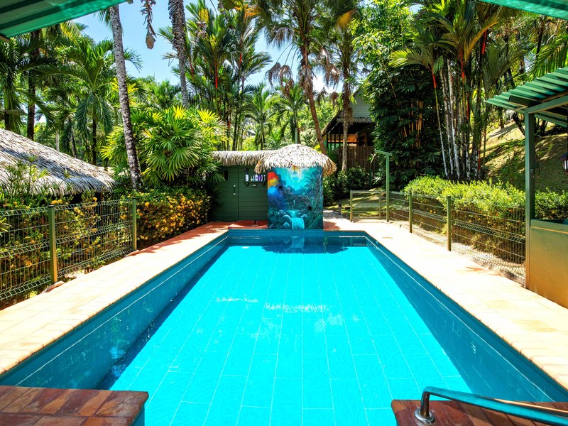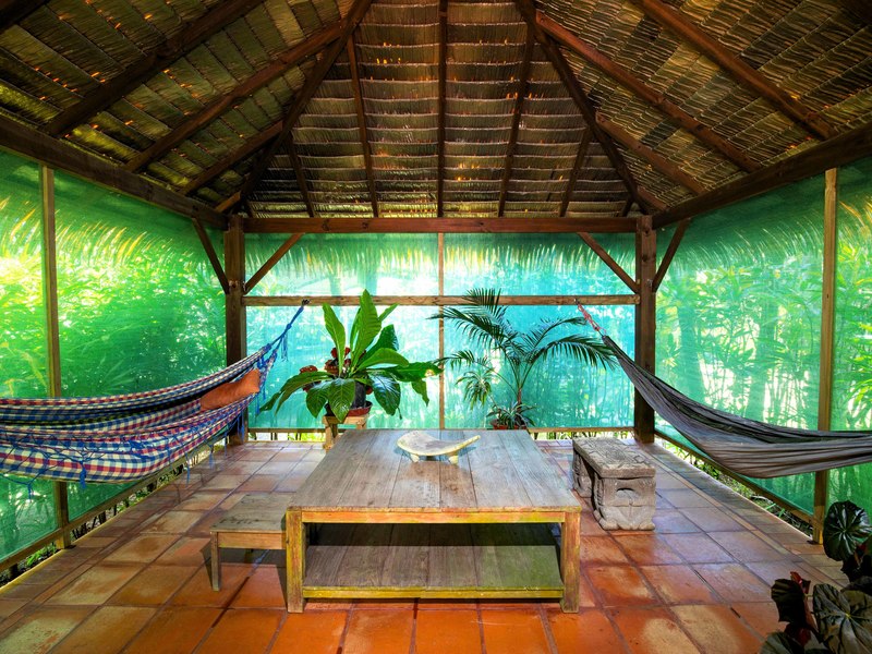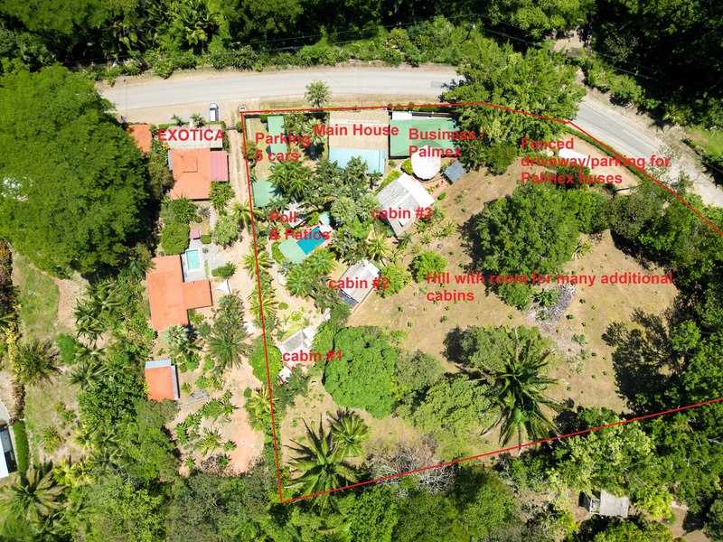 The verandas the timber construction reaching up, to the ceiling and the charming A-frame design all contribute to creating a rustic and romantic atmosphere. These cabins can be utilized as guest suites. Rented out for long stays. Adjacent to the residence there is a covered carport that can accommodate up to five cars ensuring safe, secure, and dry access. To provide opportunities for relaxation there is a resort-style pool with a covered deck area and a jacuzzi. Additionally, you can enjoy the / sauna or take advantage of various lounges, umbrellas, and BBQ areas scattered throughout the property. For those seeking tranquility amidst nature's bounty, there is a hammock hut surrounded by plants fruit trees like pineapples and pepper plants along with the sounds of the jungle. The laid-back atmosphere is further enhanced by murals depicting local flora and fauna. Fitness enthusiasts will appreciate having access to a covered cardio gym attached to the residence that includes bikes