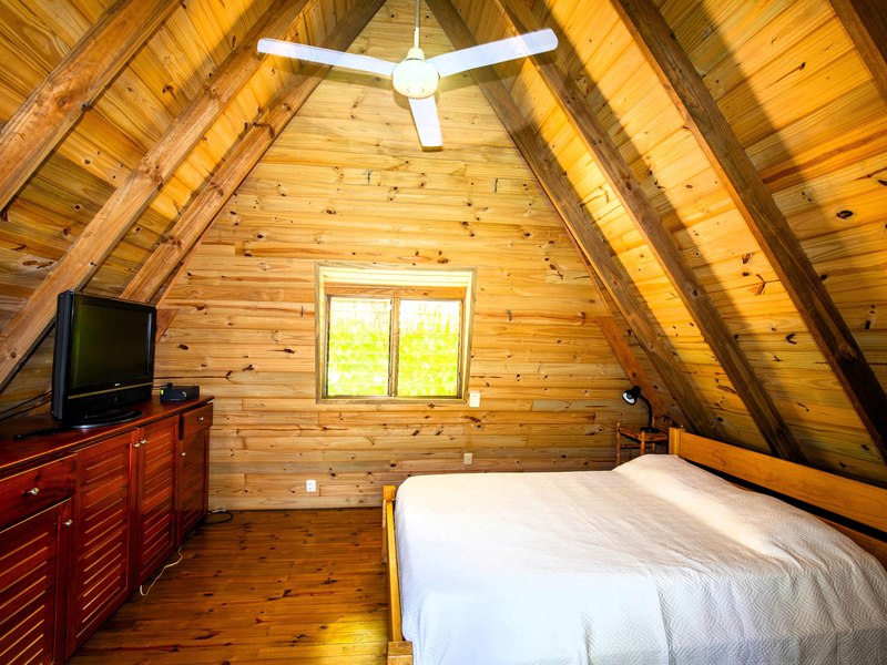 Let's talk about the residence and other structures now. The residence exudes warmth with its timber construction and matching floor tiles. It boasts of a kitchen with a counter and cupboard space. The living area is incredibly spacious with a dining table and an inviting wrap-around couch along with seating options—all thanks to the open-concept design that enhances the feeling of spaciousness. Moving on to the master bedroom—it's equally impressive! It combines both sleeping quarters and a TV lounge/library area seamlessly. Adjacent to the master bedroom is a home office for your convenience.