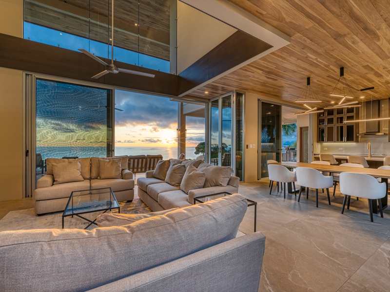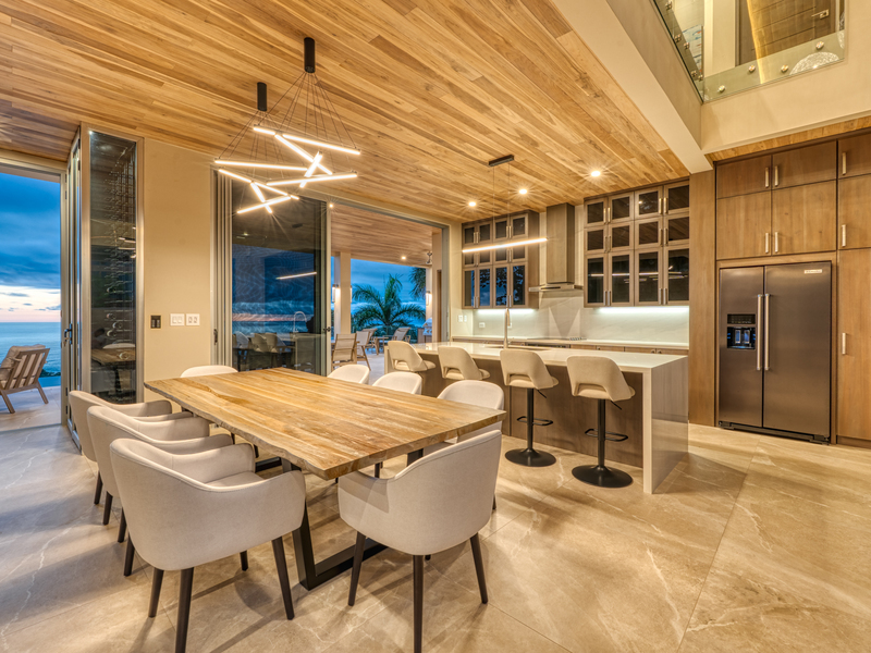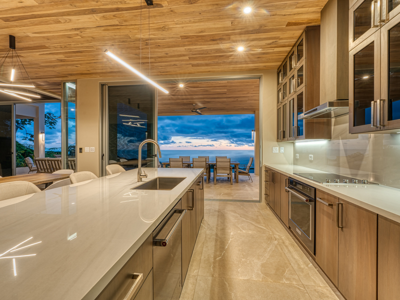 Abundant natural light fills the interior through extensive glass facades and high-end sliding glass systems. The kitchen, designed for both function and panoramic views, becomes a focal point with its island overlooking the vast ocean.