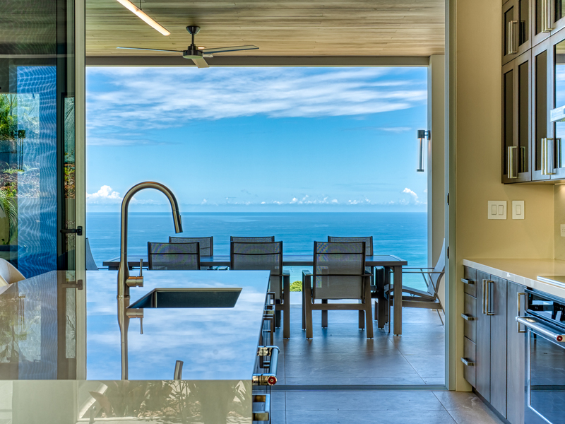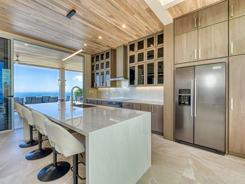 Paradise Homes, serving as both builder and architect, executed the design seamlessly, making adjustments fluid throughout construction. The master bedroom opens up to an awe-inspiring view of the vast Pacific Ocean at sunset, maintaining the home's sense of openness.