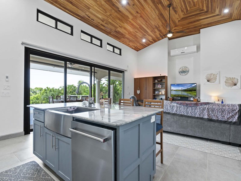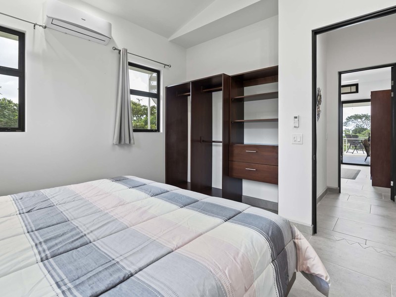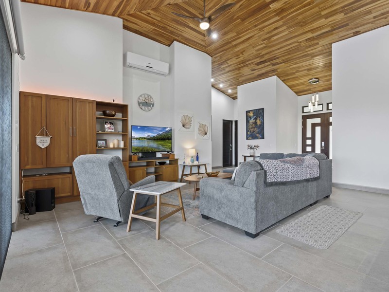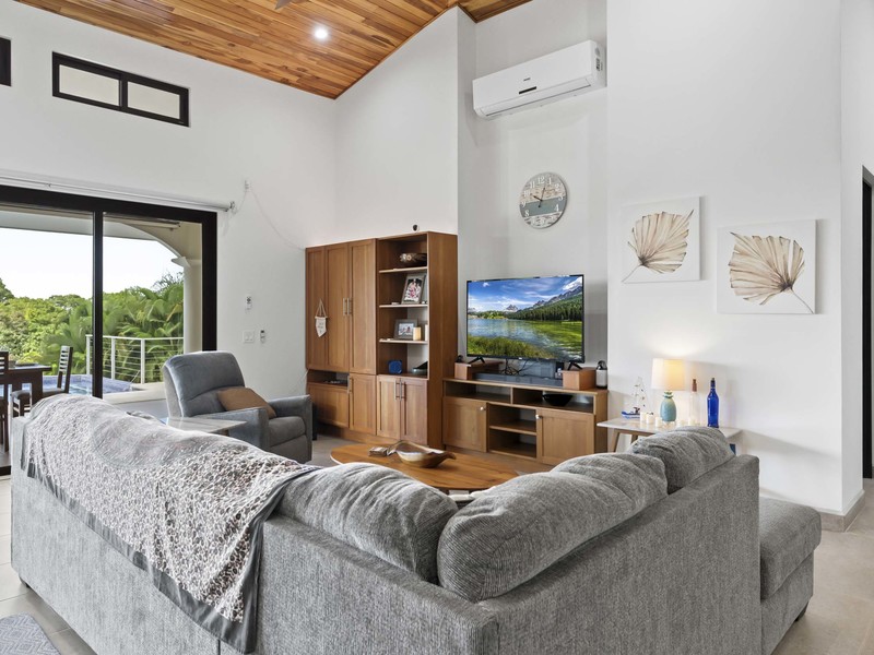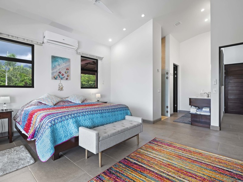 Now let's talk about the home itself. As soon as you step inside you'll notice the construction quality and high-end finishes throughout. The spaciousness is enhanced by the ceilings made of teak wood, which adds a touch of Costa Rican elegance to the interior. With 4 bedrooms each with its own en suite bathroom for utmost privacy, this home ensures comfort for both you and your guests. Additionally, there are two bathrooms located. One near the swimming pool and another inside the house. Catering to your guest's needs. To ensure year-round comfort during both nights and breaks, from exploration days all bedrooms and common areas are equipped with air conditioning.