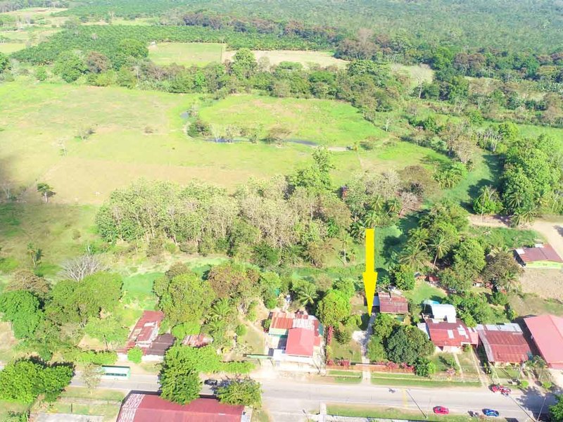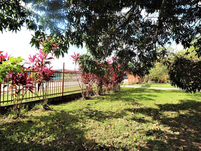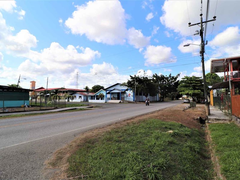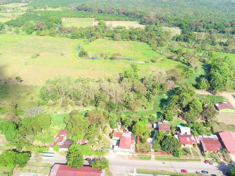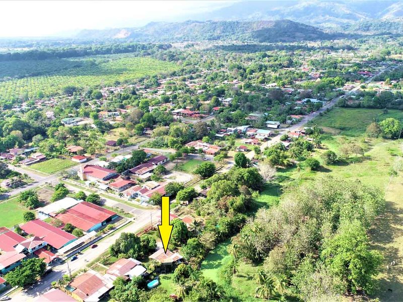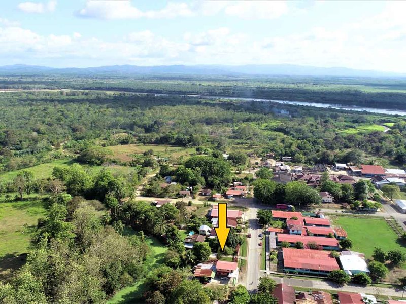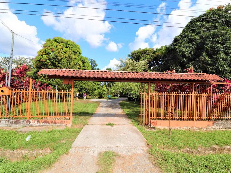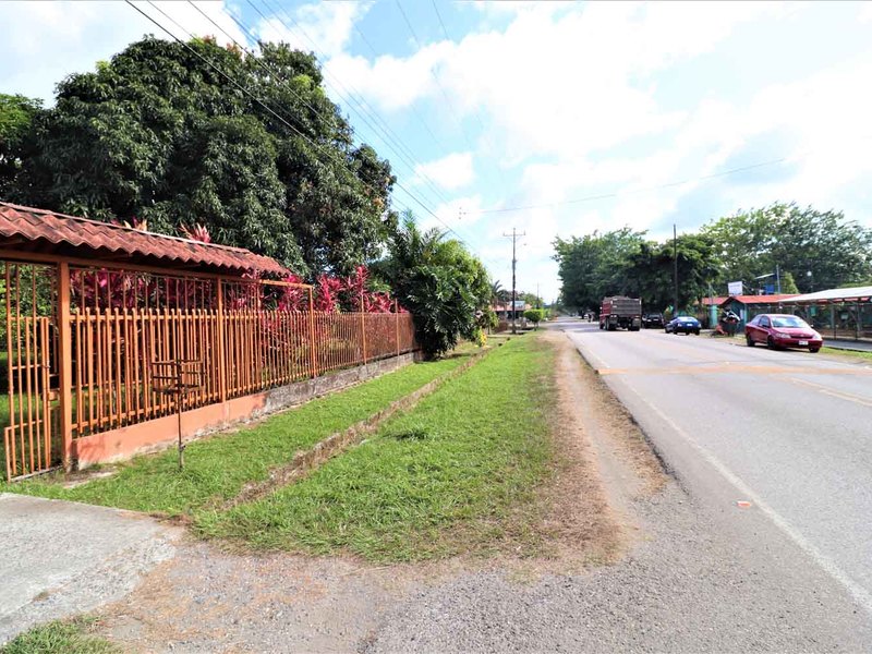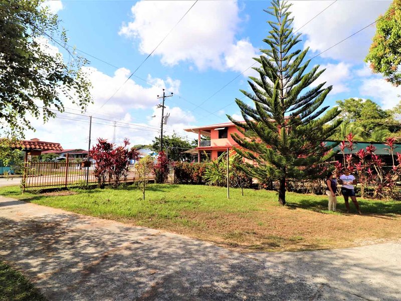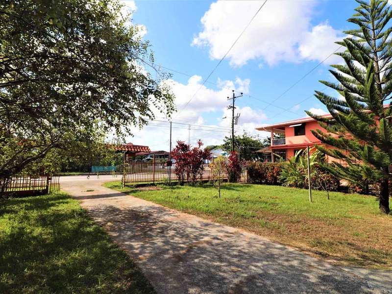 It is located in front of a paved street in the center of Ciudad Cortes, right in front of the community school. It is completely fenced and has a huge electric gate.