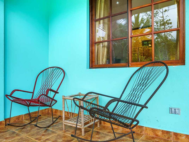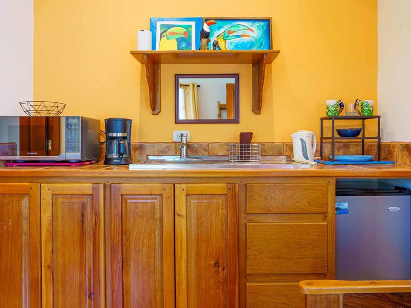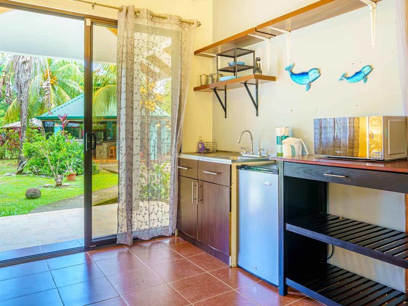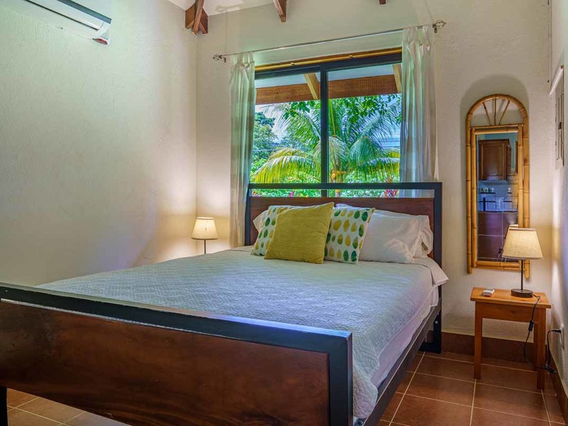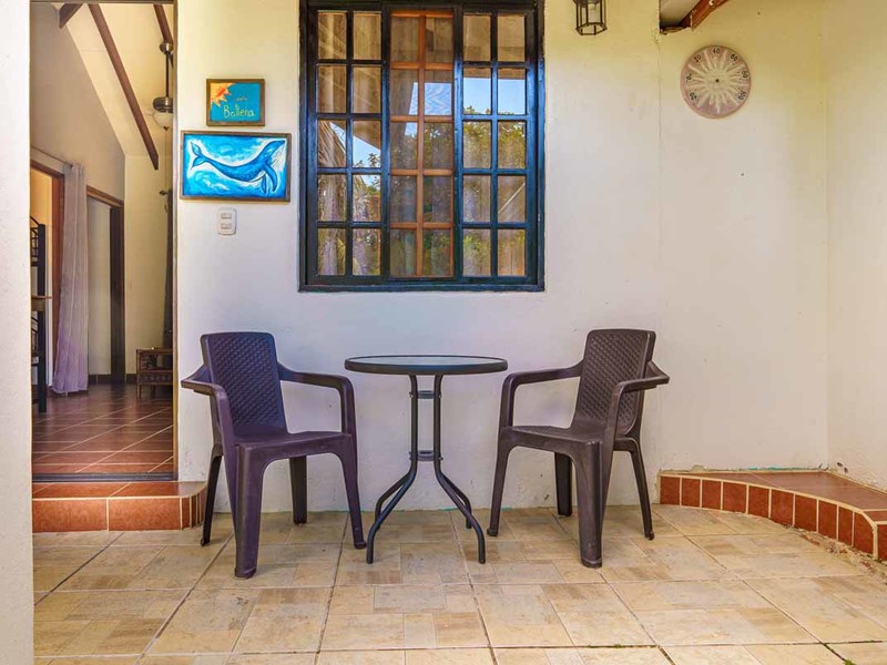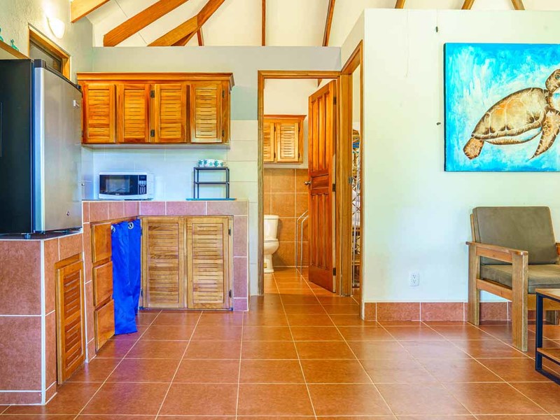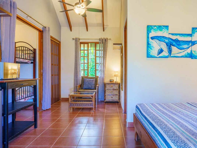 Enter the main villa, a spacious one-bedroom retreat with an open-concept design, kitchenette, and modern bathroom. Natural light cascades through the villa's numerous windows, adding a bright and refreshing touch to its serene ambiance. Step out onto the large, private patio, and immerse yourself in the calming sounds of the surrounding nature. This villa is perfect for solo travelers, couples, or small families looking for a getaway.