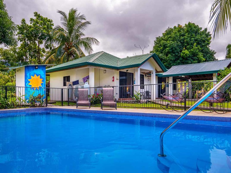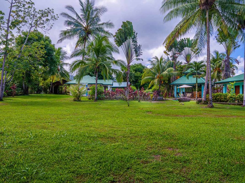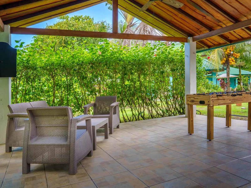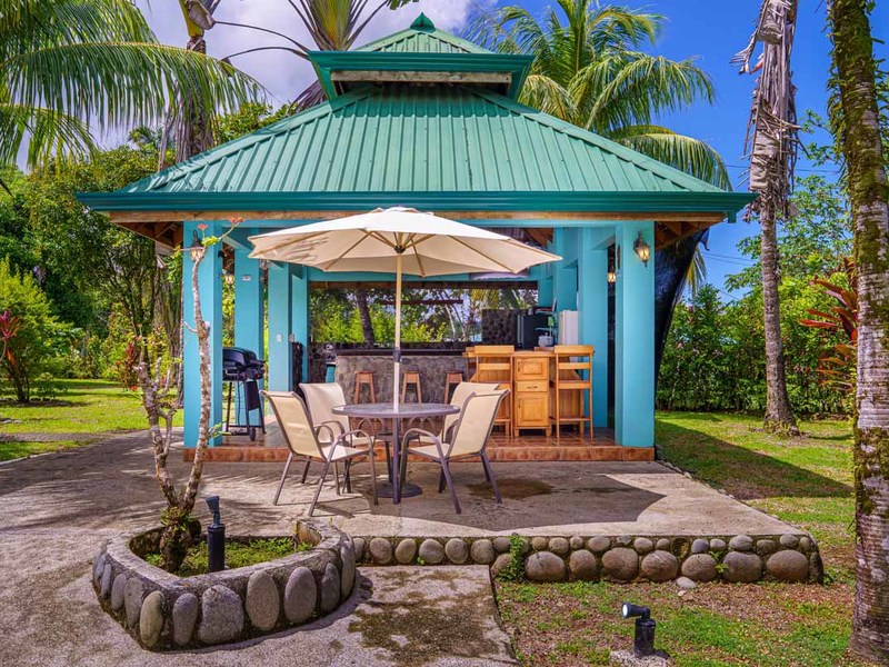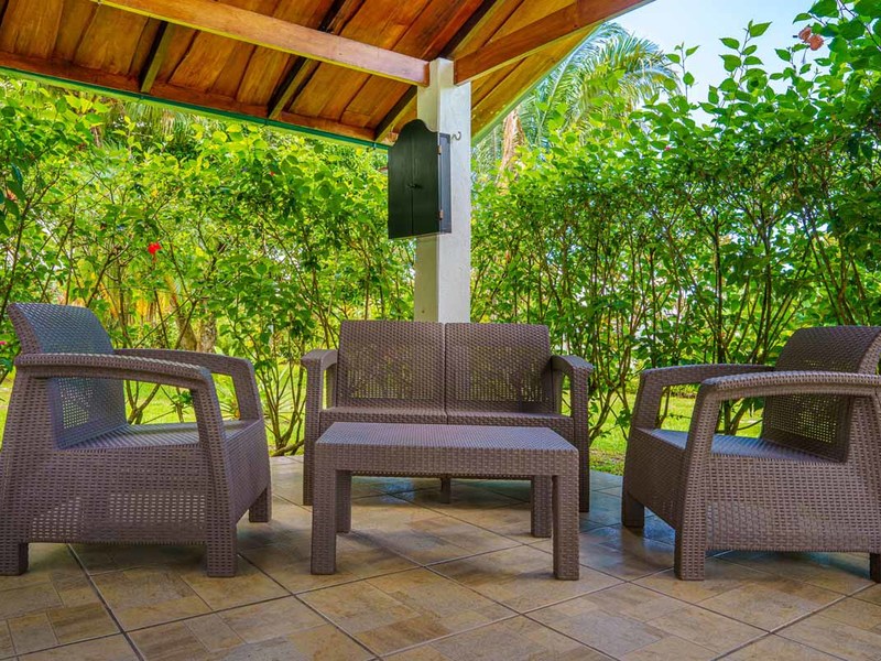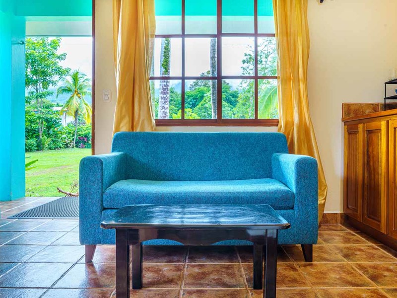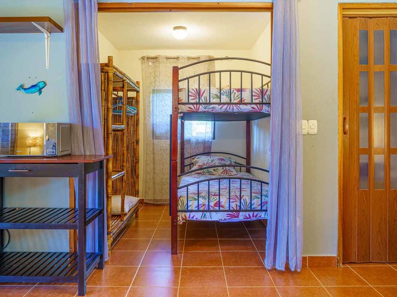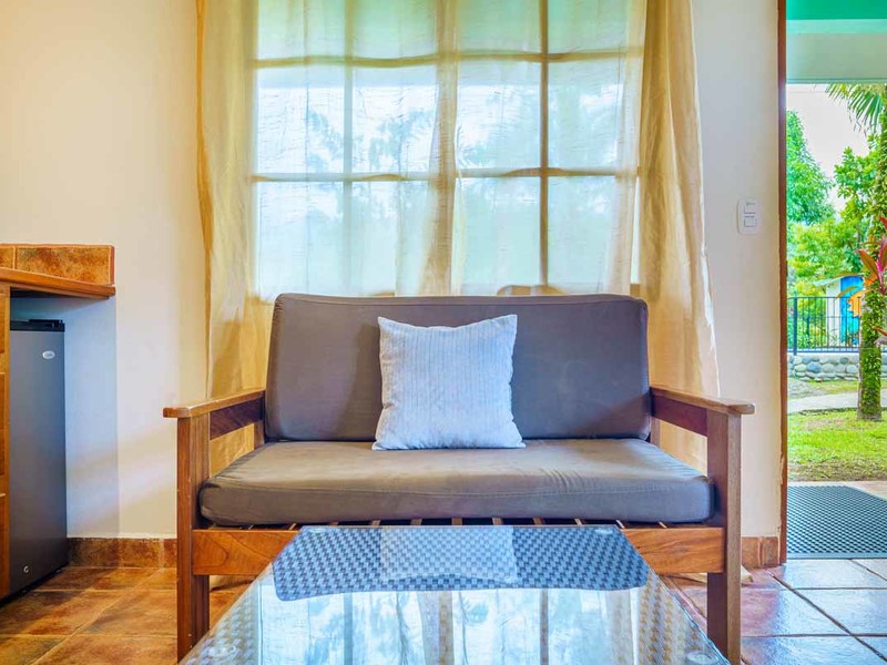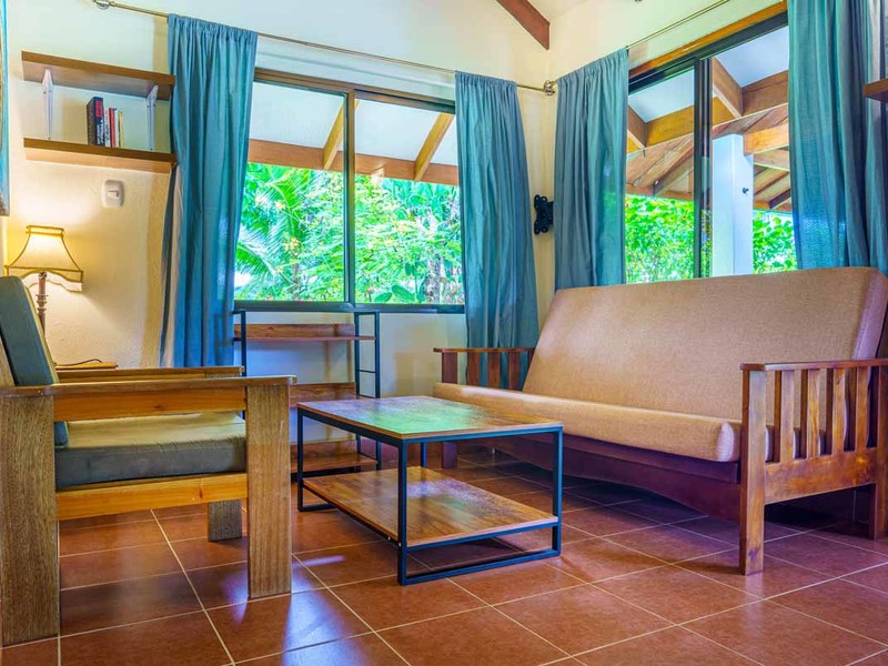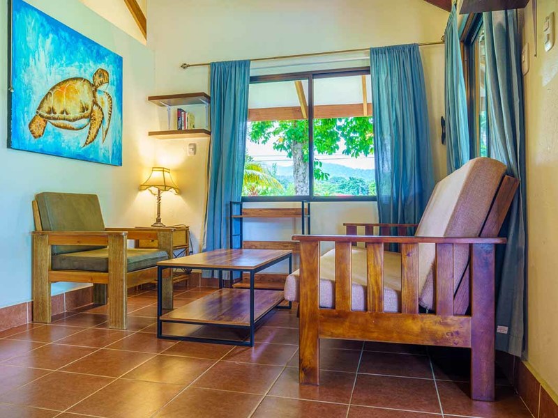 The second villa is a two-bedroom gem, which can easily be converted to a three-bedroom with the addition of bunk beds. Alongside the comfortable bedrooms, this villa features a cozy sitting space and a fully-equipped kitchenette. Experience blissful serenity as you enjoy your morning coffee on the covered terrace and soak up the breathtaking views of the lush gardens. This villa is perfect for larger families or groups of friends who want to vacation together.