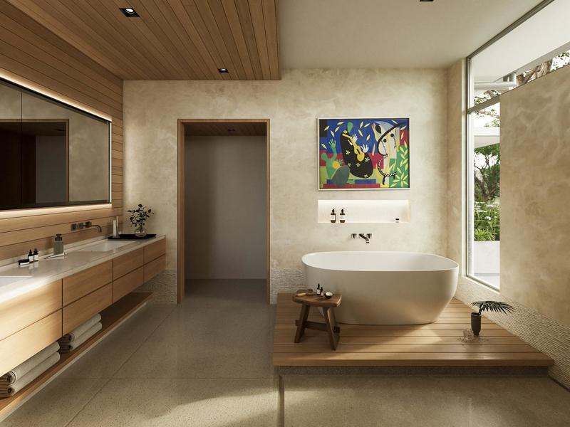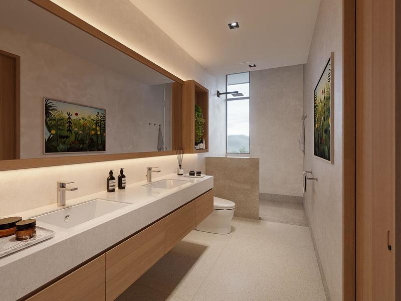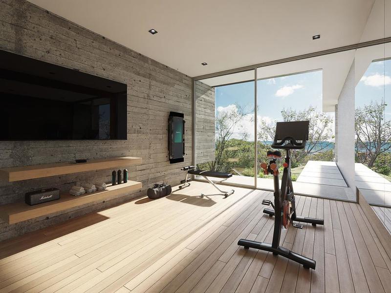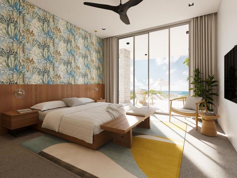 The home is centered on a breathtaking great room that soars 2 stories high. This light-filled, airy room is open-concept at its best: a state-of-the-art kitchen, huge walk-in pantry, a dining table that seats 10 persons comfortably, and a spacious lounge area all blend together seamlessly thanks to the natural textures and neutral colors of organic modern design and décor. One whole wall of this space is comprised of movable glass doors that slide completely out of the way, drawing you outside to the covered terrace and the panoramic view of the ocean. Down a couple of steps and you are facing a long, cool, infinity-edge pool. To your right is a fully equipped outdoor kitchen and grilling area, and to your left is a sundeck with chaise lounges for relaxing and napping.