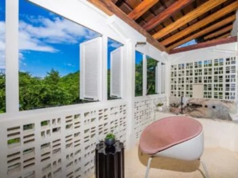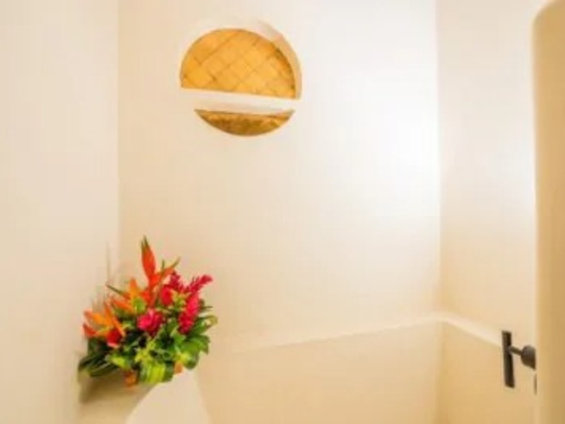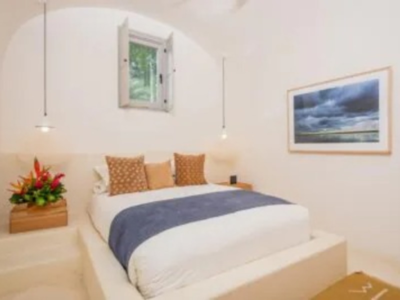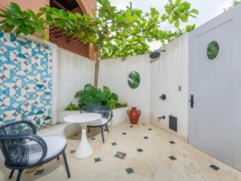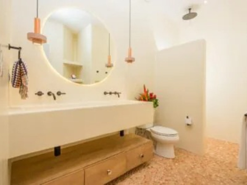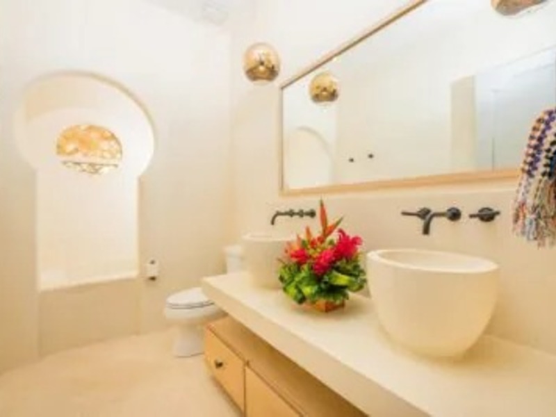 A special highlight is undoubtedly the lavender staircase, skillfully hand-painted with micro cement. Its unique shape and design are sure to leave a lasting impression on guests. As you ascend to the level you will discover two master bedrooms facing each other each boasting its own ensuite bathroom and a private coffee area nestled in between. The top floor showcases soaring ceilings while each master bedroom boasts features such, as built-in furniture pieces, luxurious stone rain showers, and even an outdoor stone tub offering mesmerizing views of both sky and ocean.