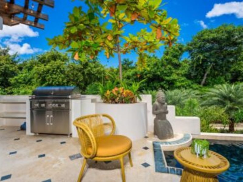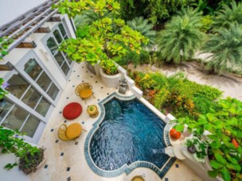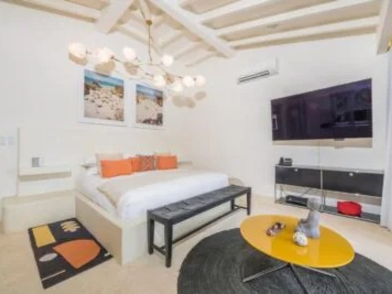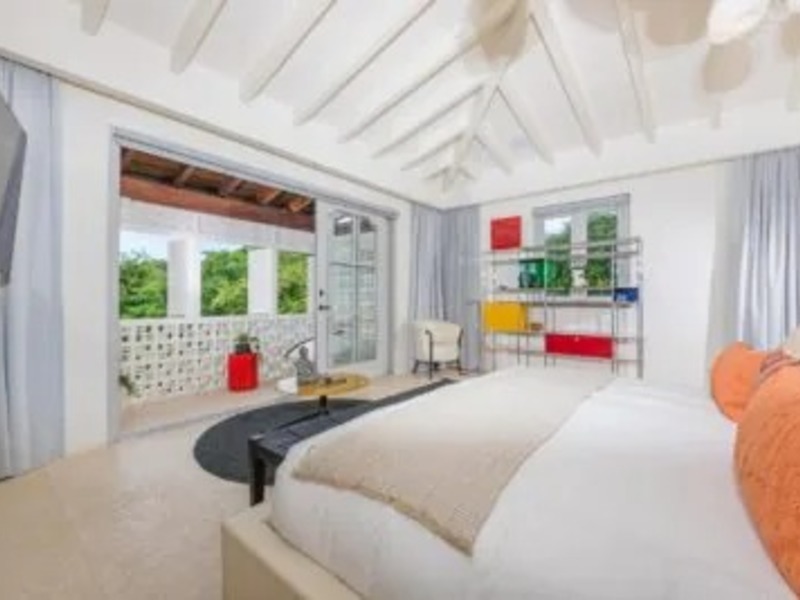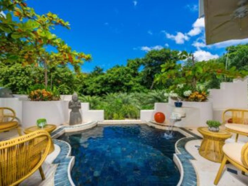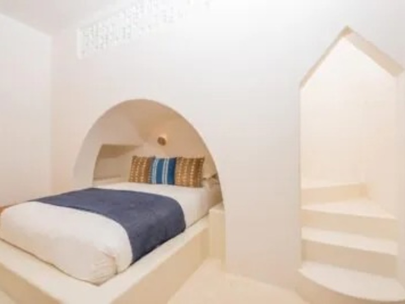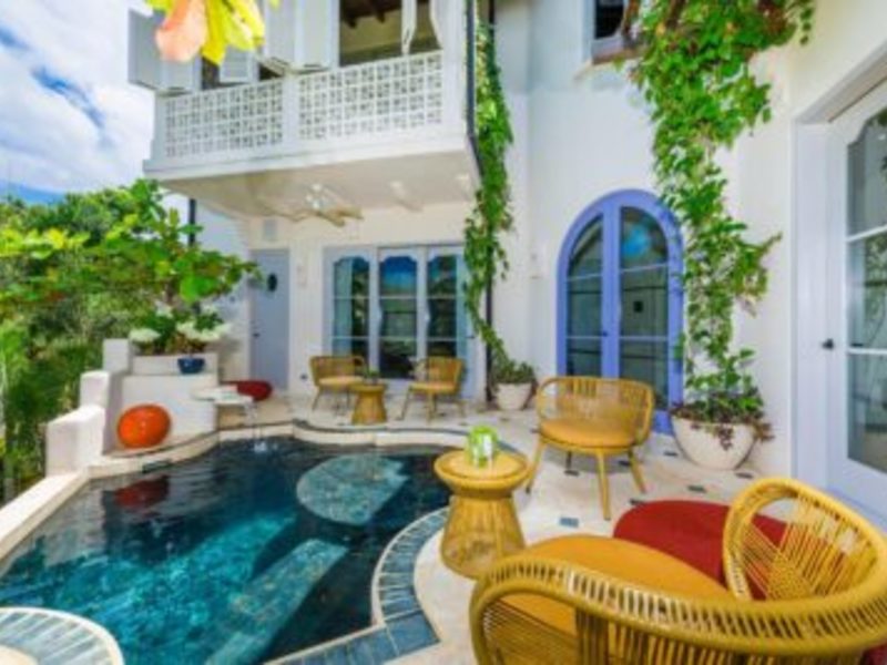 A special highlight is undoubtedly the lavender staircase, skillfully hand-painted with micro cement. Its unique shape and design are sure to leave a lasting impression on guests. As you ascend to the level you will discover two master bedrooms facing each other each boasting its own ensuite bathroom and a private coffee area nestled in between. The top floor showcases soaring ceilings while each master bedroom boasts features such, as built-in furniture pieces, luxurious stone rain showers, and even an outdoor stone tub offering mesmerizing views of both sky and ocean.