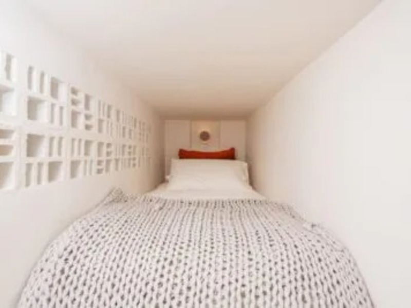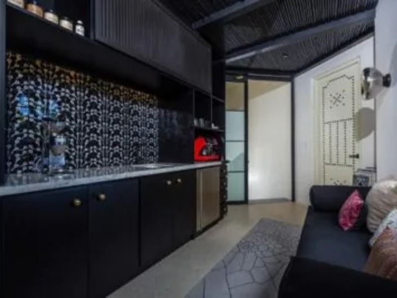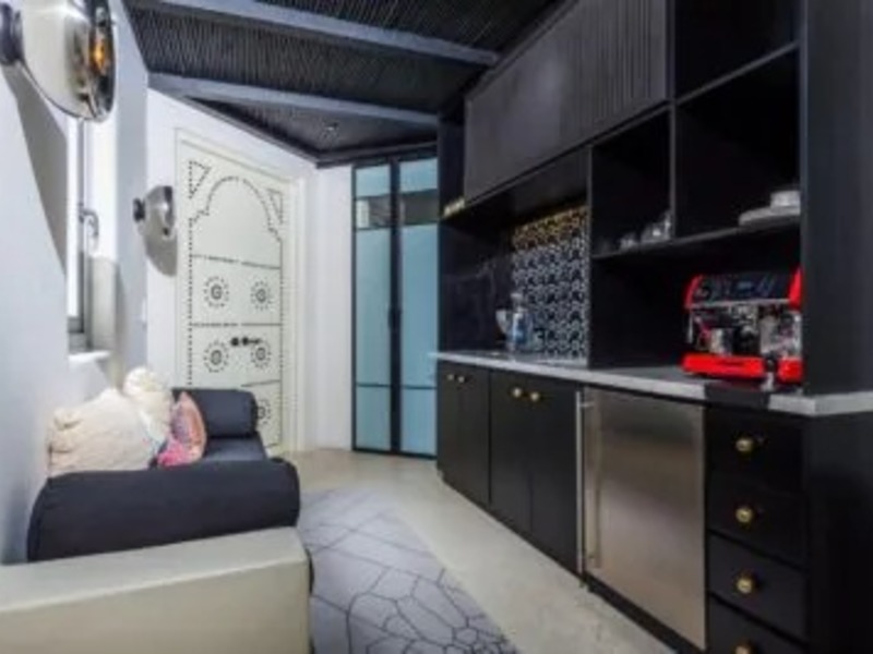 When you go downstairs you'll find two guest bedrooms that have made furniture and attached bathrooms. One of the bathrooms even has a bathtub. There's also a studio apartment, with its enclosed terrace complete with a fountain and a small kitchen area. It could potentially be rented out separately from the house.