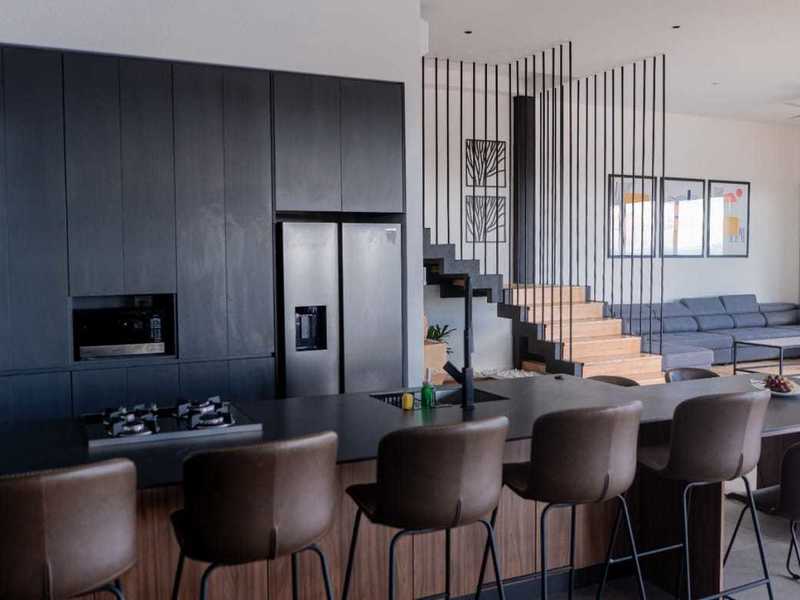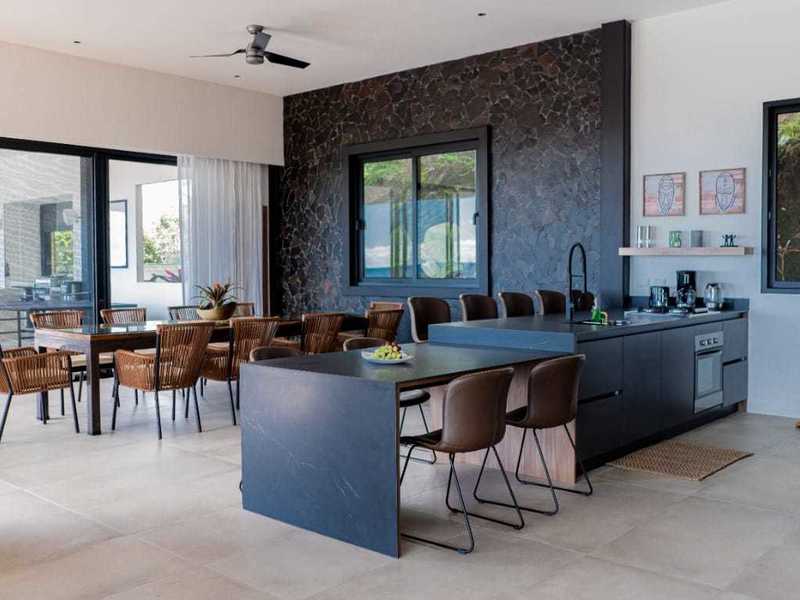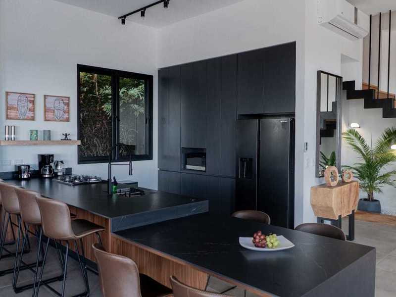Inside, the fully equipped state-of-the-art kitchen is a chef's dream, featuring modern appliances, Italian countertops, and ample storage. The sleek kitchen design seamlessly complements the contemporary exterior aesthetic. The spacious and inviting living area provides a comfortable space to relax and enjoy quality time on an XL lounging sofa.