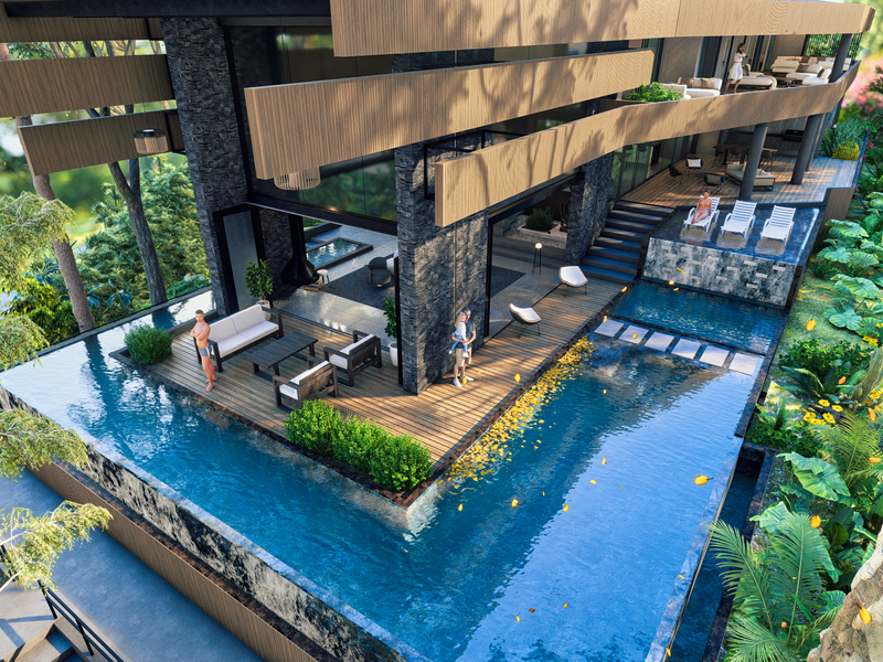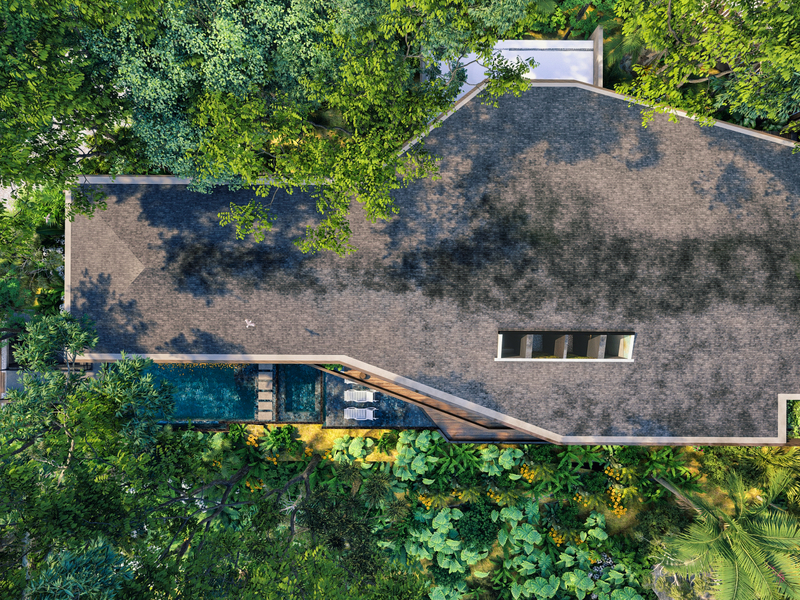 The heart of the villa is its primary living area, featuring a cathedral ceiling and floor-to-ceiling windows that create a sense of being immersed in the canopy of the jungle. Step outside onto the Balinese-tiled wraparound pool deck, and you'll feel as though you're floating above the trees, with uninterrupted views of the ocean beyond.