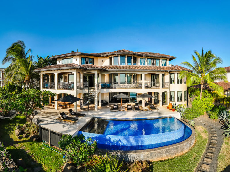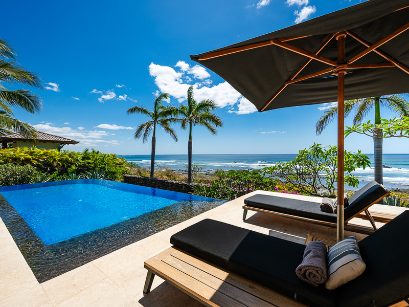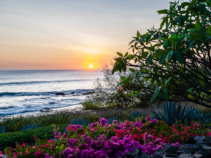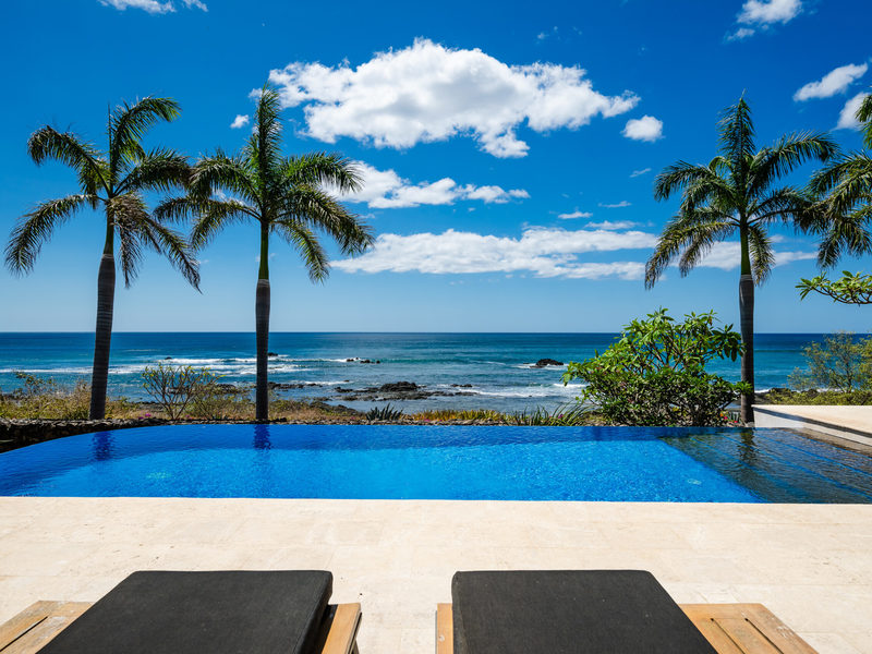 Stepping outside, the property reveals its true splendor with mature landscaping and beautiful gardens leading to the beach. The outdoor space is adorned with royal palm trees and vibrant fuchsia pink bougainvillea flowers, creating a colorful and inviting exterior. The infinity pool, surrounded by teak lounge chairs and umbrellas, provides a front-row seat to the world-famous surfing spot, allowing residents to watch surfers glide across the waves from their balconies.