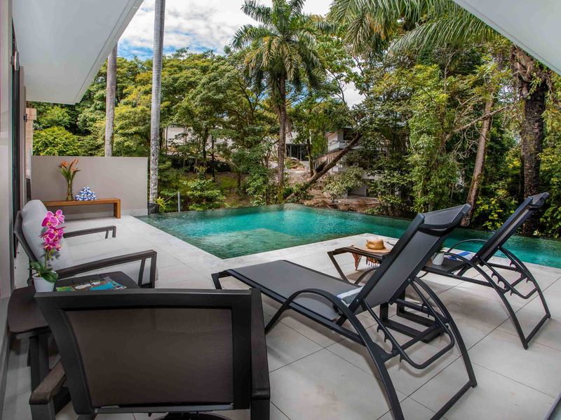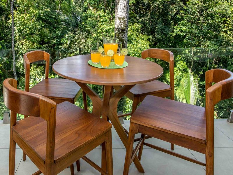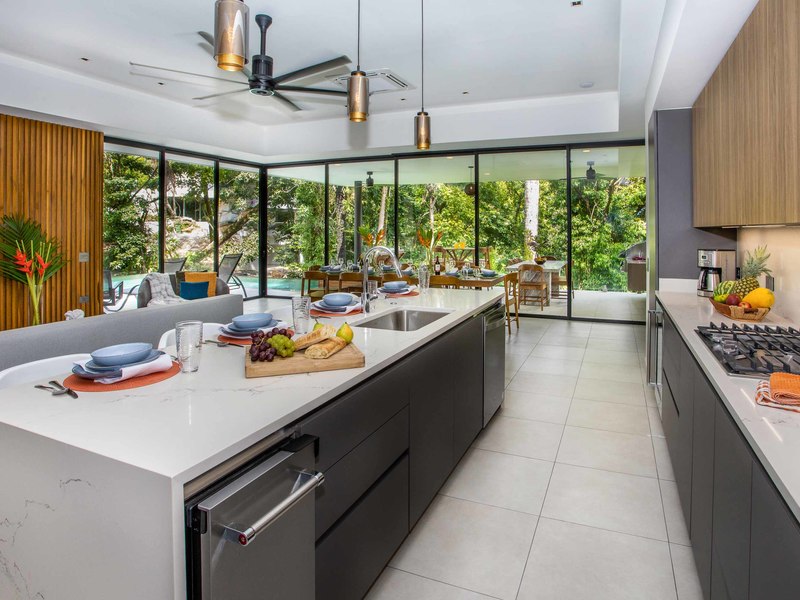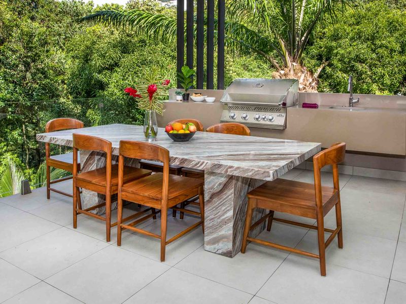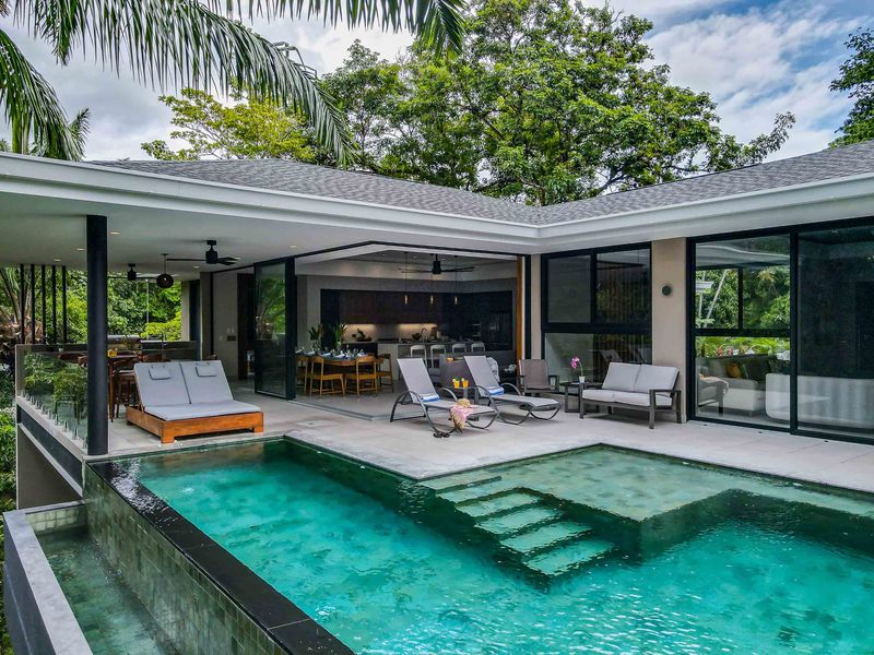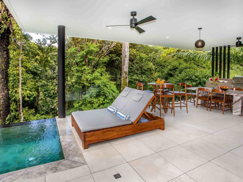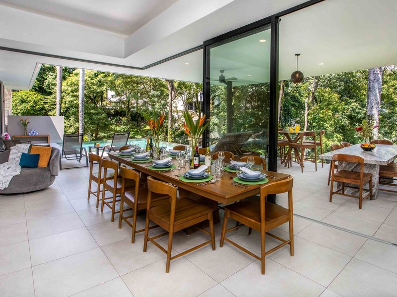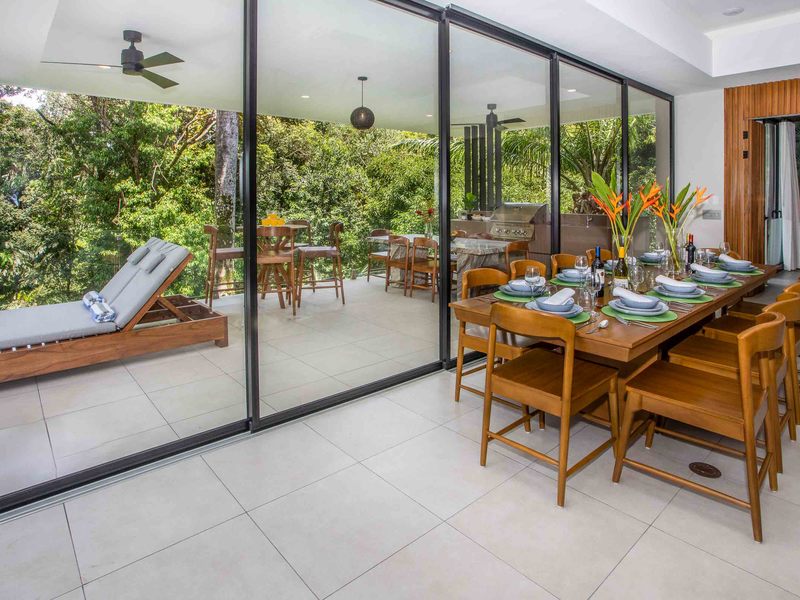 The heart of the home is its primary social area, featuring soaring ceilings, expansive glass windows, and a seamless integration of indoor and outdoor spaces. The fully equipped kitchen, tropical hardwood dining table, and spacious living area flow effortlessly onto an expansive covered deck. Here, an outdoor BBQ kitchen, a stunning stone dining table, and comfortable exterior living space await, overlooking the infinity-edge pool that blends harmoniously with the canopy backdrop. A gorgeous full bathroom and shower are also accessible directly from the pool deck, enhancing the convenience and luxury of outdoor living.