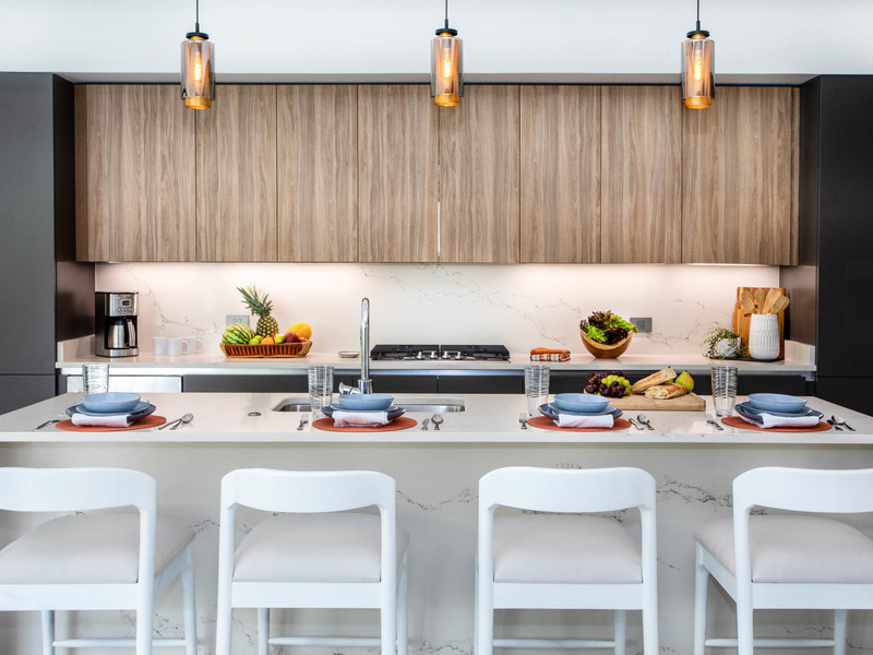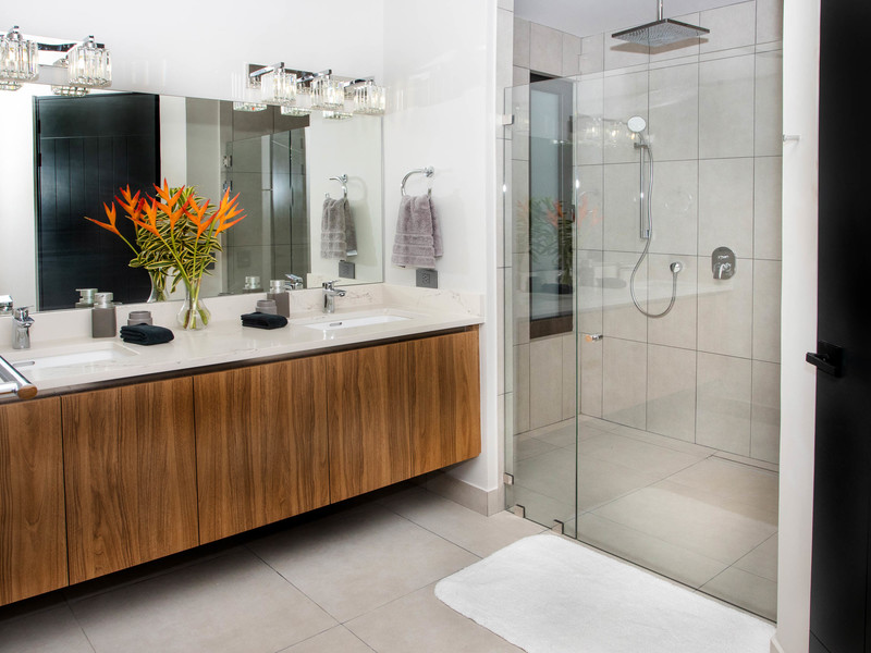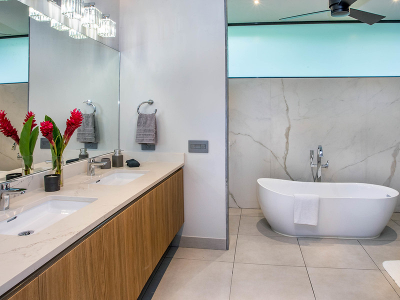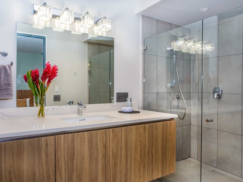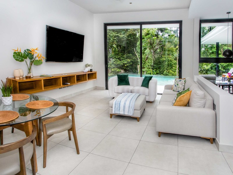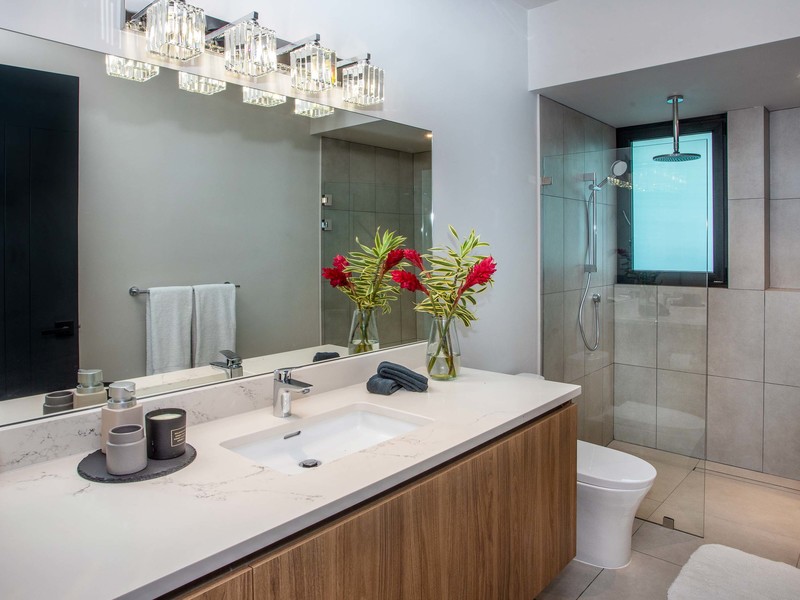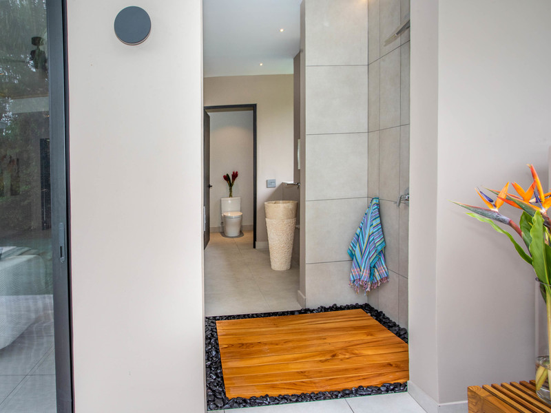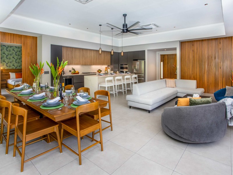 The heart of the home is its primary social area, featuring soaring ceilings, expansive glass windows, and a seamless integration of indoor and outdoor spaces. The fully equipped kitchen, tropical hardwood dining table, and spacious living area flow effortlessly onto an expansive covered deck. Here, an outdoor BBQ kitchen, a stunning stone dining table, and comfortable exterior living space await, overlooking the infinity-edge pool that blends harmoniously with the canopy backdrop. A gorgeous full bathroom and shower are also accessible directly from the pool deck, enhancing the convenience and luxury of outdoor living.