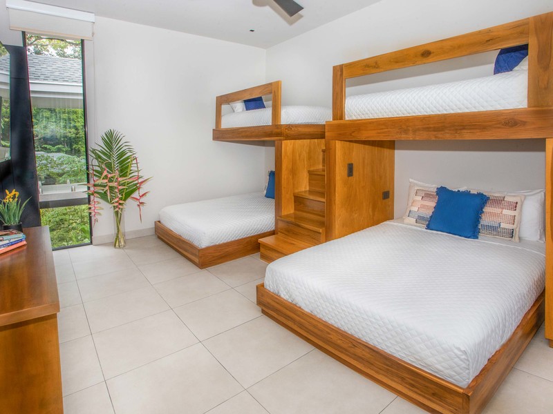 On the main level, you'll find one of the master suites, complete with a private ensuite bath featuring a soaking tub and breathtaking canopy views. Additionally, the main level hosts a bunk room for the kids, a full bath for this room, which also services the common areas, and another full bath for the pool and exterior spaces.