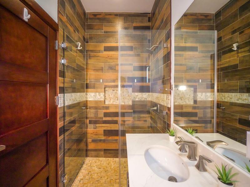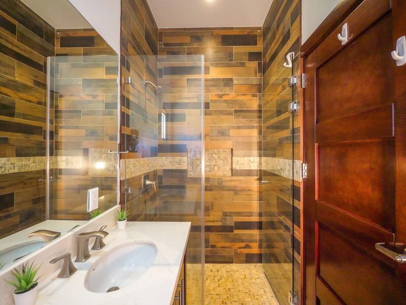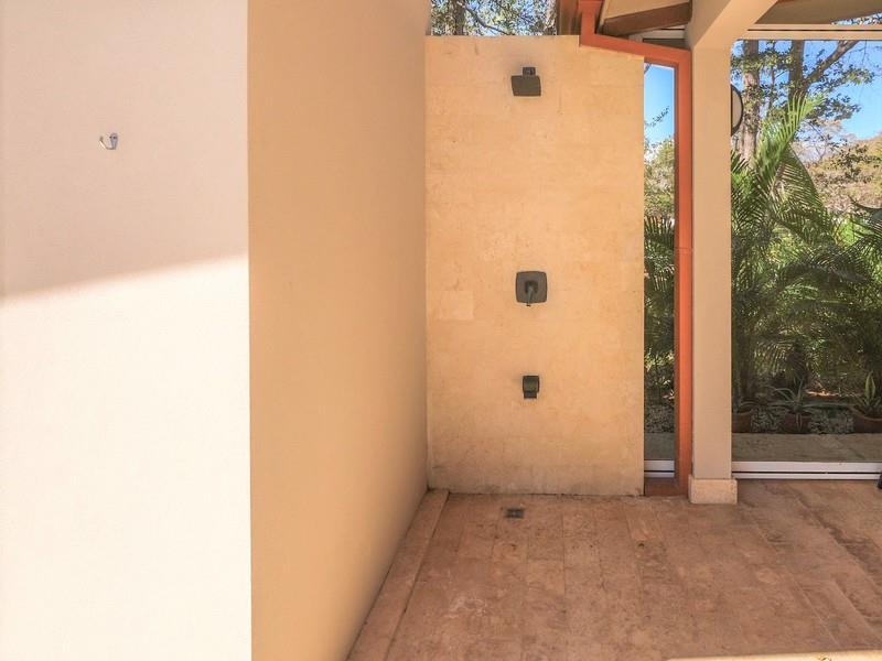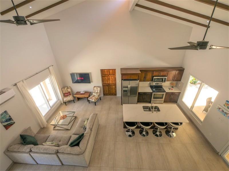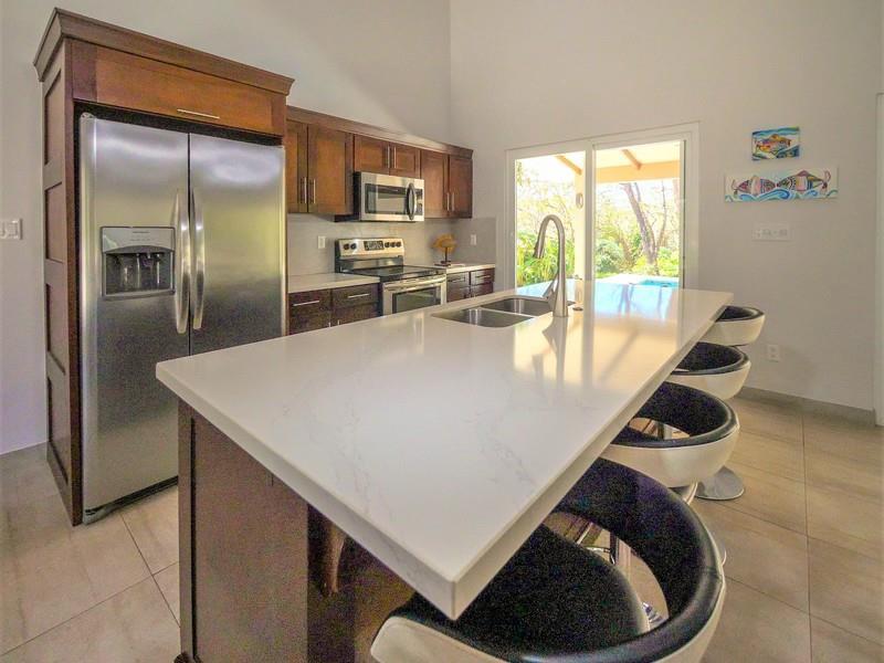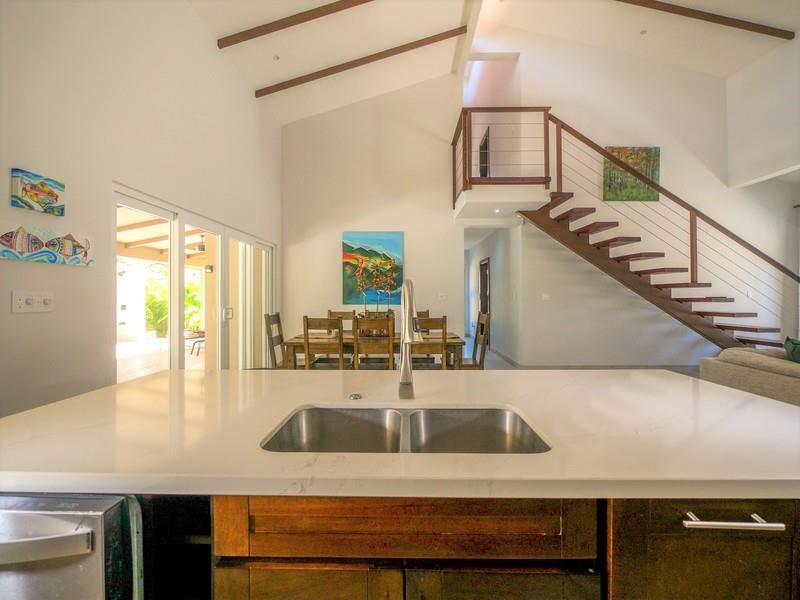 Twin images of each other, both homes boast vaulted ceilings, open plan living spaces, privacy, and outdoor living under the covered veranda. Each kitchen is outfitted with stainless appliances, mahogany cabinets, quartz countertops, and plenty of room for dining at the island’s bar. Enjoy seamless indoor-outdoor living with the bonus veranda space by the private pool and an outdoor shower. It’s the perfect place for entertaining family and guests.