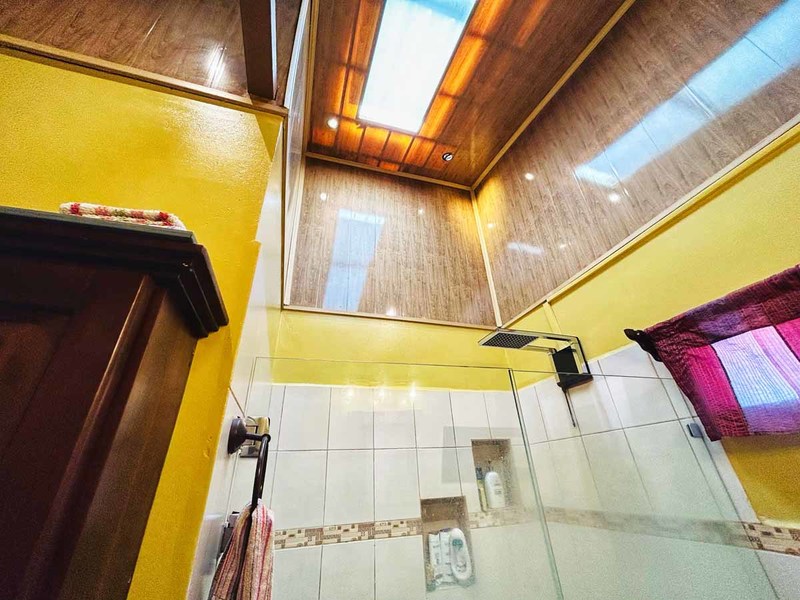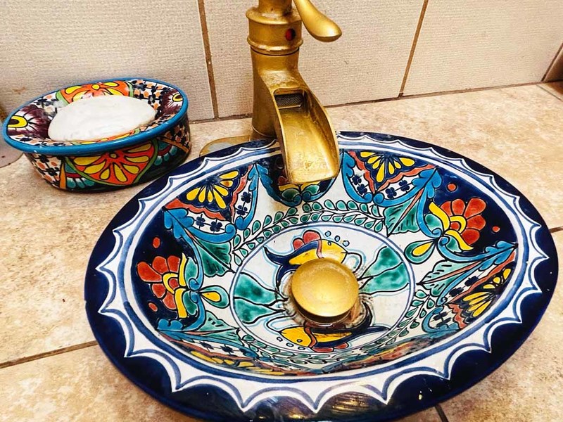 The bathroom features include a large shower with a skylight and a Talavera tile sink.