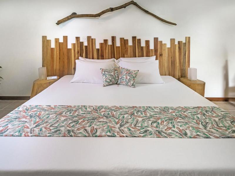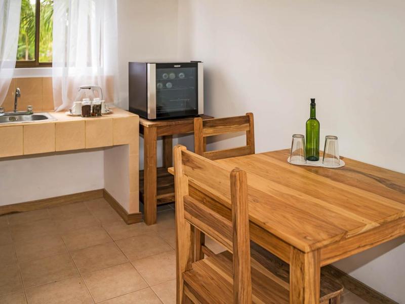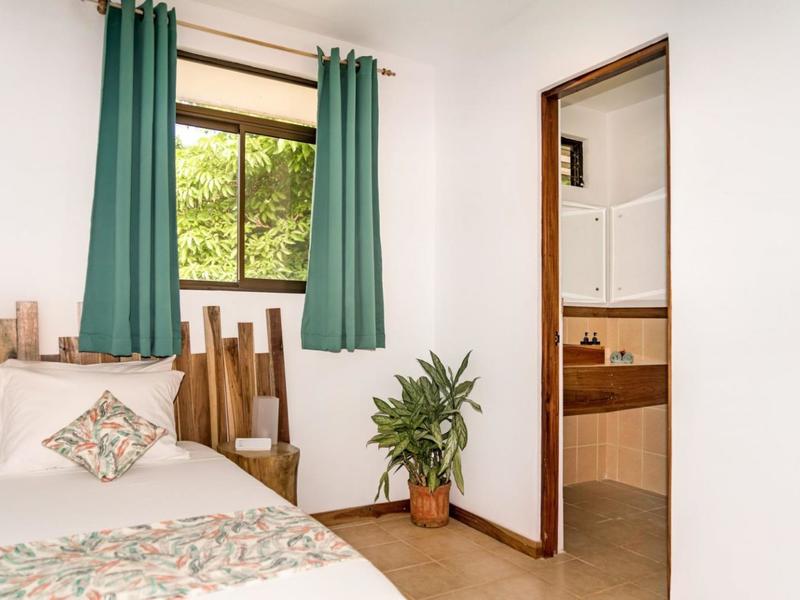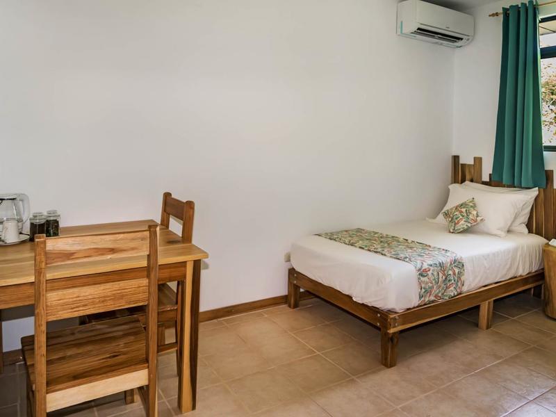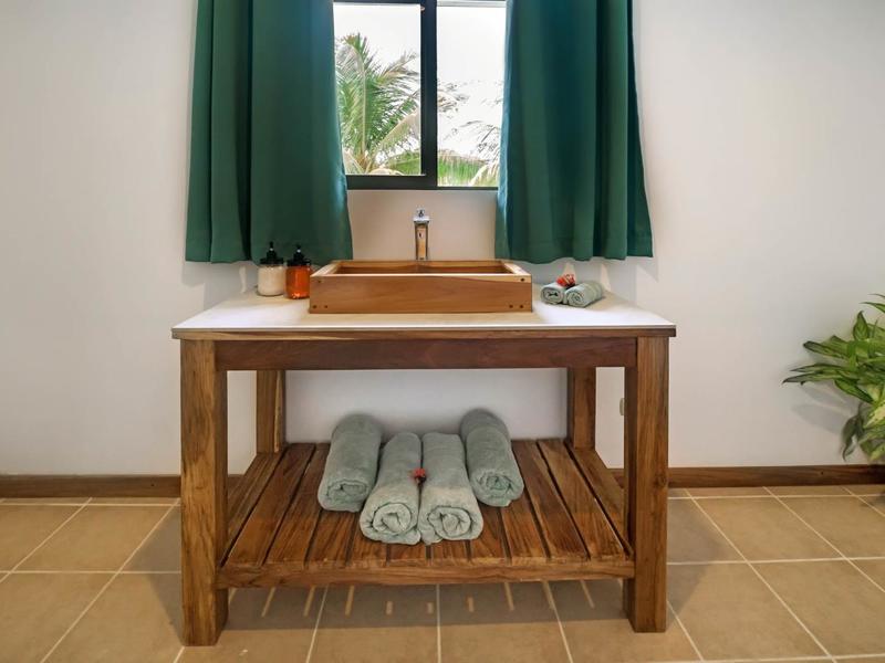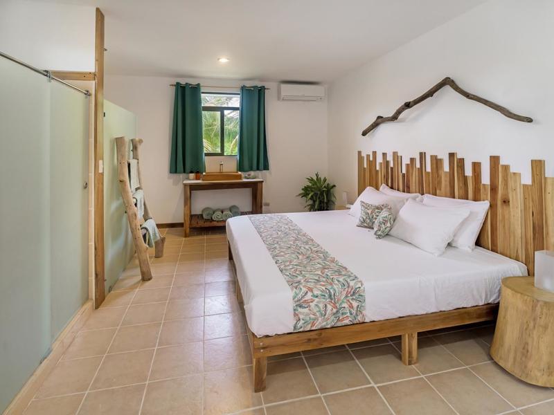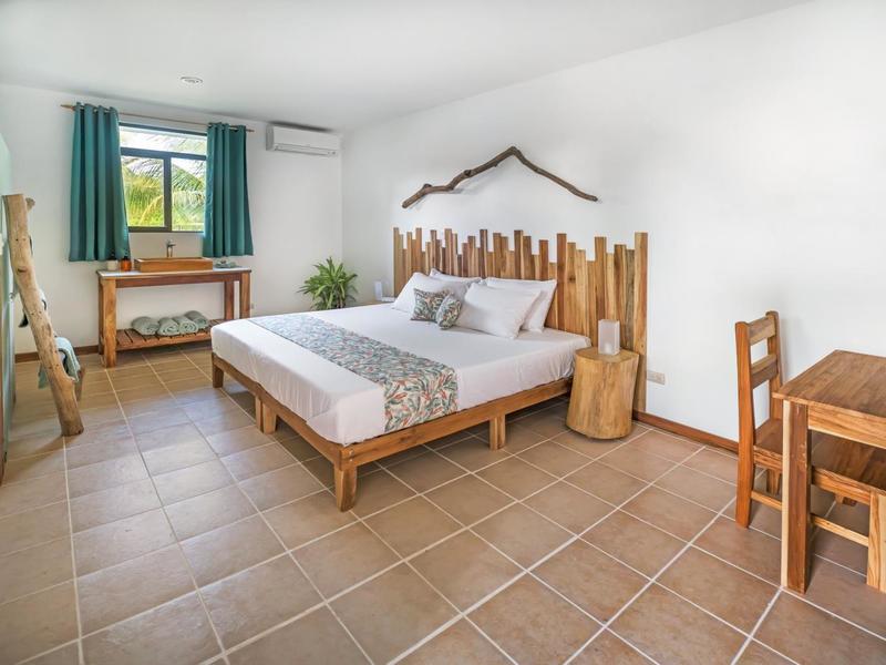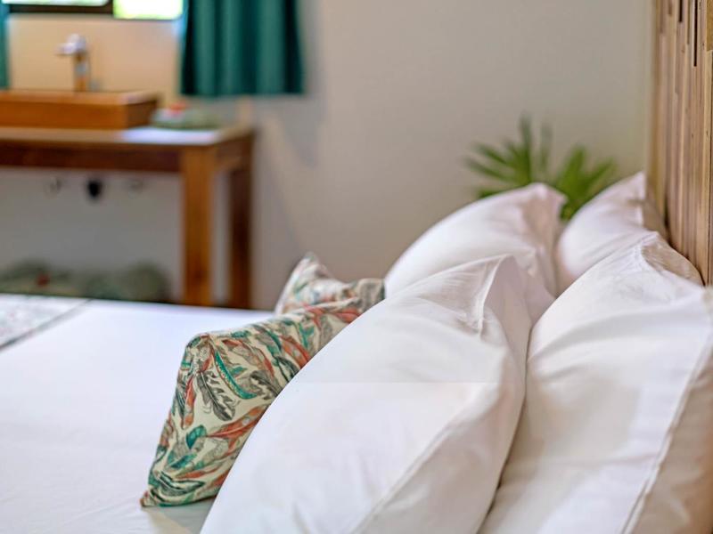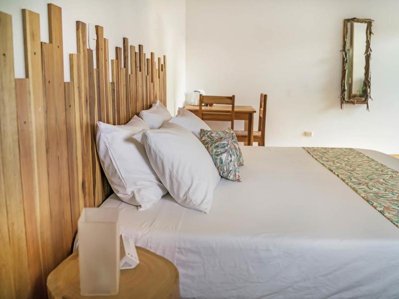 Nestled in a tropical paradise full of shady palms, the resort currently has 8 rooms and 4 private villas. All of the accommodations are decorated in a clean and simple style with furniture made by local craftsmen, touches of driftwood, and accented with calming colors. Each is outfitted with comfortable memory foam mattresses, plush hypo-allergenic feather pillows, air conditioning, a private bathroom, tables and chairs, and appliances for making tea or coffee. The 2 twin rooms, 2 queen rooms, and 4 king rooms have mini-fridges. The 4 villas have 2 bedrooms each (1 king and 2 singles) and have stoves, refrigerators, and televisions. Guests can enjoy their coffee from rocking chairs on the villa’s veranda! All the linens are luxurious 100% organic cotton and the complimentary toiletries are organic and biodegradable. High-speed internet is available throughout the complex, and Netflix can be accessed on TVs.