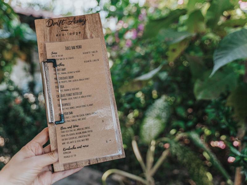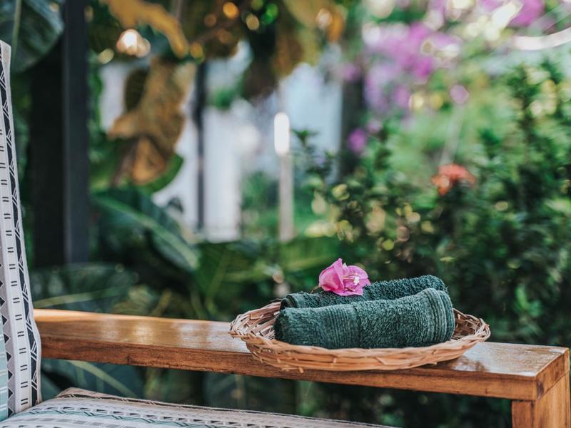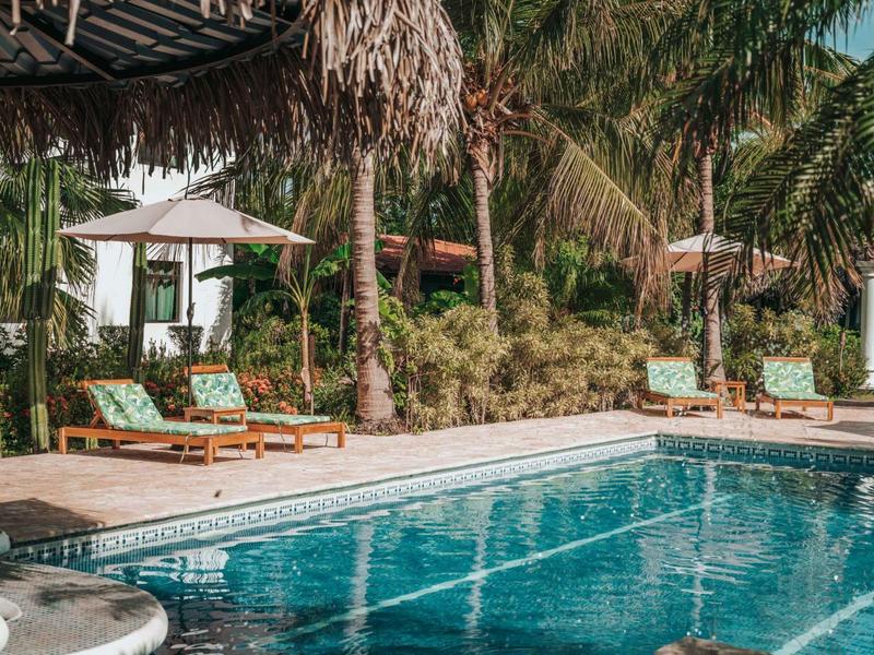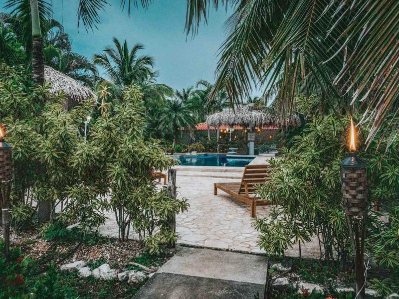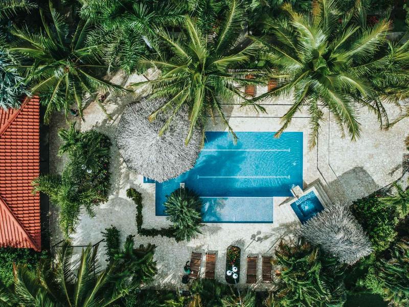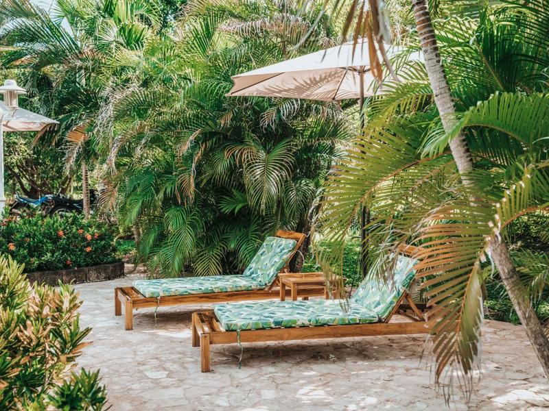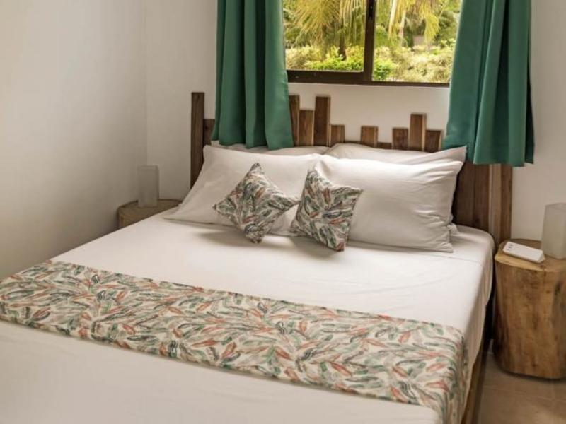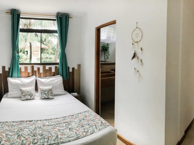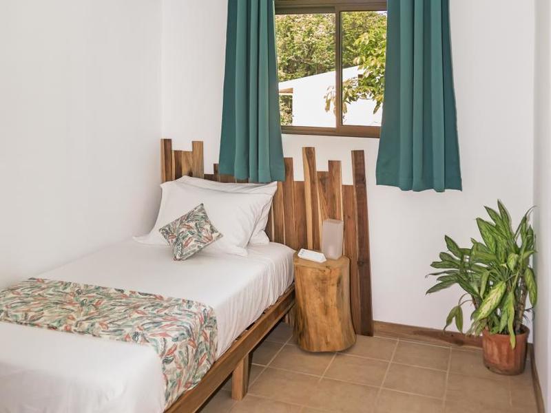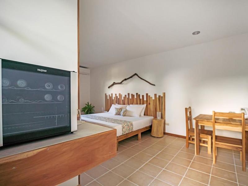 Nestled in a tropical paradise full of shady palms, the resort currently has 8 rooms and 4 private villas. All of the accommodations are decorated in a clean and simple style with furniture made by local craftsmen, touches of driftwood, and accented with calming colors. Each is outfitted with comfortable memory foam mattresses, plush hypo-allergenic feather pillows, air conditioning, a private bathroom, tables and chairs, and appliances for making tea or coffee. The 2 twin rooms, 2 queen rooms, and 4 king rooms have mini-fridges. The 4 villas have 2 bedrooms each (1 king and 2 singles) and have stoves, refrigerators, and televisions. Guests can enjoy their coffee from rocking chairs on the villa’s veranda! All the linens are luxurious 100% organic cotton and the complimentary toiletries are organic and biodegradable. High-speed internet is available throughout the complex, and Netflix can be accessed on TVs.