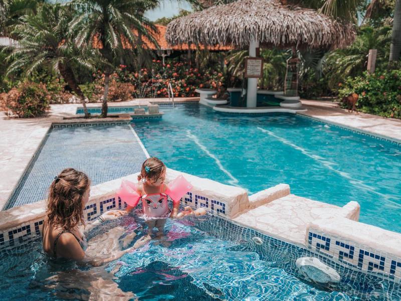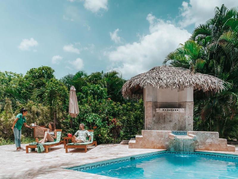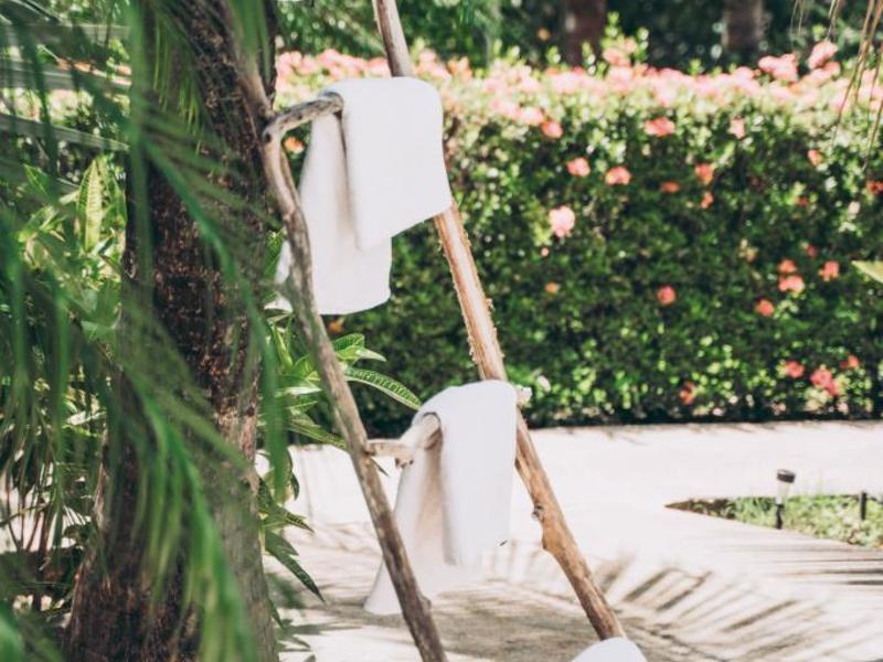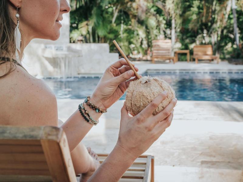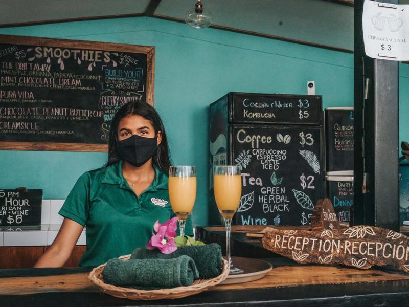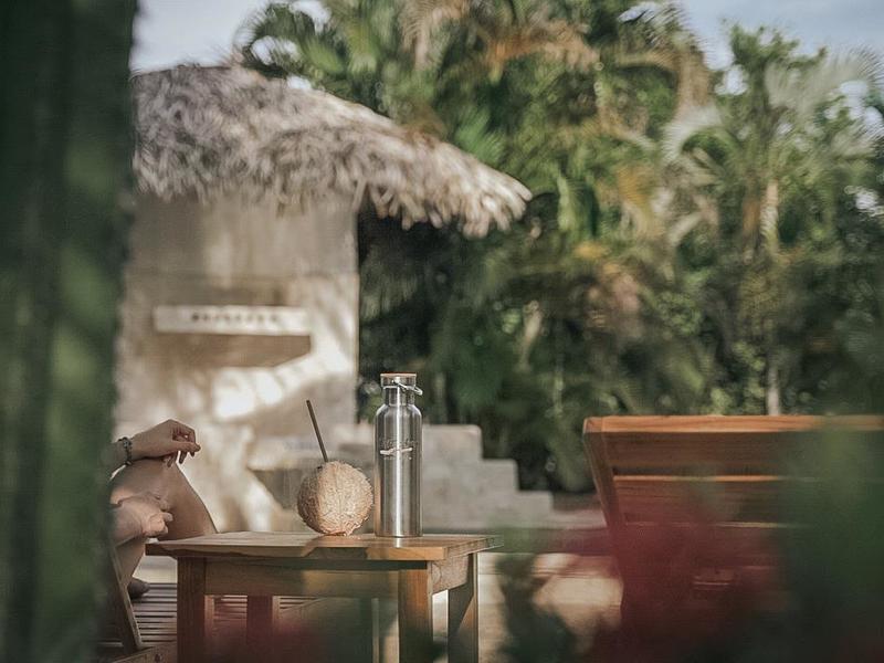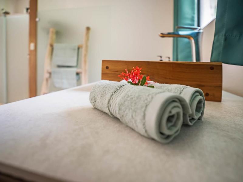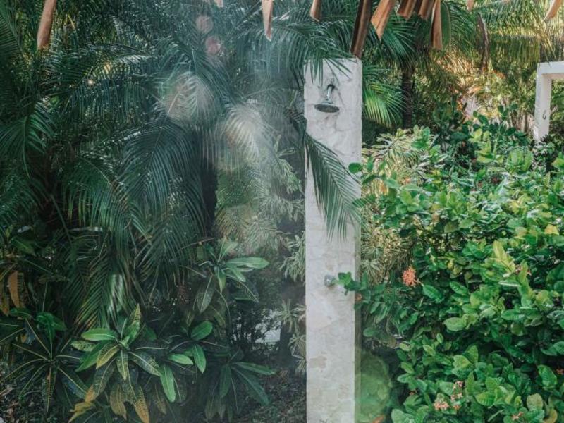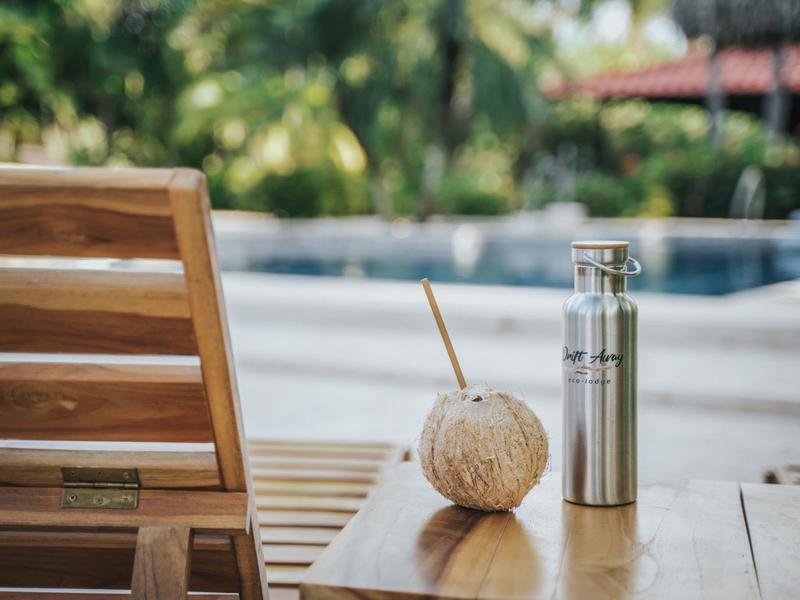 Nestled in a tropical paradise full of shady palms, the resort currently has 8 rooms and 4 private villas. All of the accommodations are decorated in a clean and simple style with furniture made by local craftsmen, touches of driftwood, and accented with calming colors. Each is outfitted with comfortable memory foam mattresses, plush hypo-allergenic feather pillows, air conditioning, a private bathroom, tables and chairs, and appliances for making tea or coffee. The 2 twin rooms, 2 queen rooms, and 4 king rooms have mini-fridges. The 4 villas have 2 bedrooms each (1 king and 2 singles) and have stoves, refrigerators, and televisions. Guests can enjoy their coffee from rocking chairs on the villa’s veranda! All the linens are luxurious 100% organic cotton and the complimentary toiletries are organic and biodegradable. High-speed internet is available throughout the complex, and Netflix can be accessed on TVs.