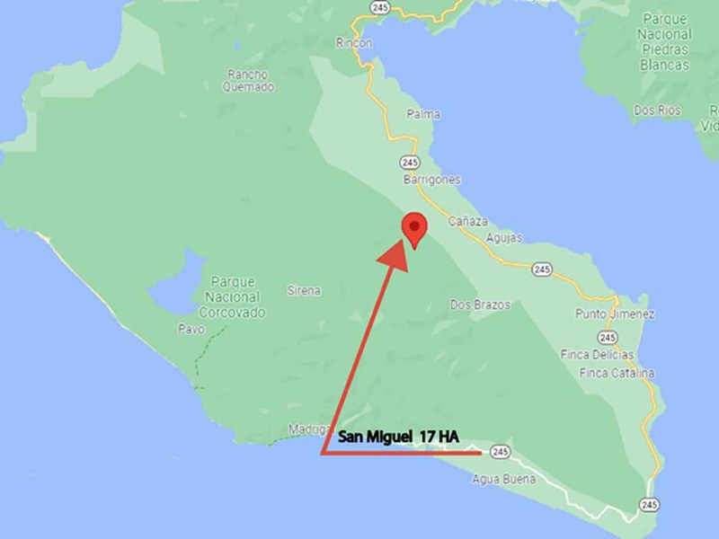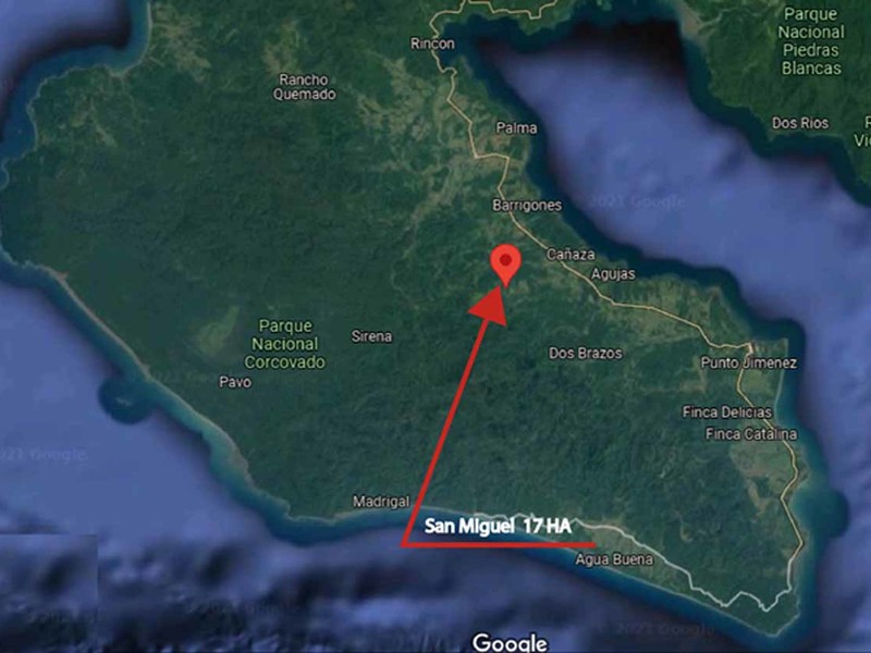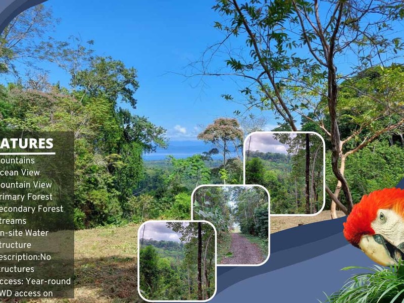 With at least one stunning view site of around 1 hectare overlooking the Golfo Dulce and cleared for building, the property extends from the ridgeline all the way down to Mameyes Creek, with which it has a 200-meter boundary.