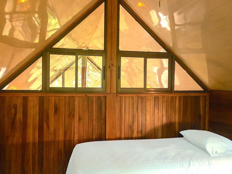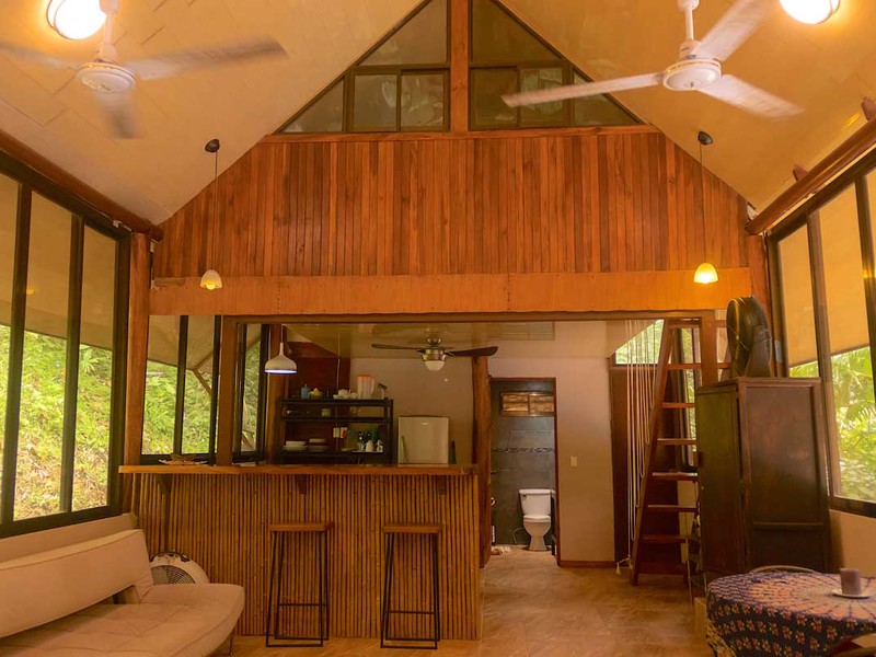 After the ocean-view building site, you will walk the trail/steps down to the already-established cottage below. The cottage has an open-concept living and kitchen area fully equipped with all the basics, high ceilings and full-height windows, and a king-size bed. There is a full bathroom on the main floor as well, The loft bedroom is up some stairs and it has two single beds and A/C. This cottage is configured to sleep four people comfortably.