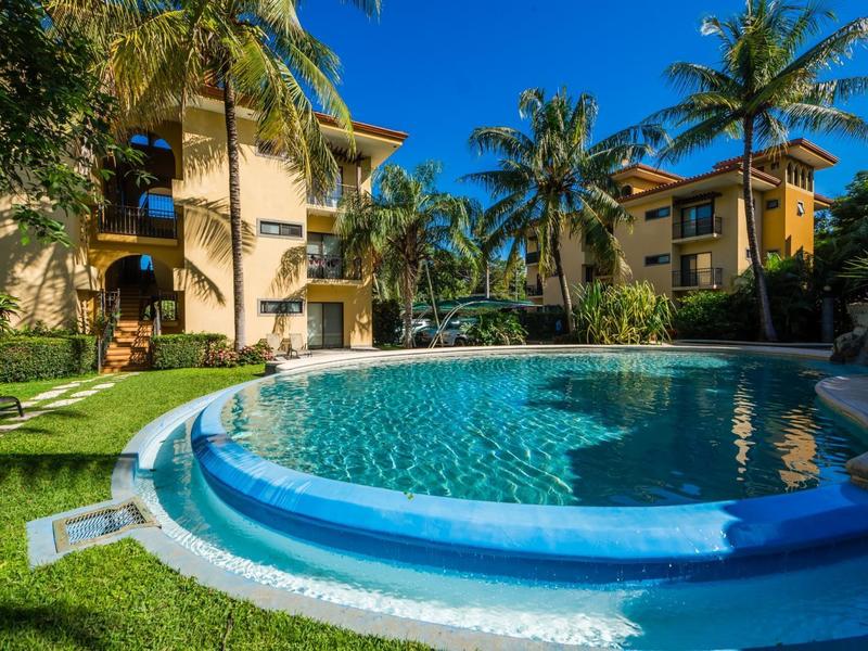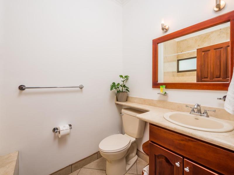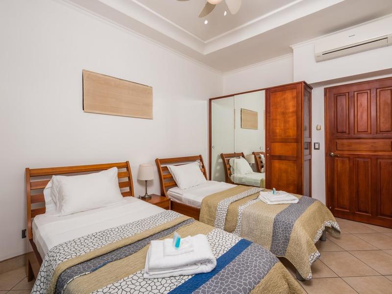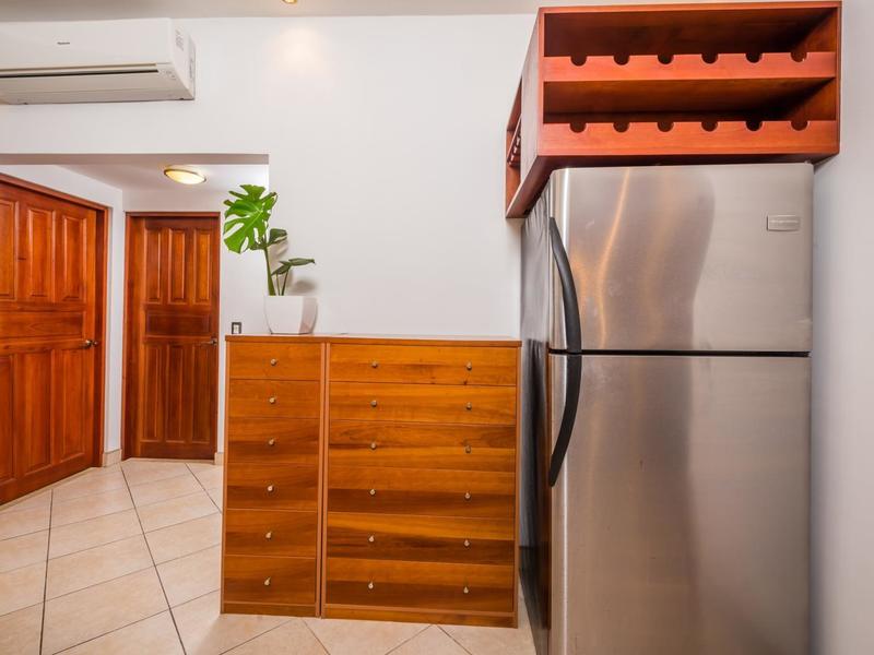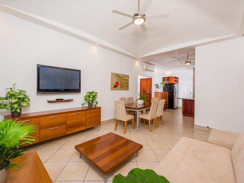 The open concept kitchen and living room give the condo a spacious feel. The kitchen is made with granite countertops, local wood cabinetry, and stainless steel appliances. There is a queen bed and ensuite bathroom in the main bedroom and 2 twins in the second bedroom. The outdoor terrace is large and wraps around the side of the building for extra seating.