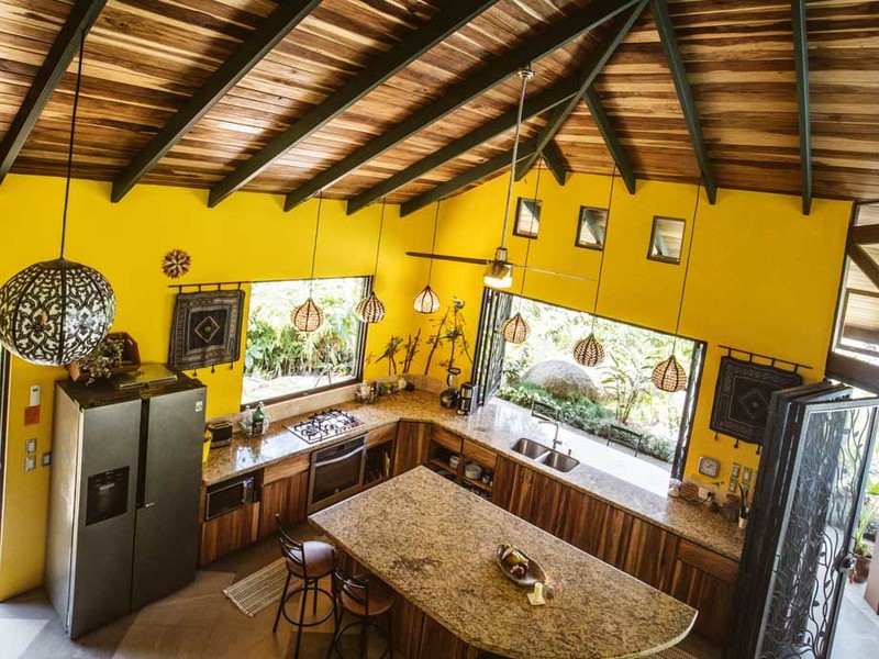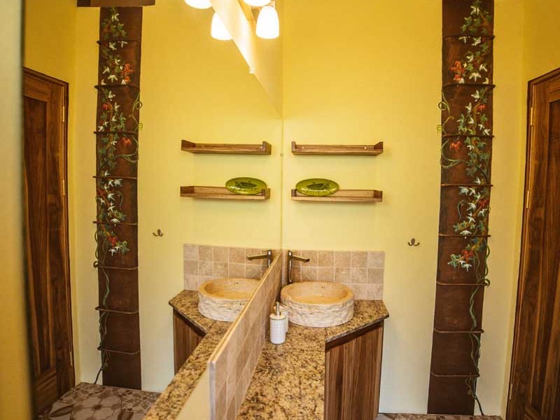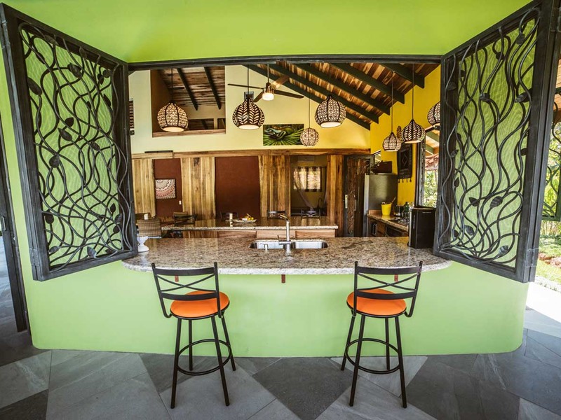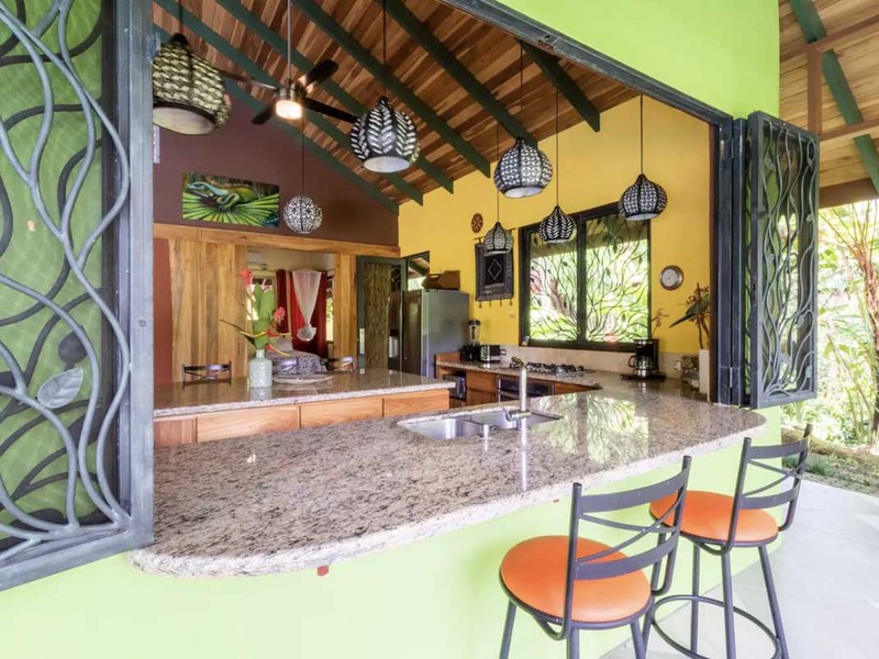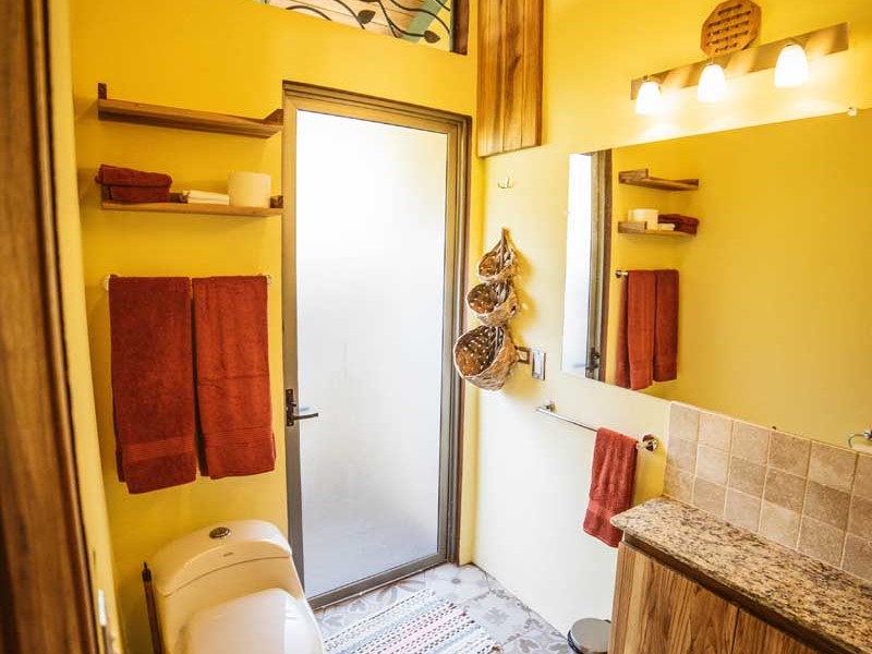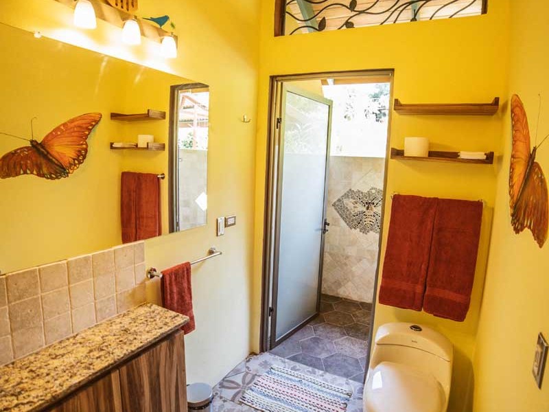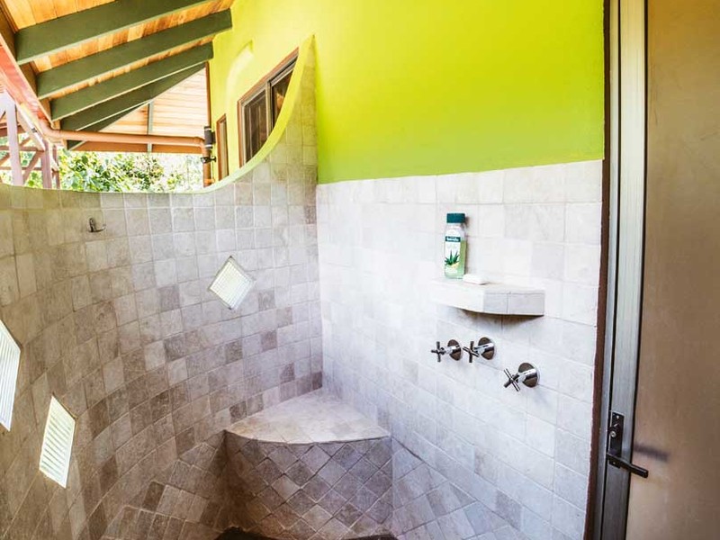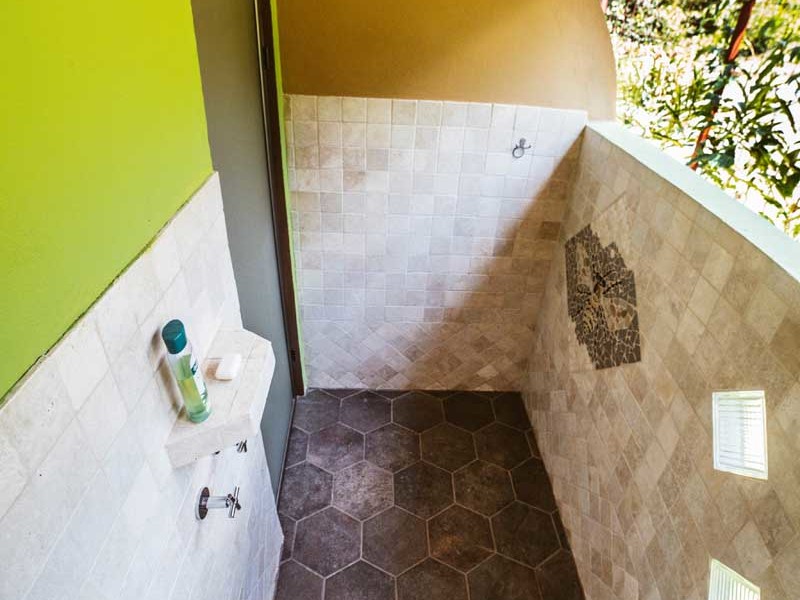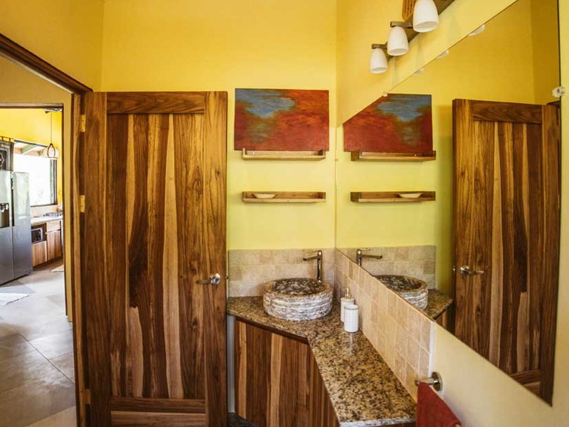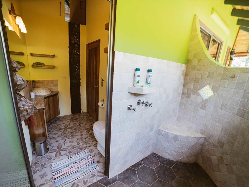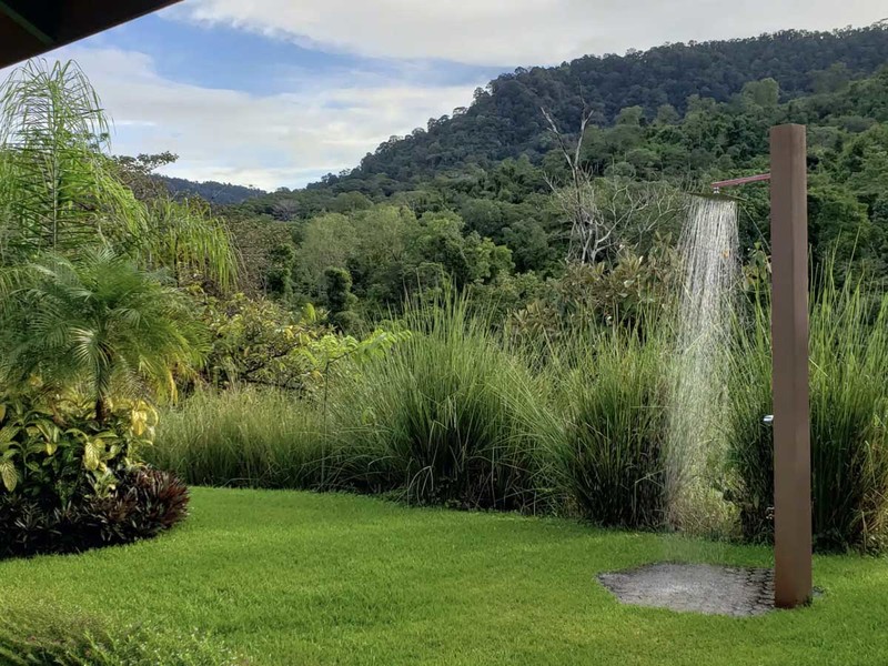 Both bedroom suites boast en suite facilities with open-air showers, live edge laurel wood sliding panel doors, and built-in closets. Each suite offers a private sanctuary where you can unwind after a long day exploring all that Costa Rica has to offer. The property is installed with on-demand hot water heaters, and solar panels for reduced electrical costs, and even boasts access to a hidden waterfall and swimming hole along the creek which borders the property. With all of these luxury amenities, Casa Loro Verde truly offers the ultimate in high-end living.