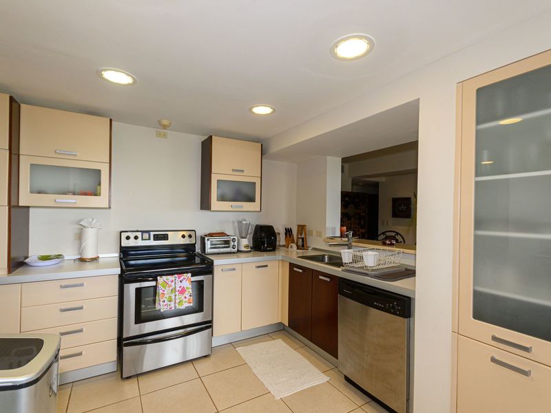 The main bedroom has a Queen bed, ensuite bath, and walk-in closet, and bedroom two boasts two Twins and one Queen bed with an ensuite full bath. The living and dining rooms open onto two walk-out terraces overlooking the pool area and coastline, one with a lovely outdoor dining table for six and the other with a full-size rattan sofa and imported hammocks. The living, dining, and TV rooms wrap around the central kitchen and have top-of-the-line furnishing, including antique Oriental hardwood side tables and accents. The kitchen opens onto the dining room and is stocked with modern appliances, ample counter and closet space, and a charming breakfast bar.