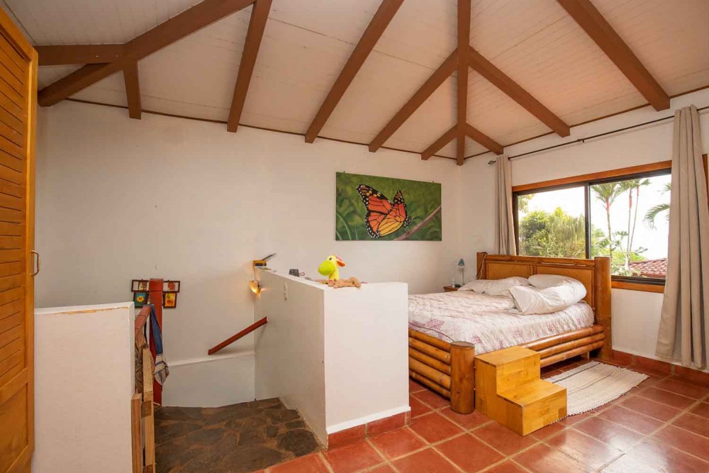 The lower level has a second living area (easily convertible into a third bedroom), another bedroom and another full bathroom. This level has more outdoor living space on the west facing (ocean view) side and also includes a bbq area with a wet bar and outdoor kitchen type of set up. The pool, just a few steps away, is surrounded by mature tropical vegetation and is totally private. The property is fenced, secured and features a security gate. At the top/entry level is a generous parking area with a covered stall. Adjacent to the parking area is two level guest home with charming finishes, a full kitchen, a cozy back porch and a second level which encompasses an ocean view terrace, bedroom area, a full bathroom and generous storage.