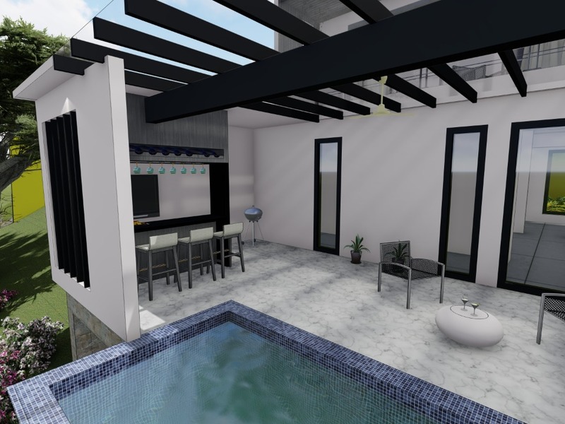 The open concept living, dining and kitchen lead out to the covered terrace and large pool with well thought out lighting, fans, full bathroom and even an outdoor covered BBQ/bar area for when you’re entertaining with guests.