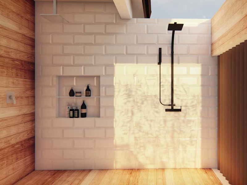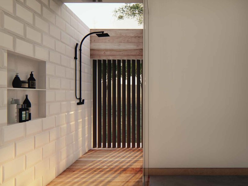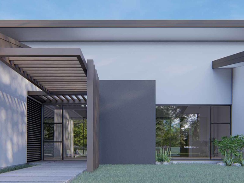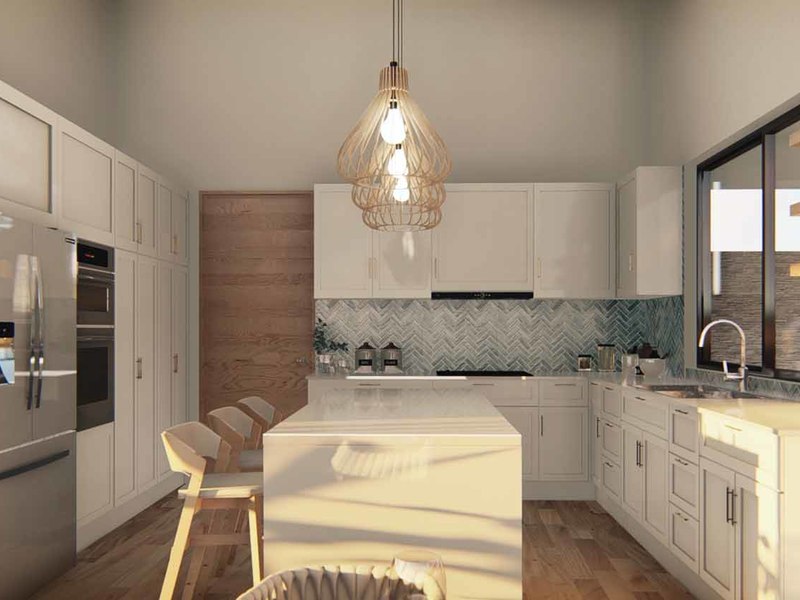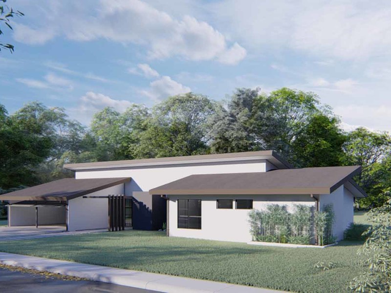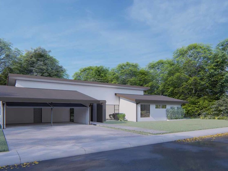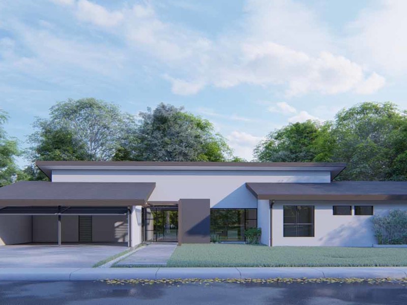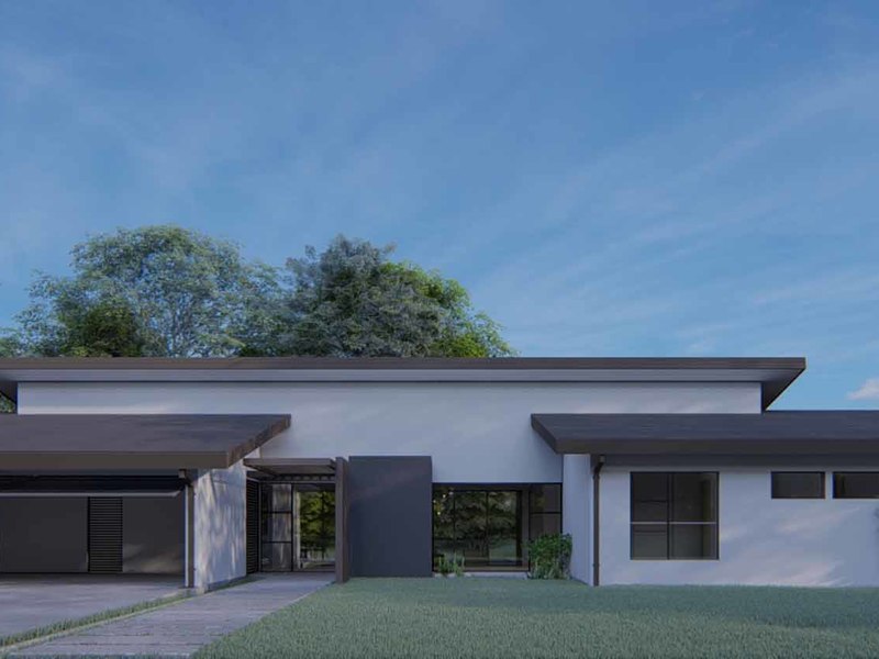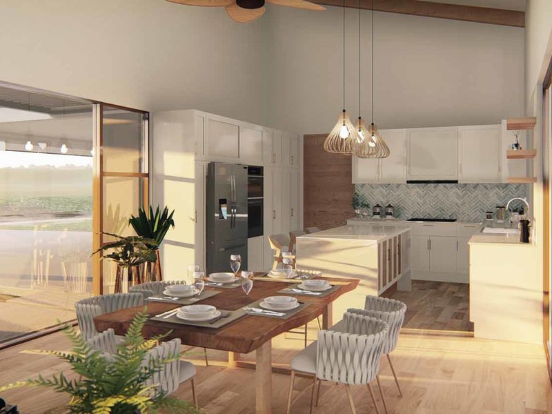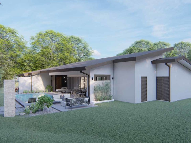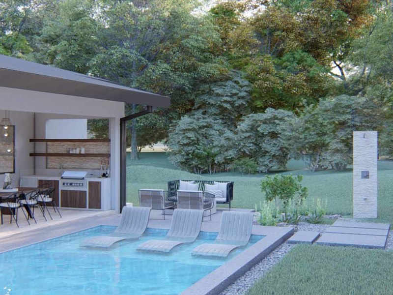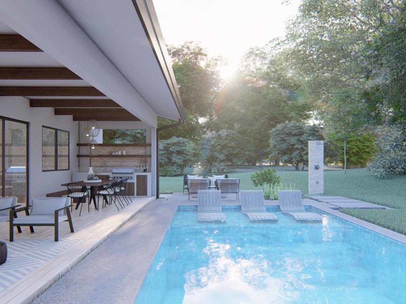An open concept kitchen, living, and dining space open via large glass sliders to the outdoor living space. The covered veranda has an outdoor kitchen and plenty of lounging rooms. The oversized pool is a refreshing oasis on a warm day. The primary bedroom is filled with light from floor-to-ceiling windows and has an en suite with an outdoor shower. Two additional bedrooms have built-in storage and share a beautiful tropical modern bath. There is a half bathroom for guests and a full laundry area with a 2-car garage.