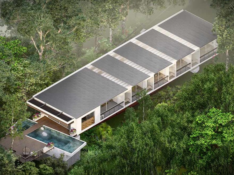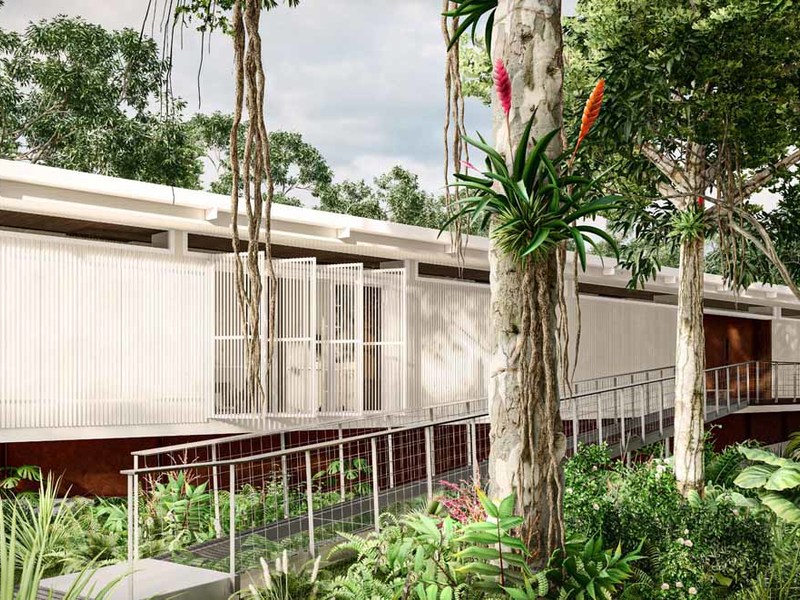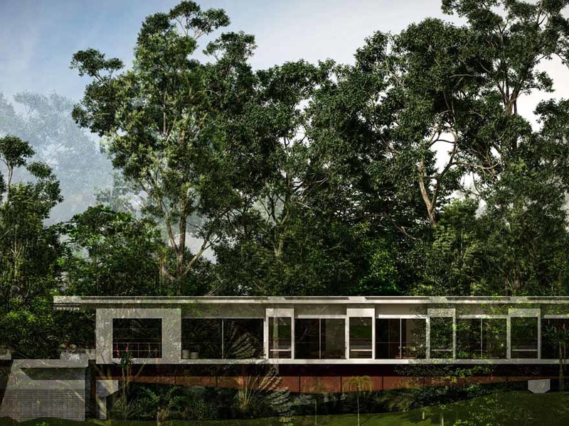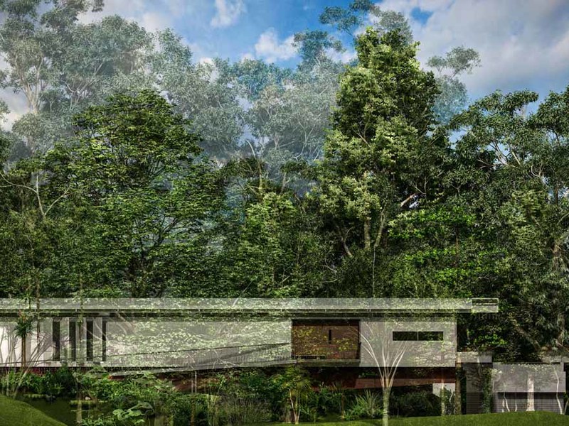 Immersed in the canopy of the surrounding trees, the house is almost floating ethereally above the jungle. Structurally this was achieved by using an engineered heavy steel beam platform as a base, much like a bridge, however discrete, supported on both ends but free and clear in between. Since the support is not obvious, the house appears to be suspended in the forest – you can actually pass underneath the house.
