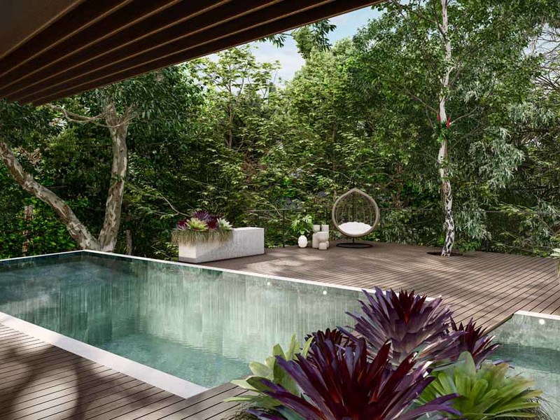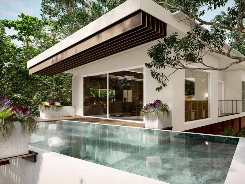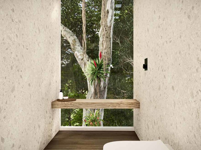 Although the property is primarily about immersion in the forest, there is a beautiful partial ocean view looking westward. The developer of this 1.5-acre property also wanted to ensure that adjoining lots of the 12-acre master plan would take on similar natural themes, be discrete and maintain privacy and distance from one another.
