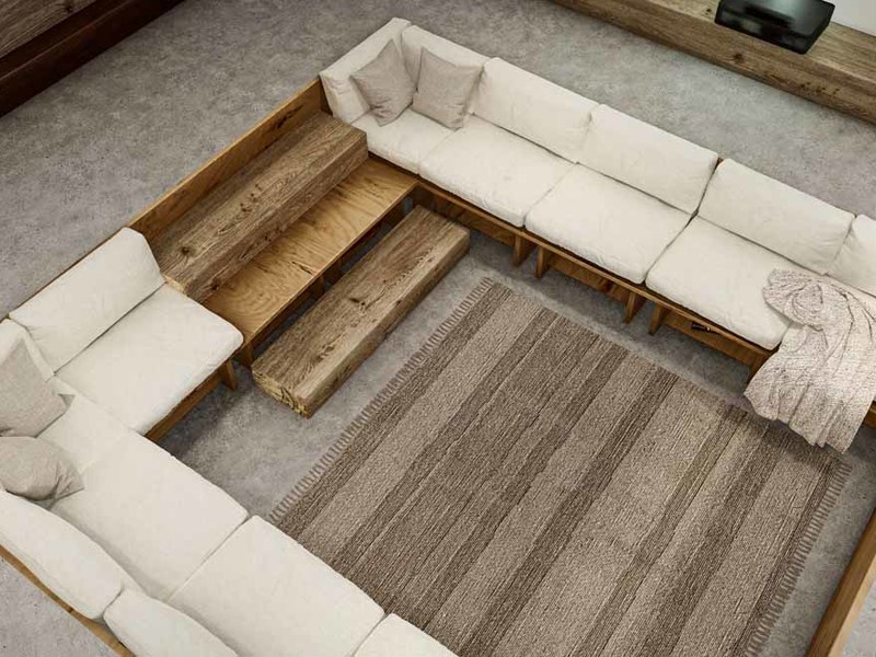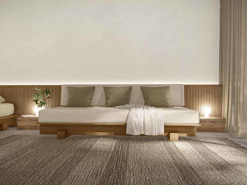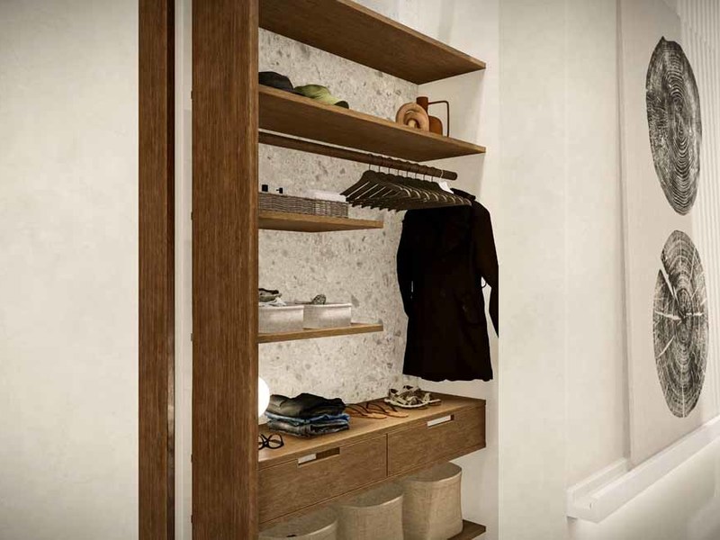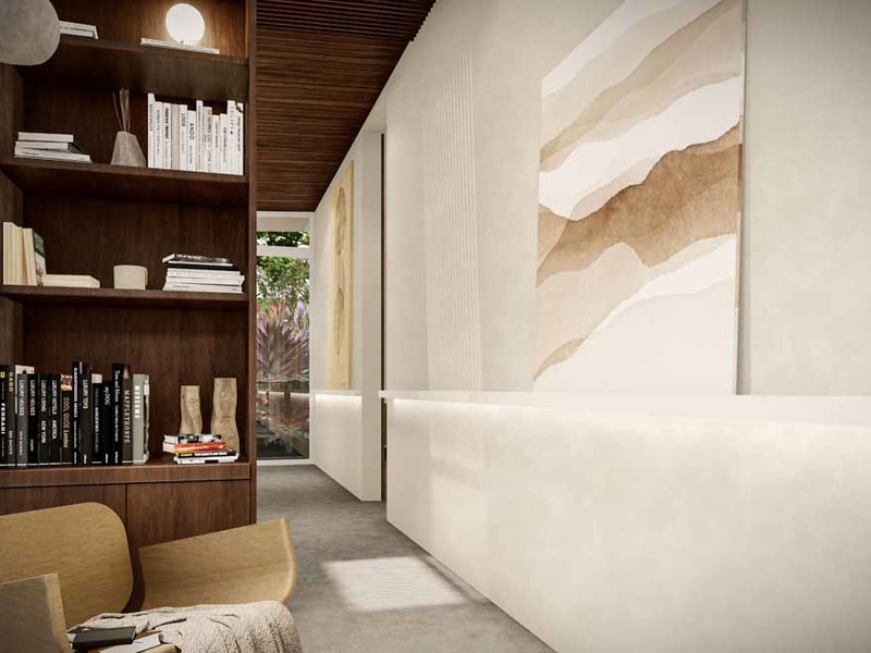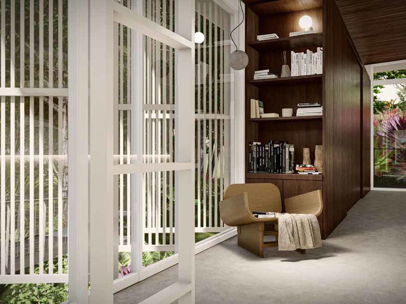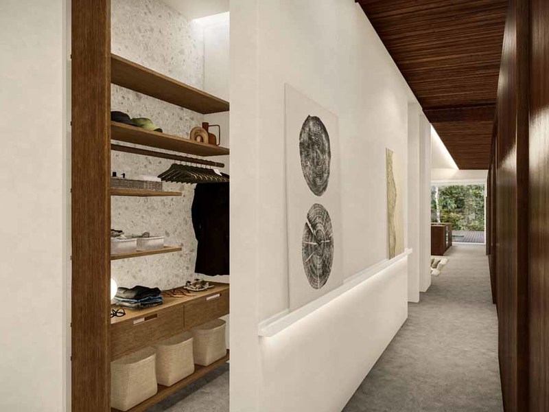 The walls of the 25-meter-long hallway are designed for artwork and paintings like a private home art gallery, also included in this corridor is a small library and seating area.