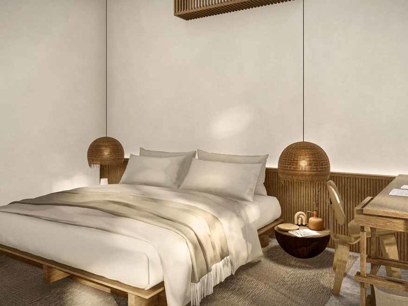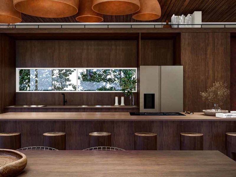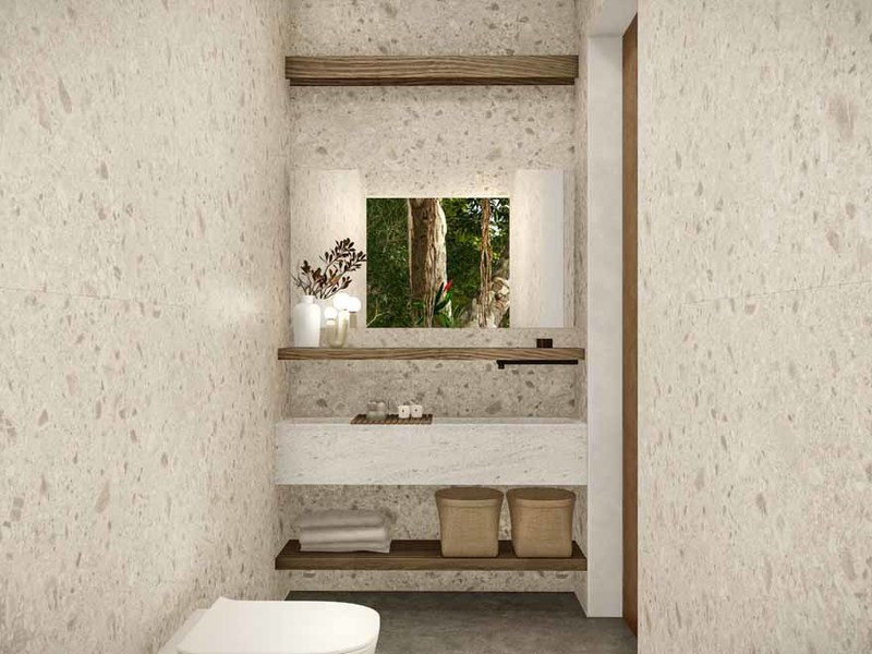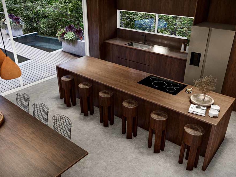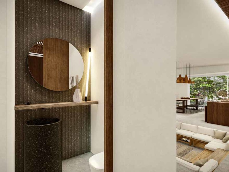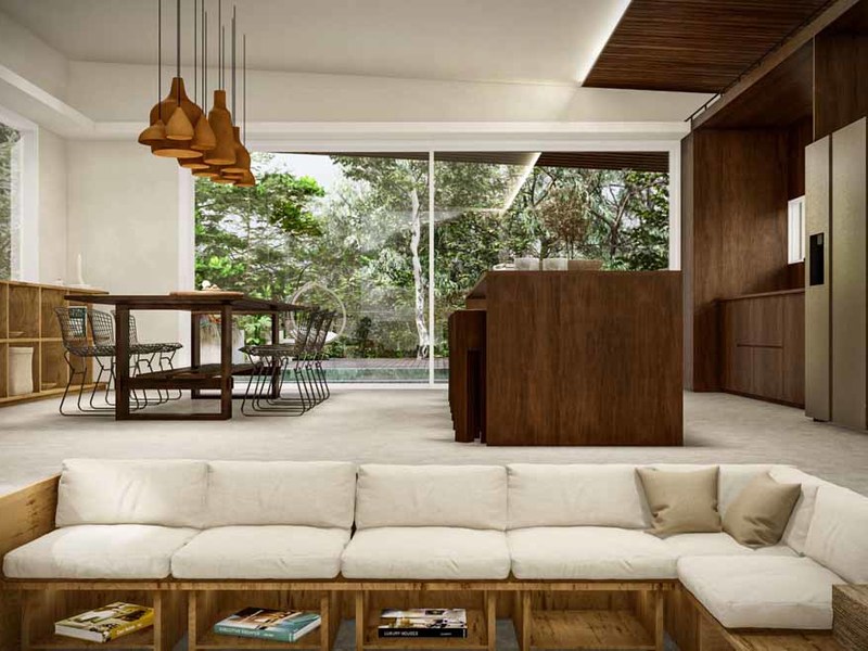 The dominant materials in the home are hardwoods of cenizaro, with golden to dark brown colours used for kitchen cabinets and bedroom closets. The wood is complemented with soft white wall colours, lightly patterned, and taupe stone flooring, creating a warm cozy feeling. Pilon, a dark maroon-colored wood is used for the outside decking and the flat wood bridge across the pool.