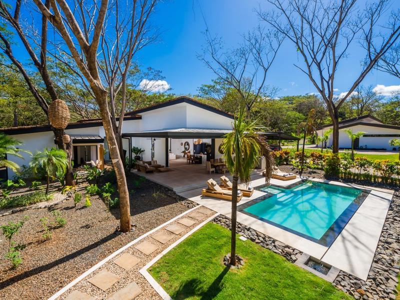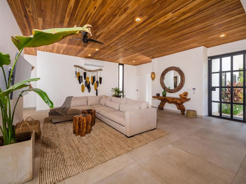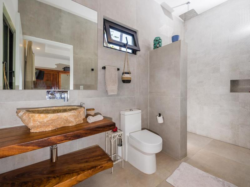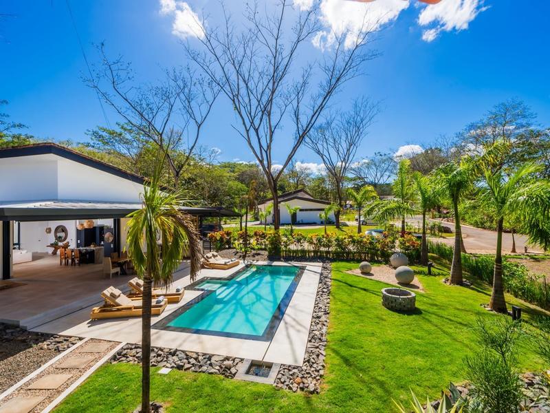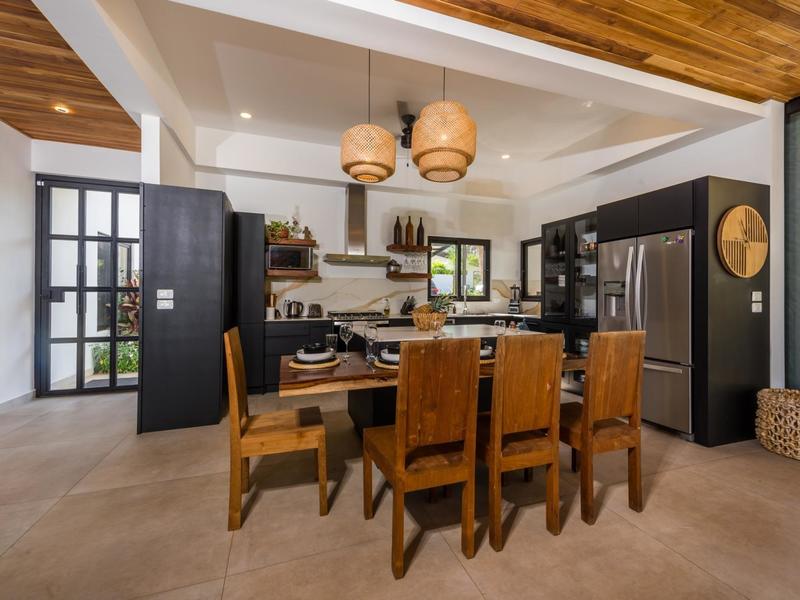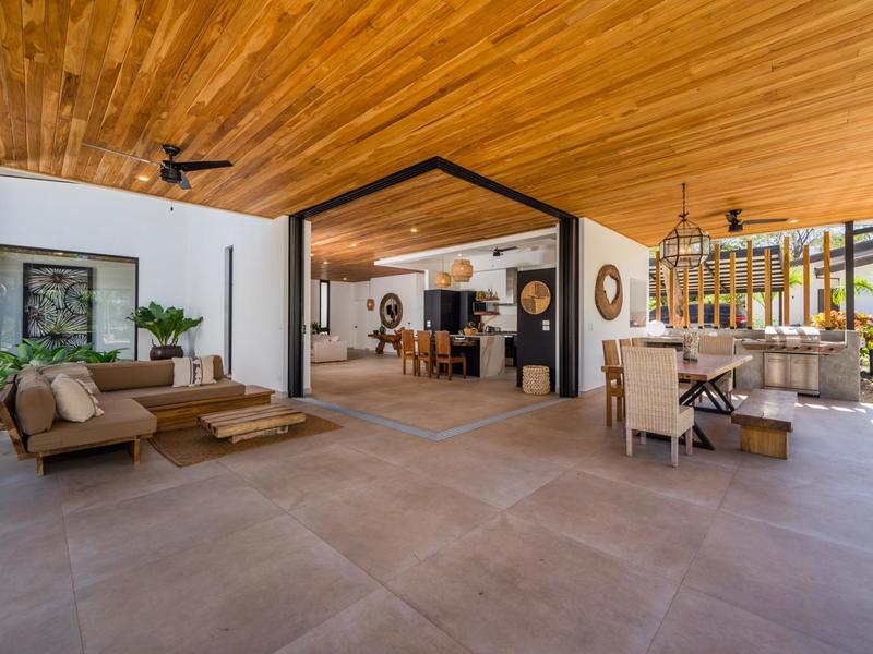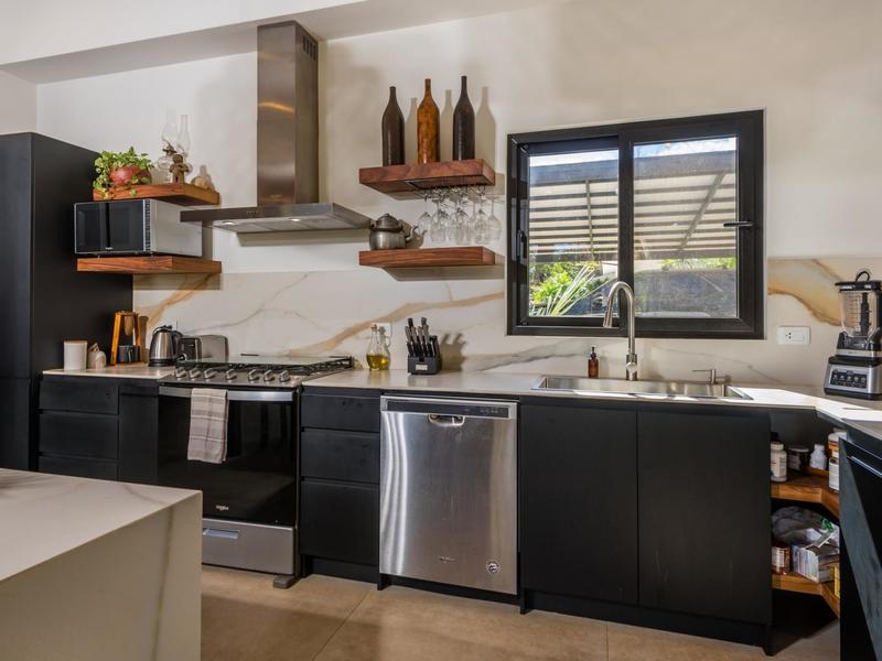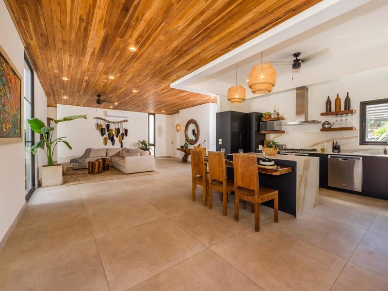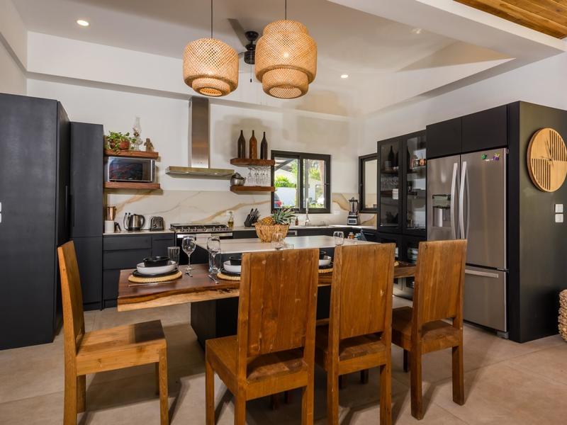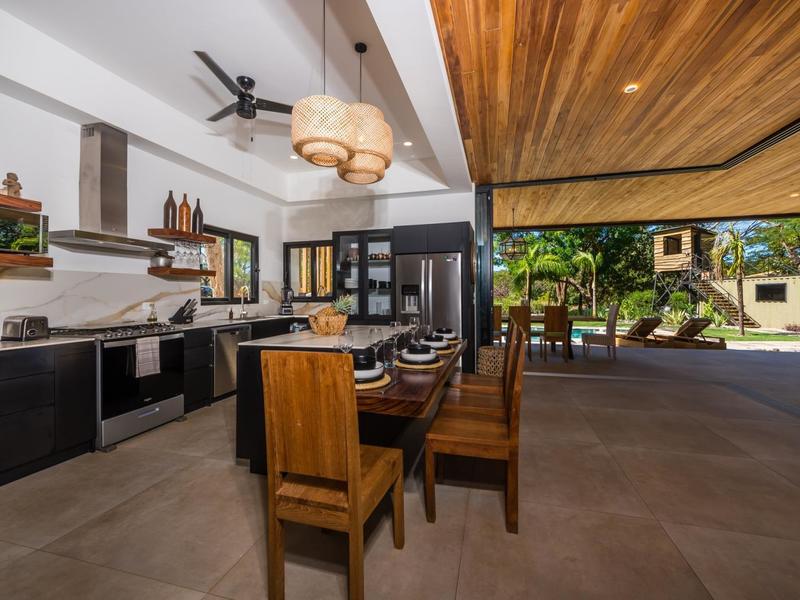 Villa Solo Noi is the epitome of Pura Vida living! Enter through a custom glass and black wrought iron door to a modern tropical Paradise! Window walls disappear, effectively erasing the line between indoor and outdoor spaces. Move from the cool, relaxing living room and modern kitchen straight to the patio with its own spacious living, dining, and kitchen areas. Back inside, large neutral porcelain floor tiles carry throughout this brand new 4000 sq ft home--making the transition between rooms seamless. Rooms are bright and white with black accents but softened by local hardwood ceilings and inset lighting. A feature of the kitchen is its black cabinetry and waterfall-edge marble island with an exotic Guanacaste wood dining table for seating.