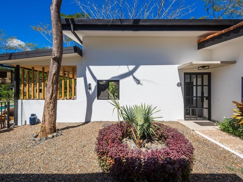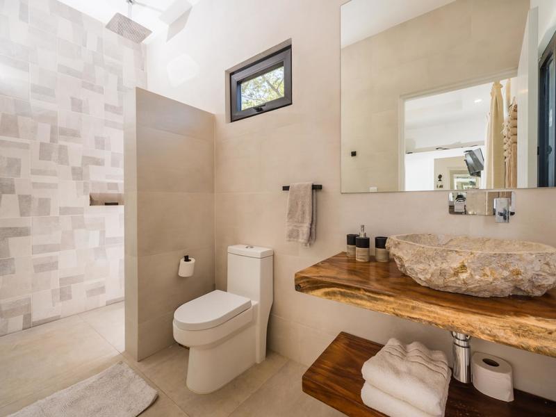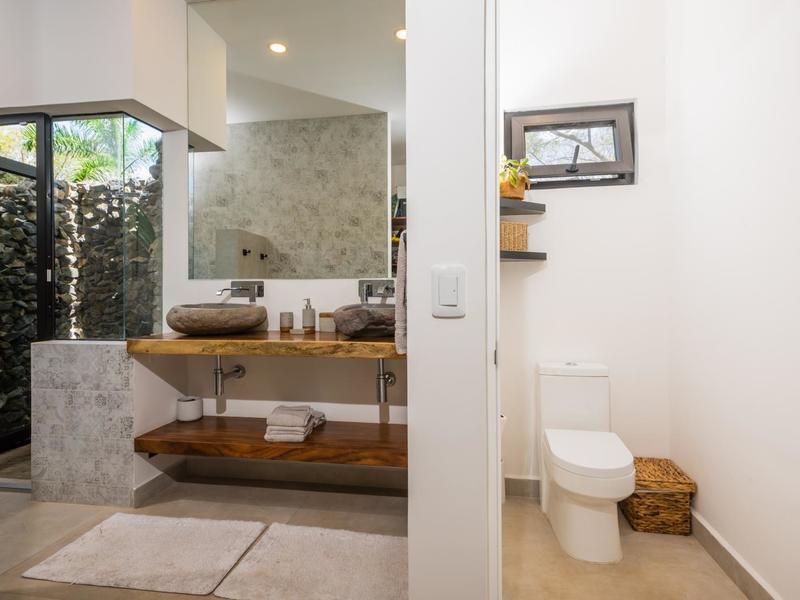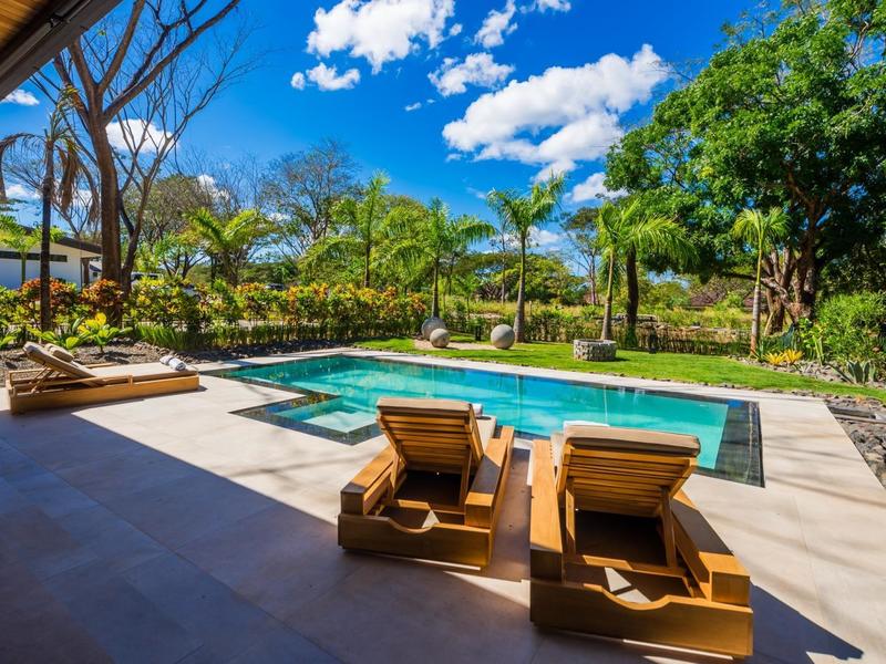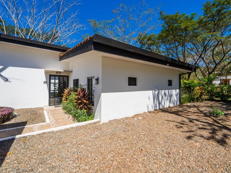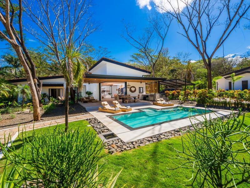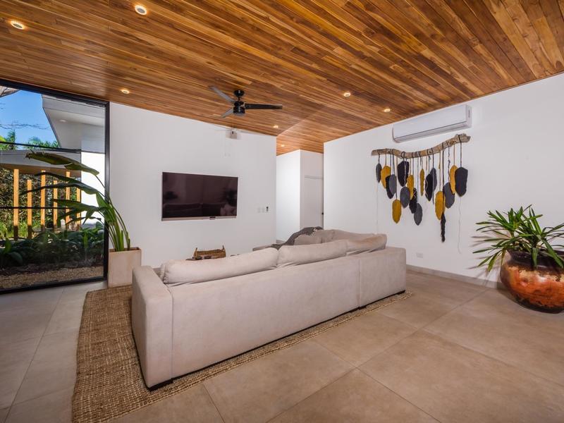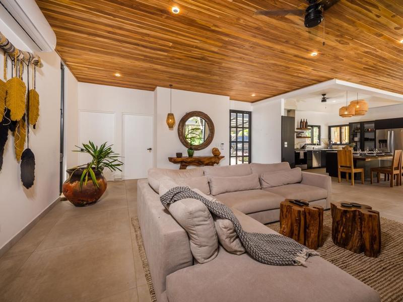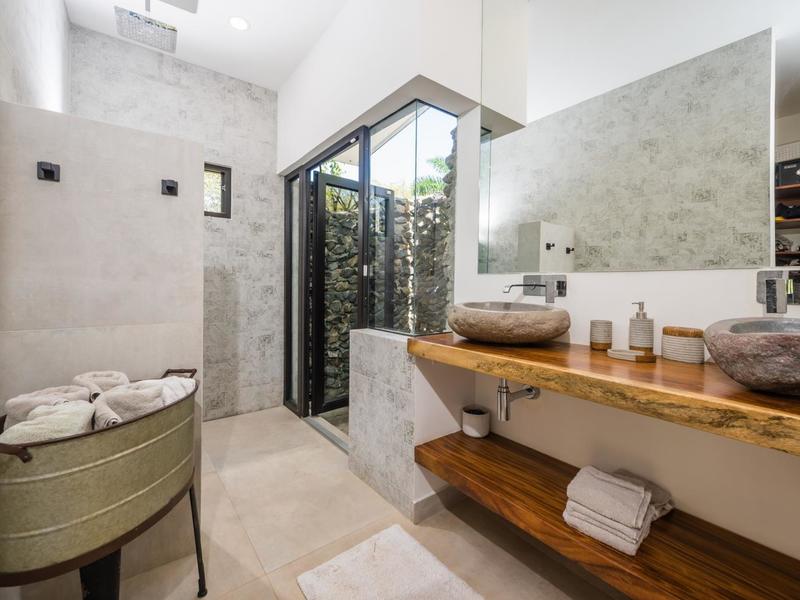 Villa Solo Noi is the epitome of Pura Vida living! Enter through a custom glass and black wrought iron door to a modern tropical Paradise! Window walls disappear, effectively erasing the line between indoor and outdoor spaces. Move from the cool, relaxing living room and modern kitchen straight to the patio with its own spacious living, dining, and kitchen areas. Back inside, large neutral porcelain floor tiles carry throughout this brand new 4000 sq ft home--making the transition between rooms seamless. Rooms are bright and white with black accents but softened by local hardwood ceilings and inset lighting. A feature of the kitchen is its black cabinetry and waterfall-edge marble island with an exotic Guanacaste wood dining table for seating.