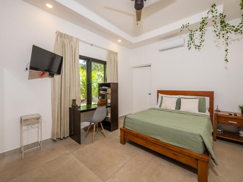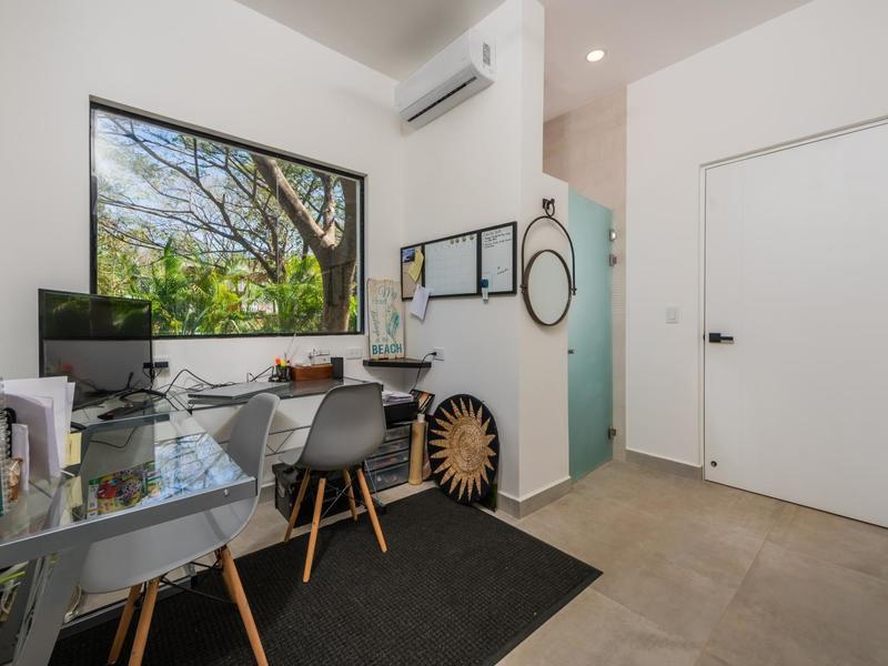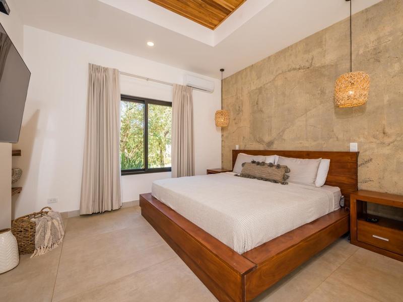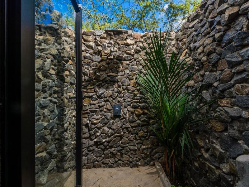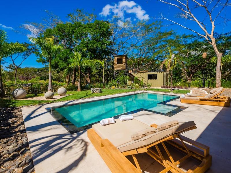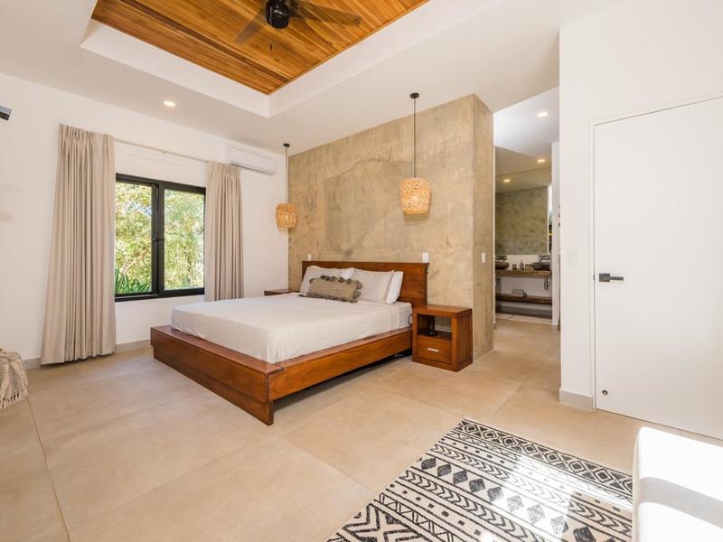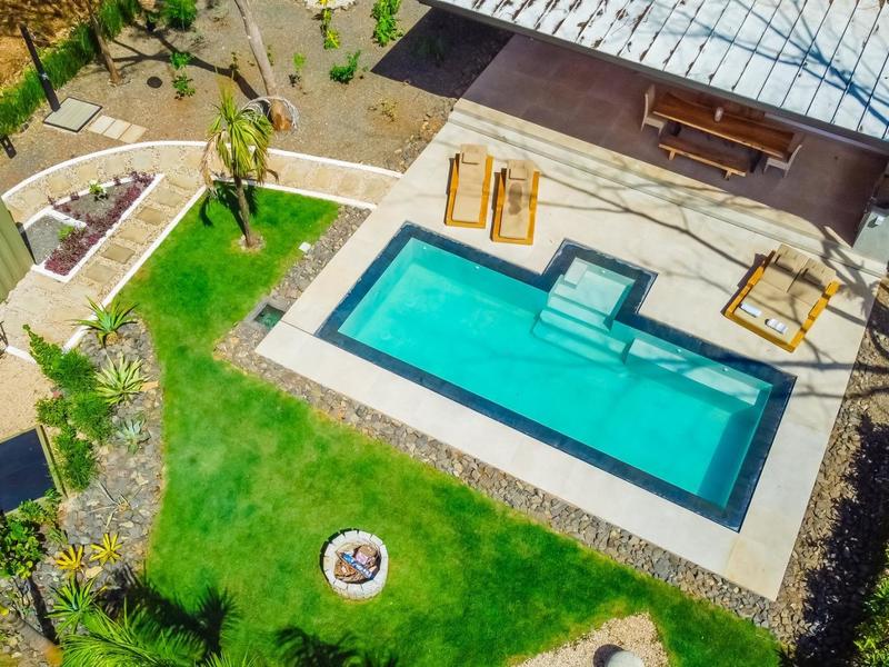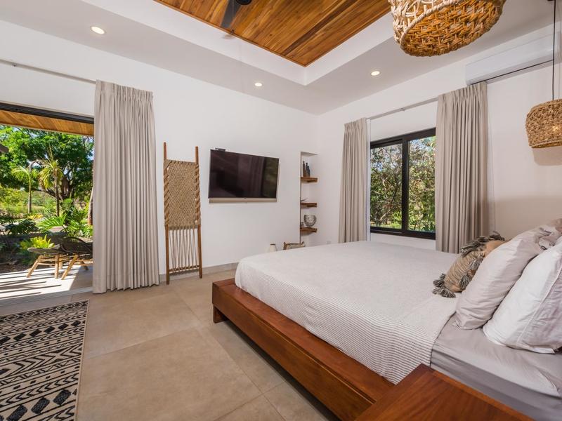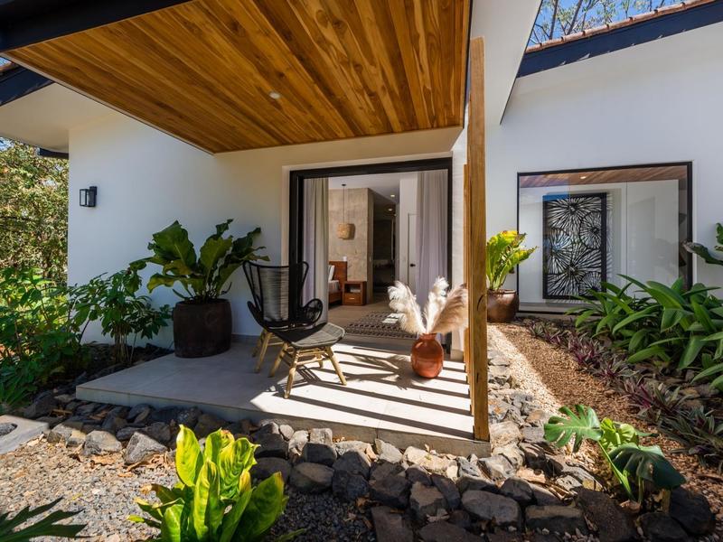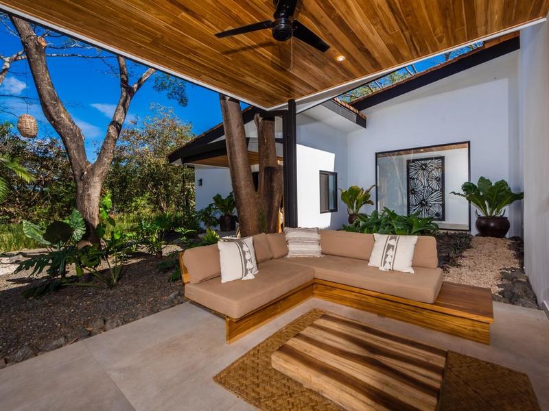 Villa Solo Noi is the epitome of Pura Vida living! Enter through a custom glass and black wrought iron door to a modern tropical Paradise! Window walls disappear, effectively erasing the line between indoor and outdoor spaces. Move from the cool, relaxing living room and modern kitchen straight to the patio with its own spacious living, dining, and kitchen areas. Back inside, large neutral porcelain floor tiles carry throughout this brand new 4000 sq ft home--making the transition between rooms seamless. Rooms are bright and white with black accents but softened by local hardwood ceilings and inset lighting. A feature of the kitchen is its black cabinetry and waterfall-edge marble island with an exotic Guanacaste wood dining table for seating.