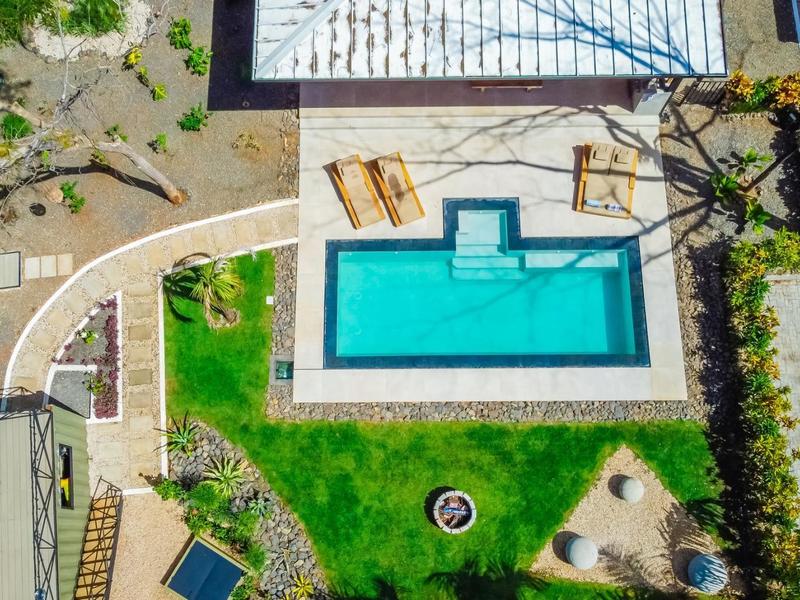 This home is set on almost half an acre of land, and the spacious yard is meticulously landscaped with grassy lawns, palm trees, and flowering hedges. The property has been set up with outdoor lighting to make for spectacular evenings. The large infinity pool is a turquoise gem with black edges set in a carpet of green—a perfect place to cool off or swim a few laps.
