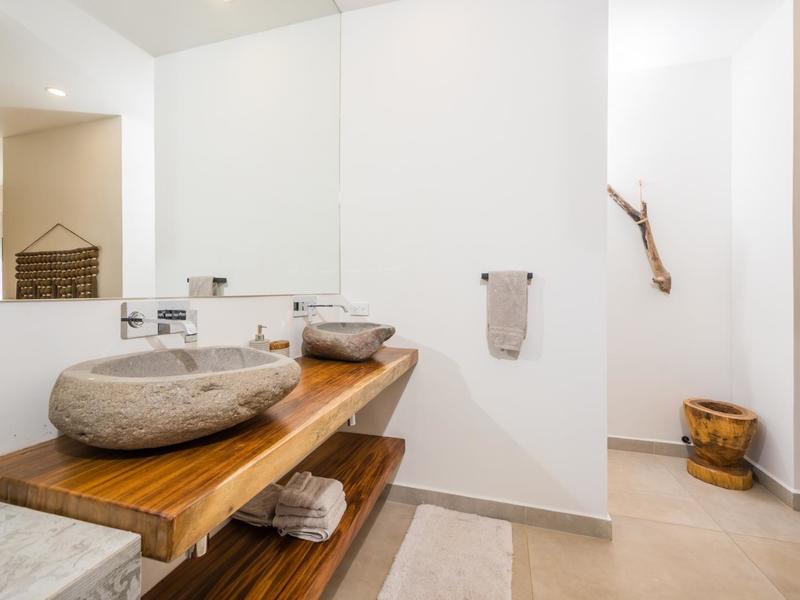 Down a glass-walled hallway with a gorgeous metal etched design piece, you will find the main bedroom with its neutral and natural finishes designed to give you hours of rest and relaxation. Behind the king bed is a wall of etched concrete. This bedroom has patio doors with its own terrace to enjoy the outdoors. The private bathroom has 2 stone sinks set on a live-edge wood vanity and a fantastic indoor/outdoor shower. There are 2 more bedrooms—each with large closets and their own ensuite bathrooms. These bathrooms also feature stone sinks, wood vanities, and walk-in showers. In case you find you have to work, the 4th bedroom is being used as an office with a beautiful view and also has its own ensuite bathroom.