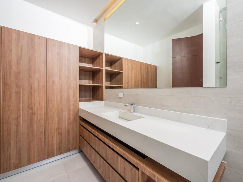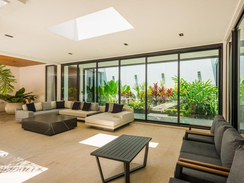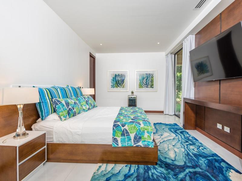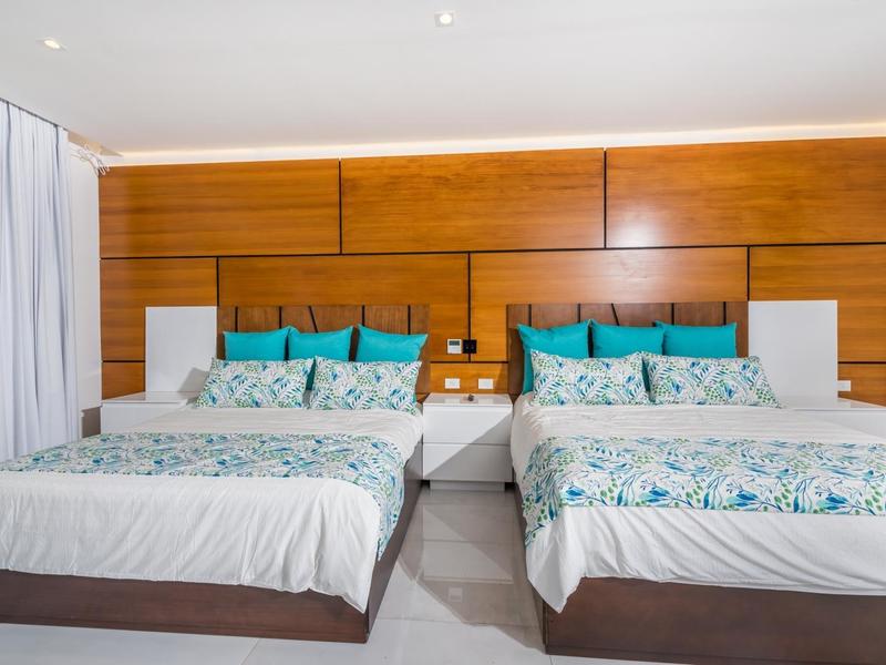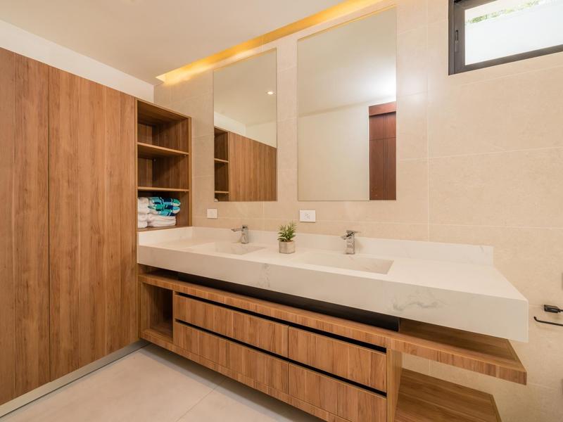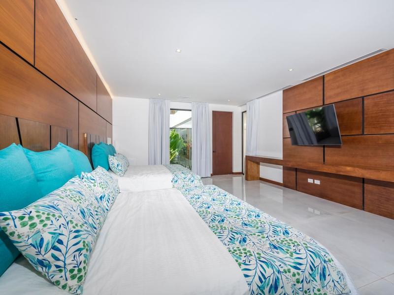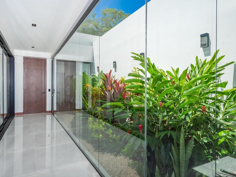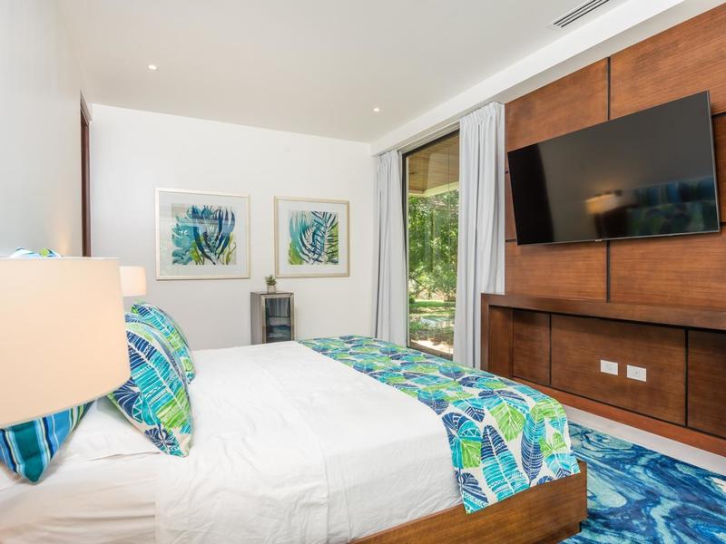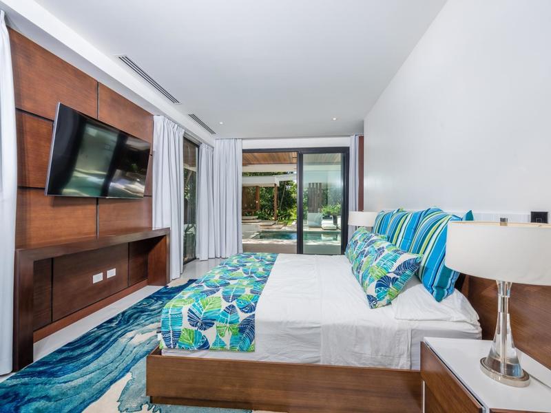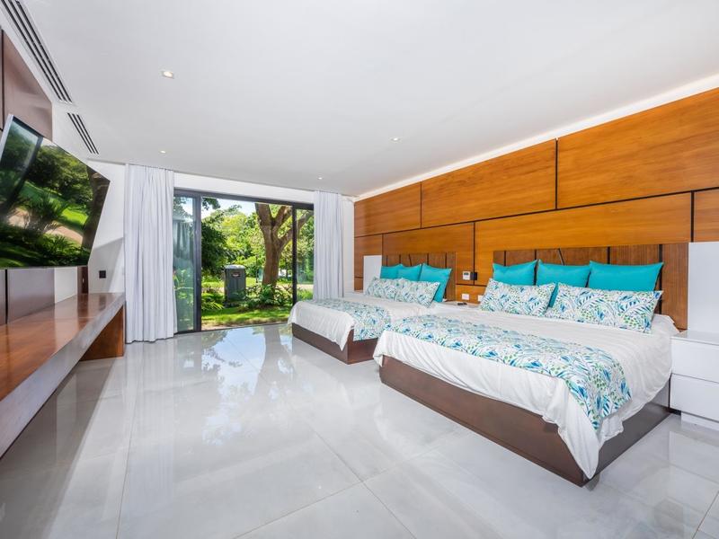 As you stroll down the hallway to the ground-floor guest room, floor-to-ceiling glass provides a captivating view of the lush tropical garden, blurring the line between interior and exterior. At the end of that hallway, you will find an oversized bedroom with 2 King Beds, a long teak desk, and wood wall features. This bedroom offers an ensuite bathroom with closets that light up and an outdoor shower with a large rain shower head.