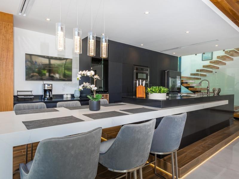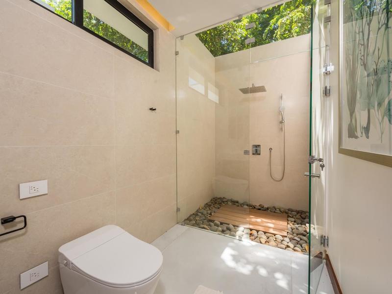 Going up the floating teak staircase and glass railings you arrive at the second floor which offers a second master suite, an additional guest suite, a half bath, and a gorgeous office which overlooks the living room through a glass and TV den area. The master suite has its own balcony for intimate moments and the ensuite belongs in a magazine! There you will find a top of the line Hans Gro shower with a skylight and teak walls, an outdoor shower, and an outdoor bathtub at the tree tops to be eye level with the birds or to unwind under the stars.