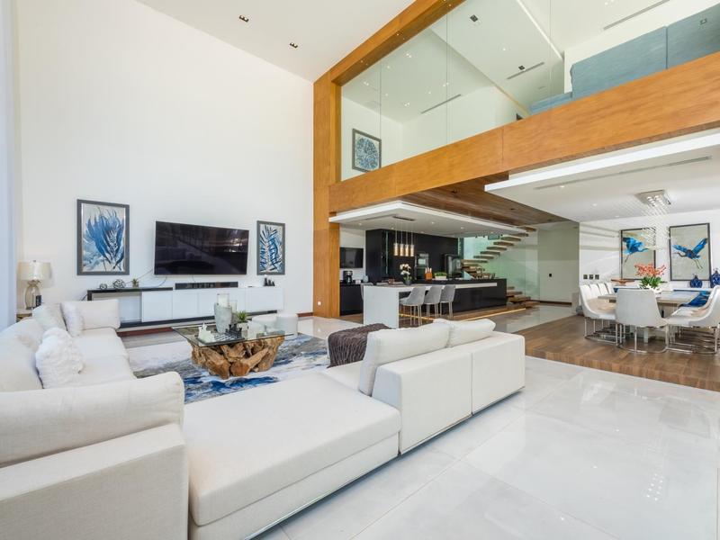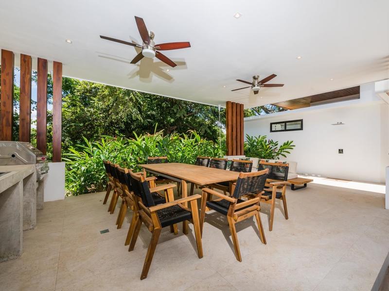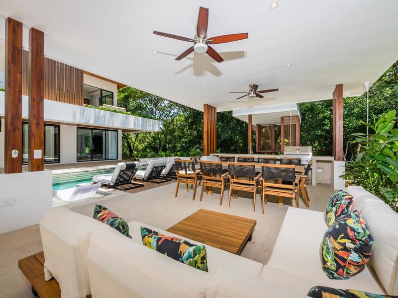 As you step inside the 12-foot custom teak swing door, you'll be immediately captivated by the grandeur of the double-high, 24-foot living room. Here, a custom-designed couch comfortably seats 18 people, setting the stage for gatherings and entertaining on a grand scale. The raised dining room boasts a dazzling crystal light fixture and floor lighting, creating an ambiance that's perfect for intimate dinners and special occasions. Here you will also find patio doors in the living room that open to an oversized terrace area. This is perfect for fresh air dining and soaking up the delicious Costa Rican air!