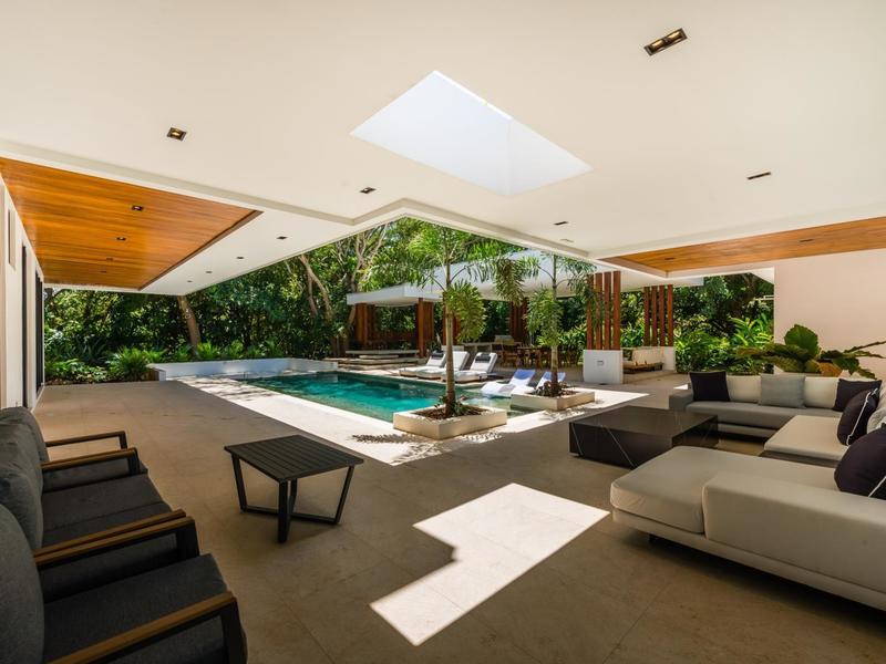 The outdoor living space is an oasis of relaxation, featuring Panama Jack teak furniture, a custom outdoor sectional with a marble coffee table, and three custom chaise lounges, all adorned in Sunbrella fabric. The covered outdoor living room offers a skylight to let in the sun, an outdoor dining area with a large table and BBQ, and Ranchito which is a great spot to curl up to read a book or bird watch as the parrots and bluejays fly by.